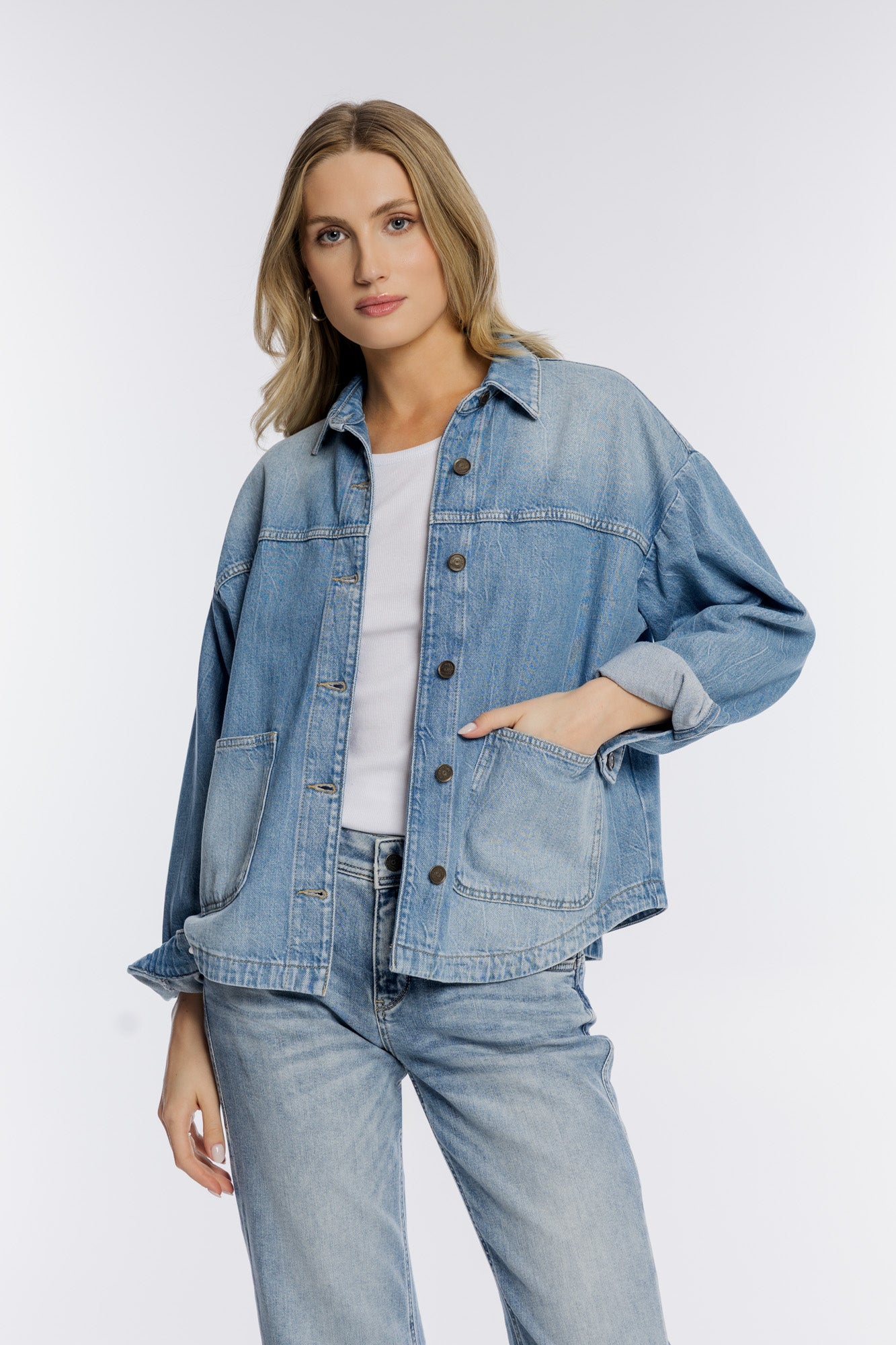 zarówno w casualowe stylizacje, jak i bardziej dopracowane, kobiece zestawy. Kurtka denim czy koszula mogą być noszone solo lub w modnym total looku denim, tworząc spójną i nowoczesną stylizację.