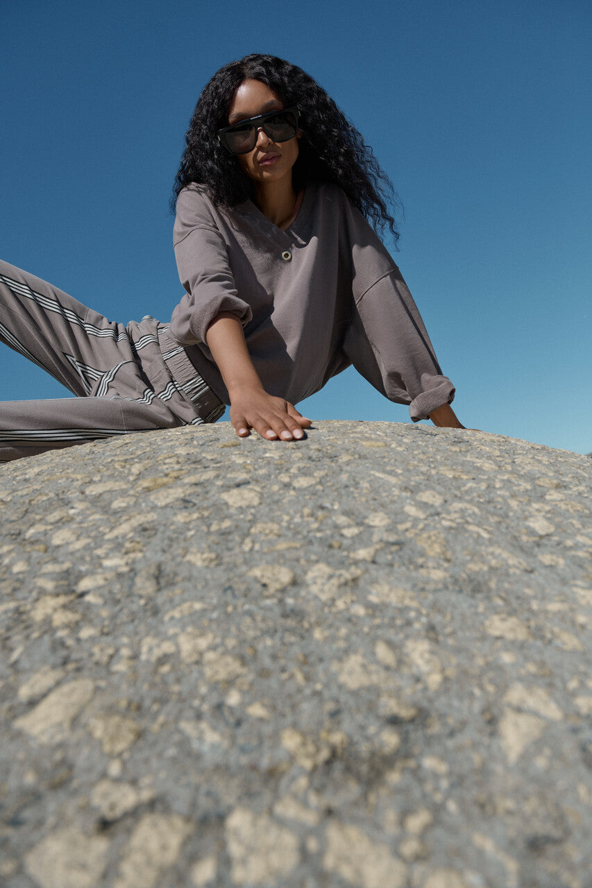 Spokojną paletę kolorów przełamuje intensywny odcień mango – soczysta żółć, która wnosi do kolekcji energię i wiosenną świeżość. Kolor ten pojawia się m.in. w topach, cienkich swetrach, oversize’owych bluzach, t-shirtach oraz czapkach. Dzięki temu można wprowadzić go do stylizacji zarówno jako wyrazisty element, jak i subtelny akcent zestawiony z neutralnymi kolorami.
