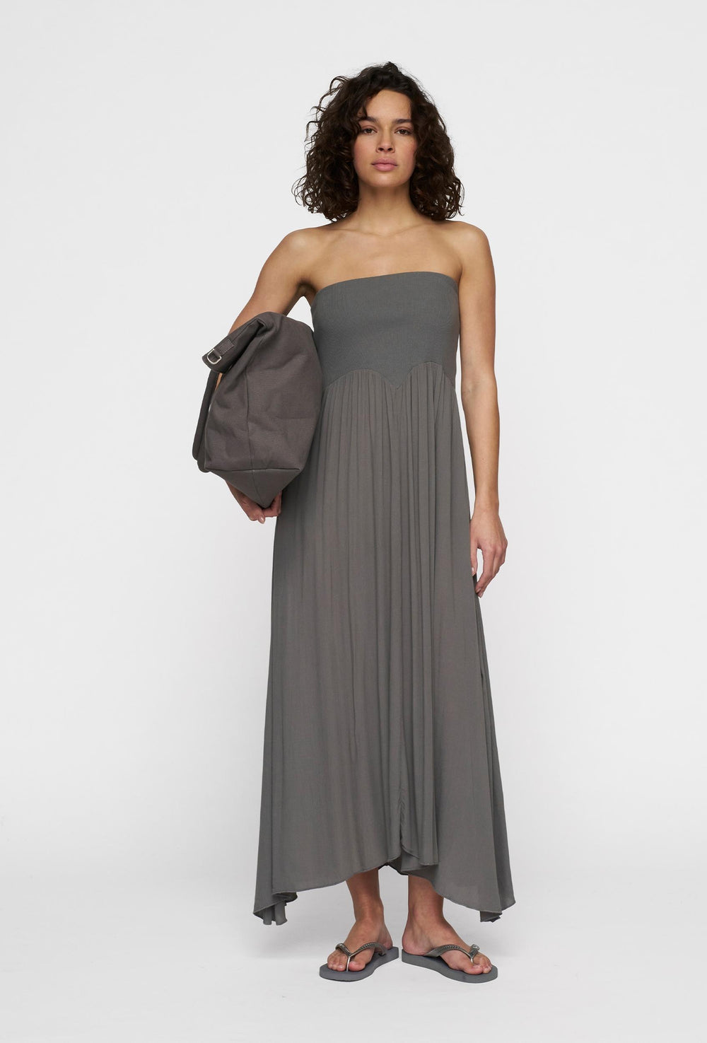 Długa sukienka w szarym kolorze z marszczonym rękawem