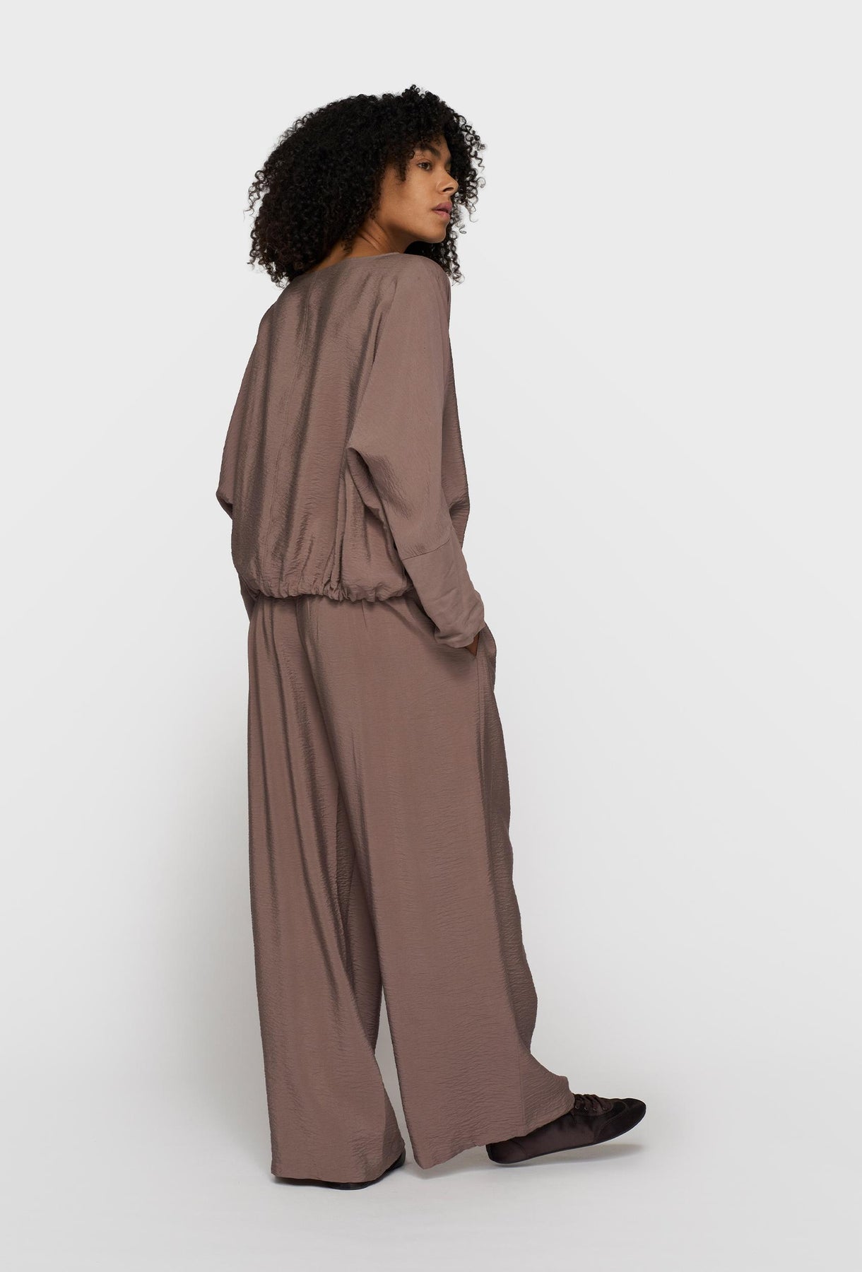 Eleganckie spodnie typu culotte w kolorze taupe to połączenie minimalistycznej formy i subtelnego połysku. Wykonane z lekkiego, delikatnie lejącego materiału, pięknie układają się w ruchu, nadając stylizacji wyjątkowej lekkości i klasy. Wysoki, szeroki pas modeluje talię i zapewnia komfort noszenia, a marszczenia w górnej części dodają objętości oraz kobiecego charakteru. Szerokie nogawki tworzą efekt płynnej sylwetki, który sprawdzi się zarówno na co dzień, jak i podczas bardziej eleganckich okazji. To uniwersalny model, który z łatwością dopasujesz do różnych stylizacji – od casualowych zestawów z prostym topem po bardziej wyrafinowane połączenia z koszulą czy dopasowaną marynarką.