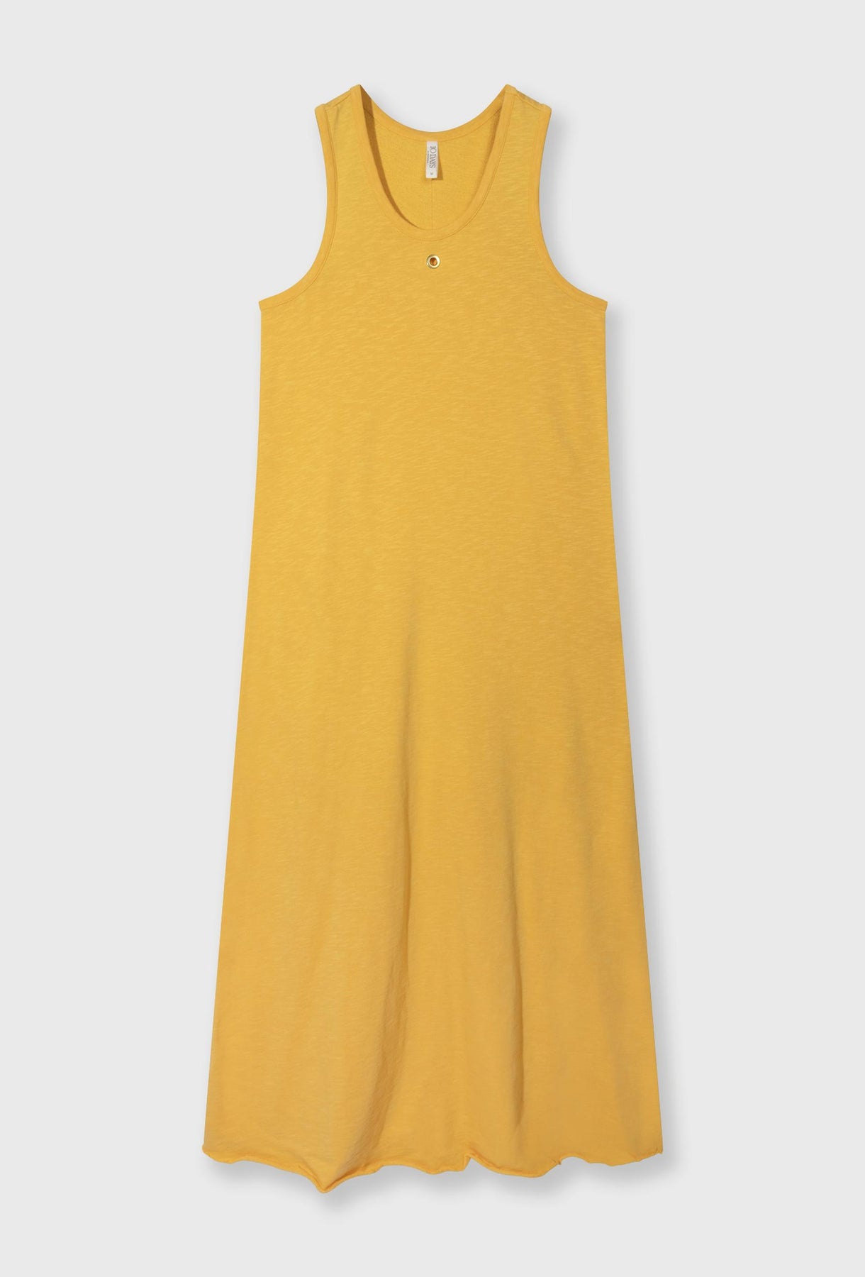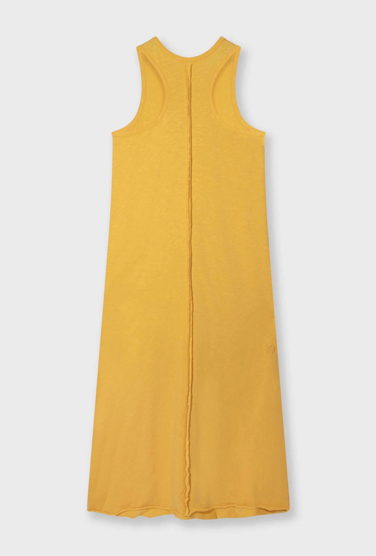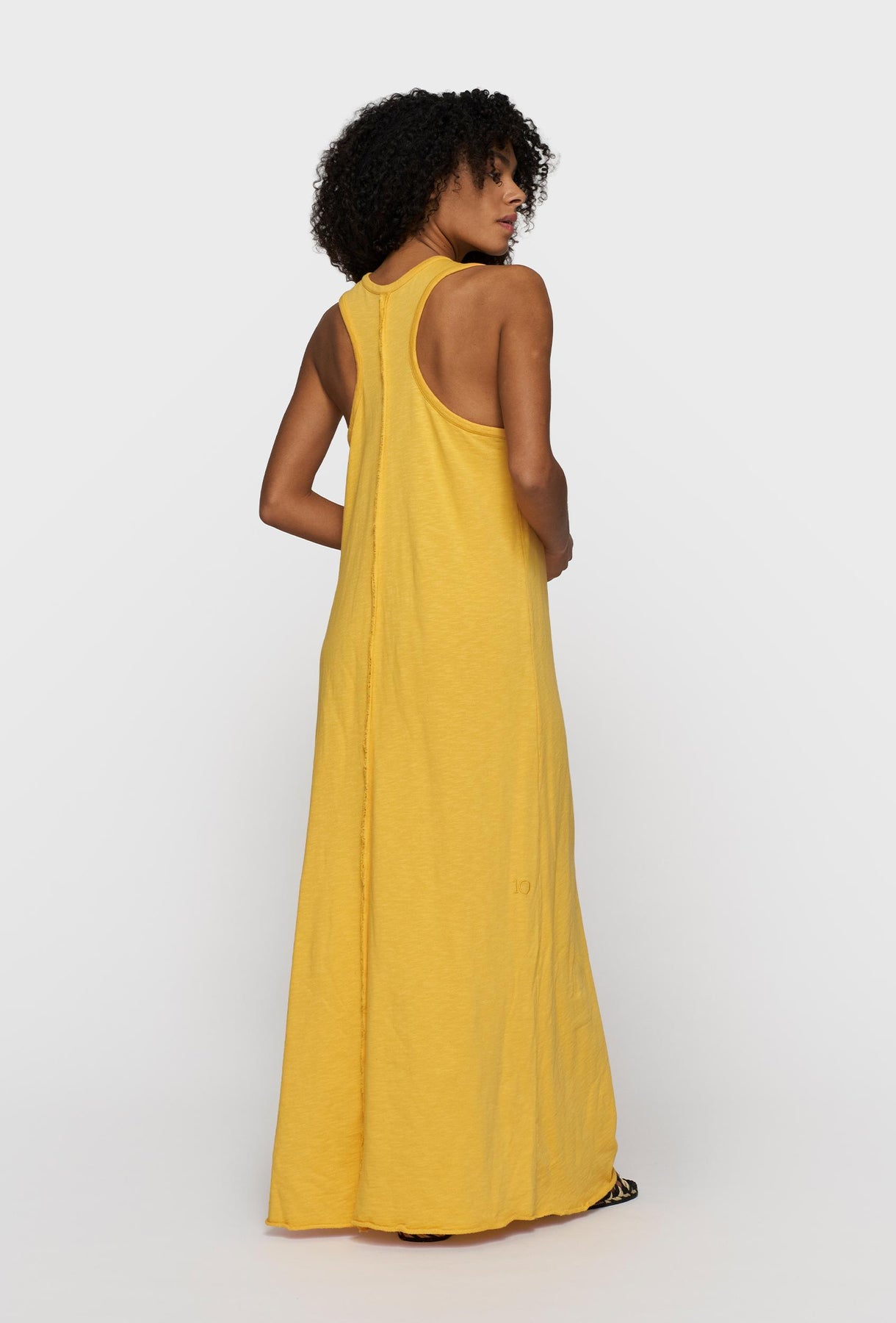 Długa sukienka maxi w energetycznym odcieniu słonecznej żółci to idealna propozycja na ciepłe dni. Wykonana z miękkiej, lekkiej dzianiny o subtelnej strukturze, zapewnia maksymalny komfort noszenia i swobodny, naturalny ruch. Fason typu tank z głębiej wyciętymi ramionami i zaokrąglonym dekoltem nadaje jej sportowo-lekki charakter. Prosta, lekko rozszerzana linia pięknie układa się na sylwetce, wydłużając ją i podkreślając jej proporcje. Subtelny detal z przodu dodaje całości minimalistycznego wyrazu. To uniwersalna sukienka, która sprawdzi się zarówno w codziennych stylizacjach, jak i podczas wakacyjnych wyjazdów – wystarczy dobrać sandały lub sneakersy, by stworzyć effortless look.