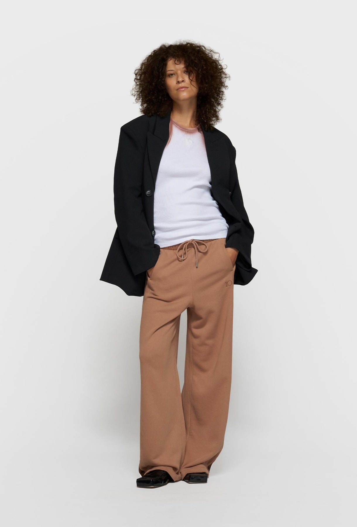 Minimalistyczny top o dopasowanym kroju, wykonany z miękkiej, elastycznej dzianiny prążkowanej, która komfortowo układa się na sylwetce. Klasyczny fason typu racer z delikatnie zabudowanym dekoltem podkreśla ramiona i nadaje całości sportowo-miejskiego charakteru. Kontrastowe lamówki w ciepłym odcieniu beżu stanowią subtelny akcent kolorystyczny, a drobny detal brandingowy z przodu dopełnia całość w nowoczesnym, minimalistycznym stylu. Top doskonale sprawdzi się jako baza do codziennych stylizacji — zarówno w zestawie z dresowymi spodniami, jak i pod marynarką czy koszulą.