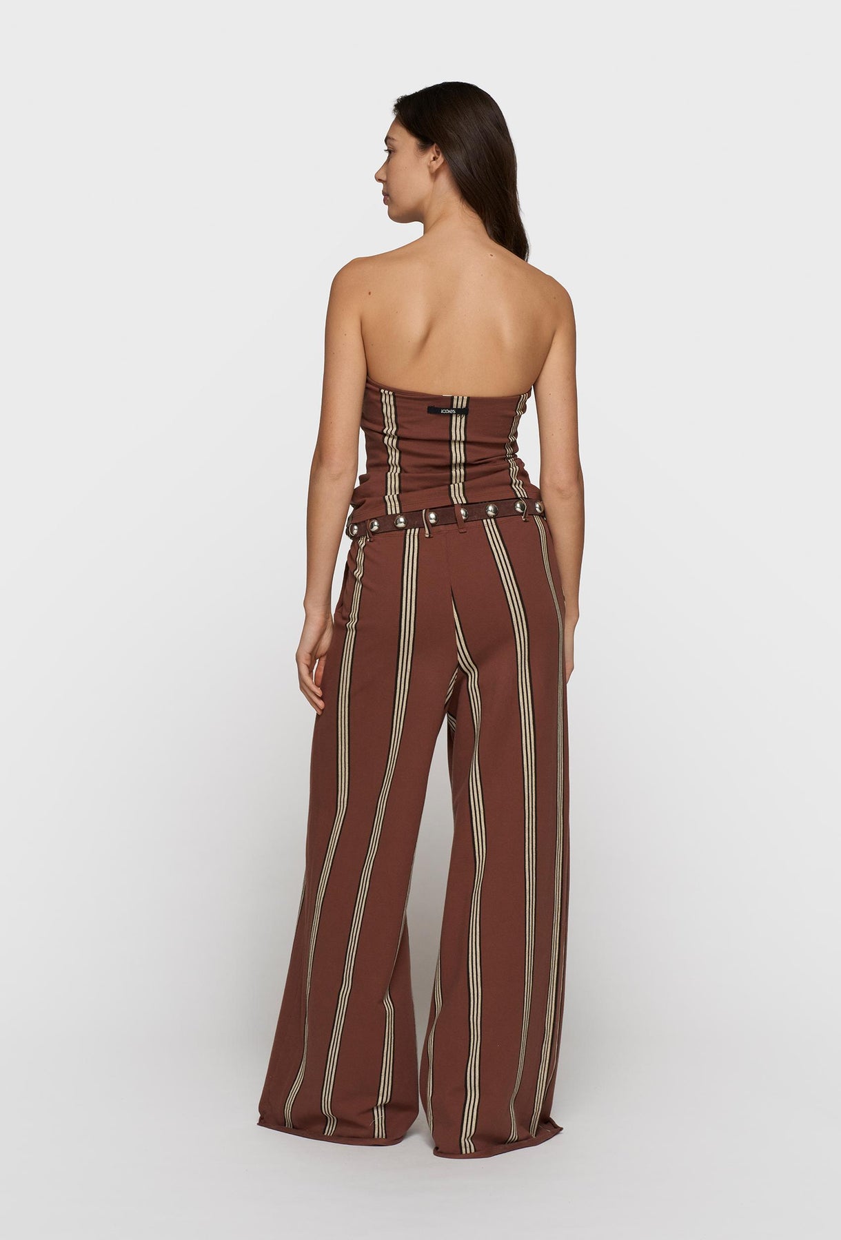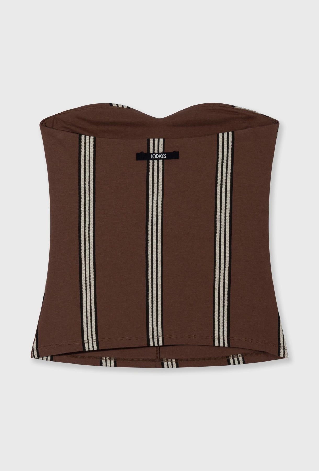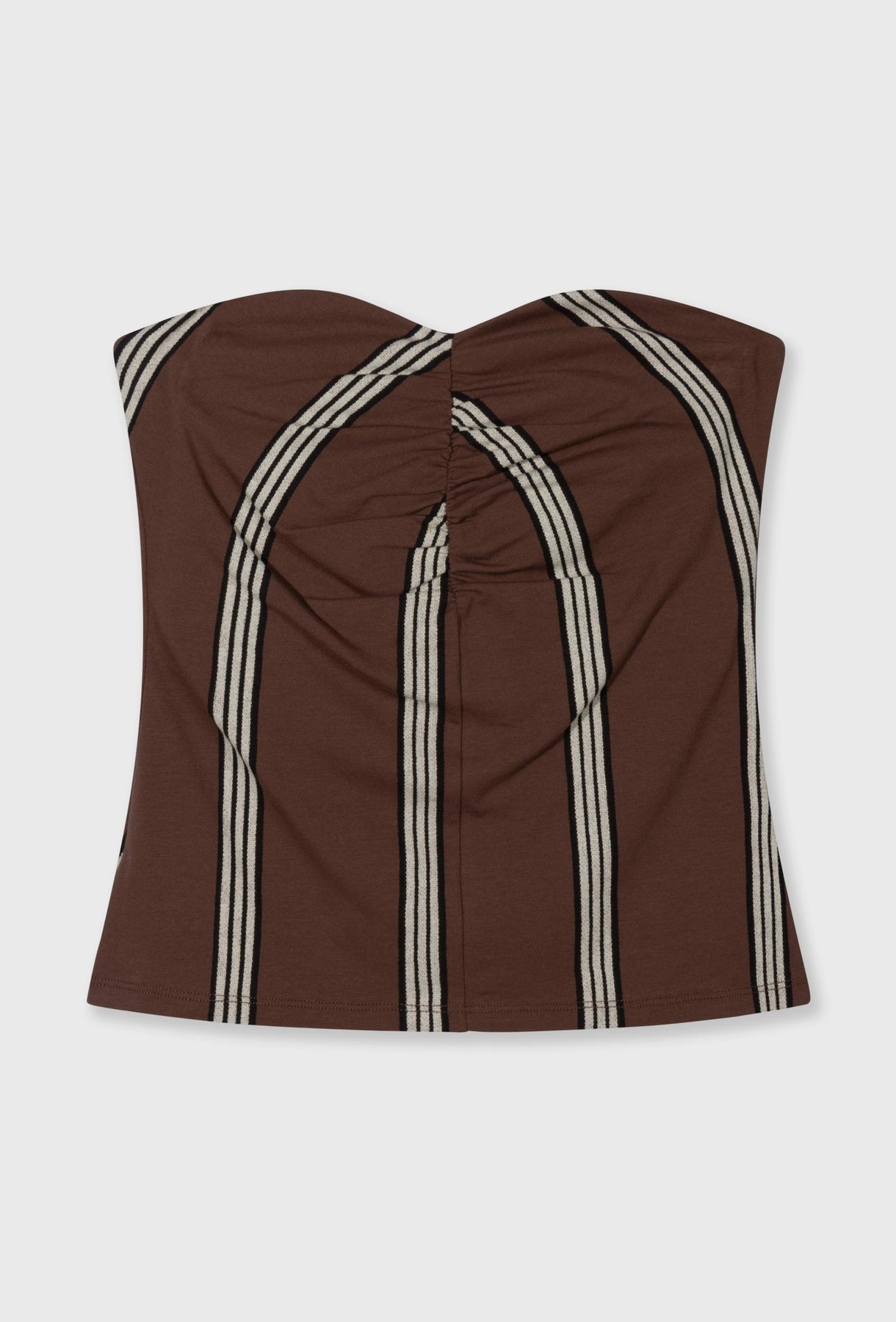 Dopasowany top bandeau w głębokim, czekoladowym odcieniu z kontrastowym, pionowym paskiem, który podkreśla sylwetkę i dodaje całości wyrazistego charakteru. Wykonany z elastycznej, miękkiej tkaniny, idealnie dopasowuje się do ciała, zapewniając komfort i swobodę ruchów. Marszczenie na środku subtelnie modeluje biust i nadaje formie dynamicznego wyrazu, a bezramienna konstrukcja eksponuje ramiona, tworząc nowoczesny, letni look. Świetnie sprawdzi się w komplecie ze spodniami lub spódnicą z tej samej tkaniny, ale równie dobrze zagra jako statement piece w minimalistycznych stylizacjach – od casualowych po bardziej wieczorowe.