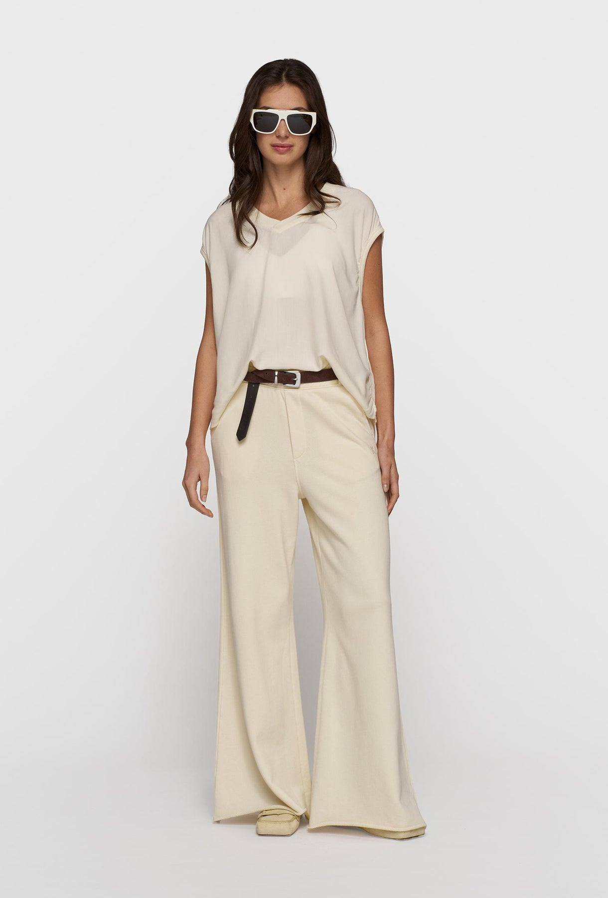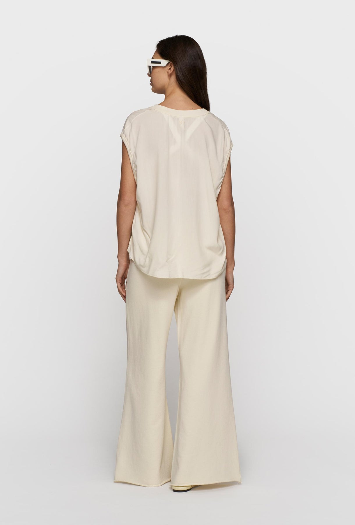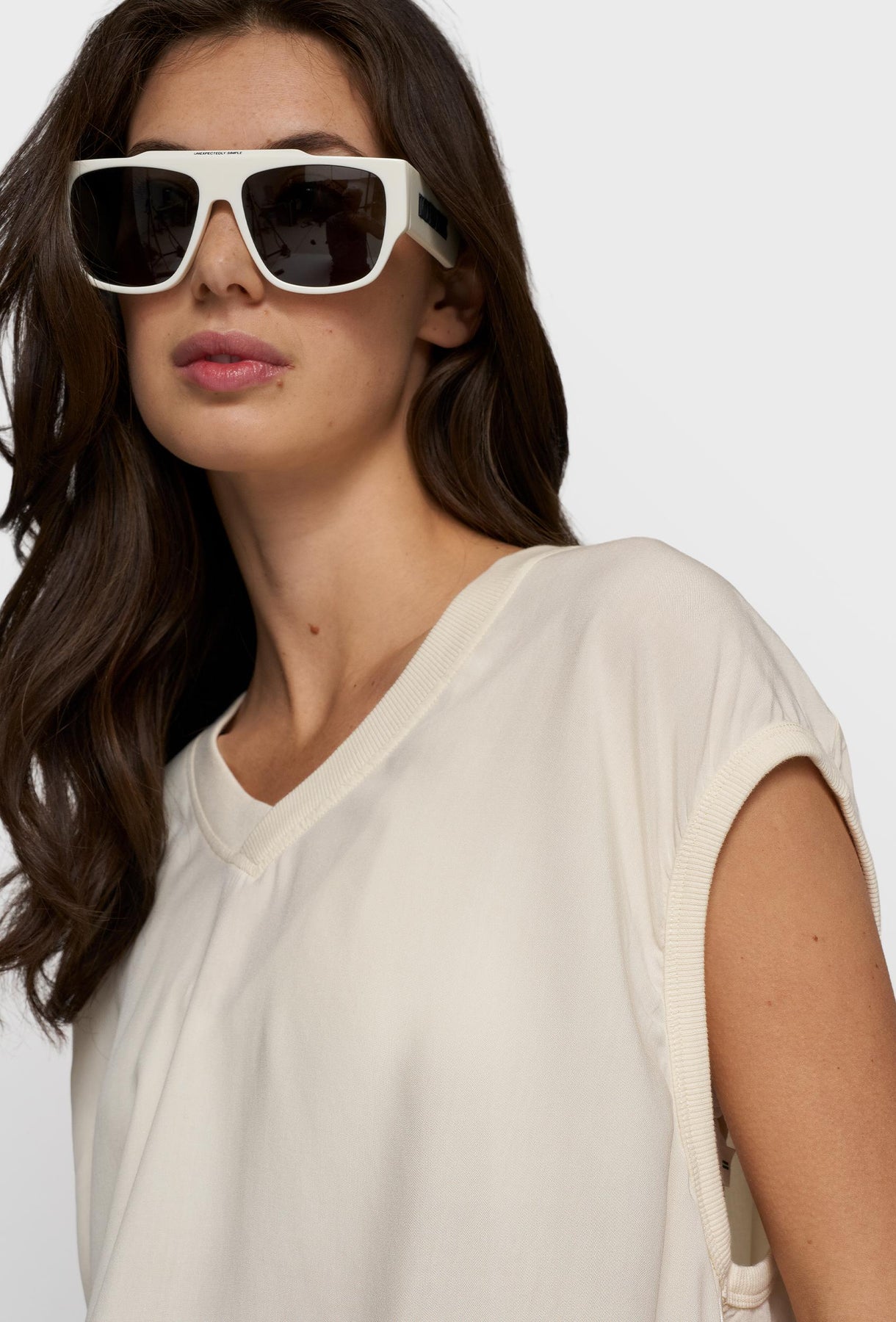 Lekki, oversize’owy top w kolorze ecru, który łączy minimalizm z subtelną elegancją. Wykonany z miękkiej, przewiewnej tkaniny, delikatnie układa się na sylwetce, zapewniając komfort przez cały dzień. Luźny fason z krótkim rękawem i obniżoną linią ramion nadaje całości swobodnego charakteru, a dekolt w kształcie litery V optycznie wydłuża szyję i dodaje lekkości stylizacji. To uniwersalna baza garderoby – idealna zarówno do casualowych zestawów z szerokimi spodniami, jak i bardziej dopracowanych, minimalistycznych looków.