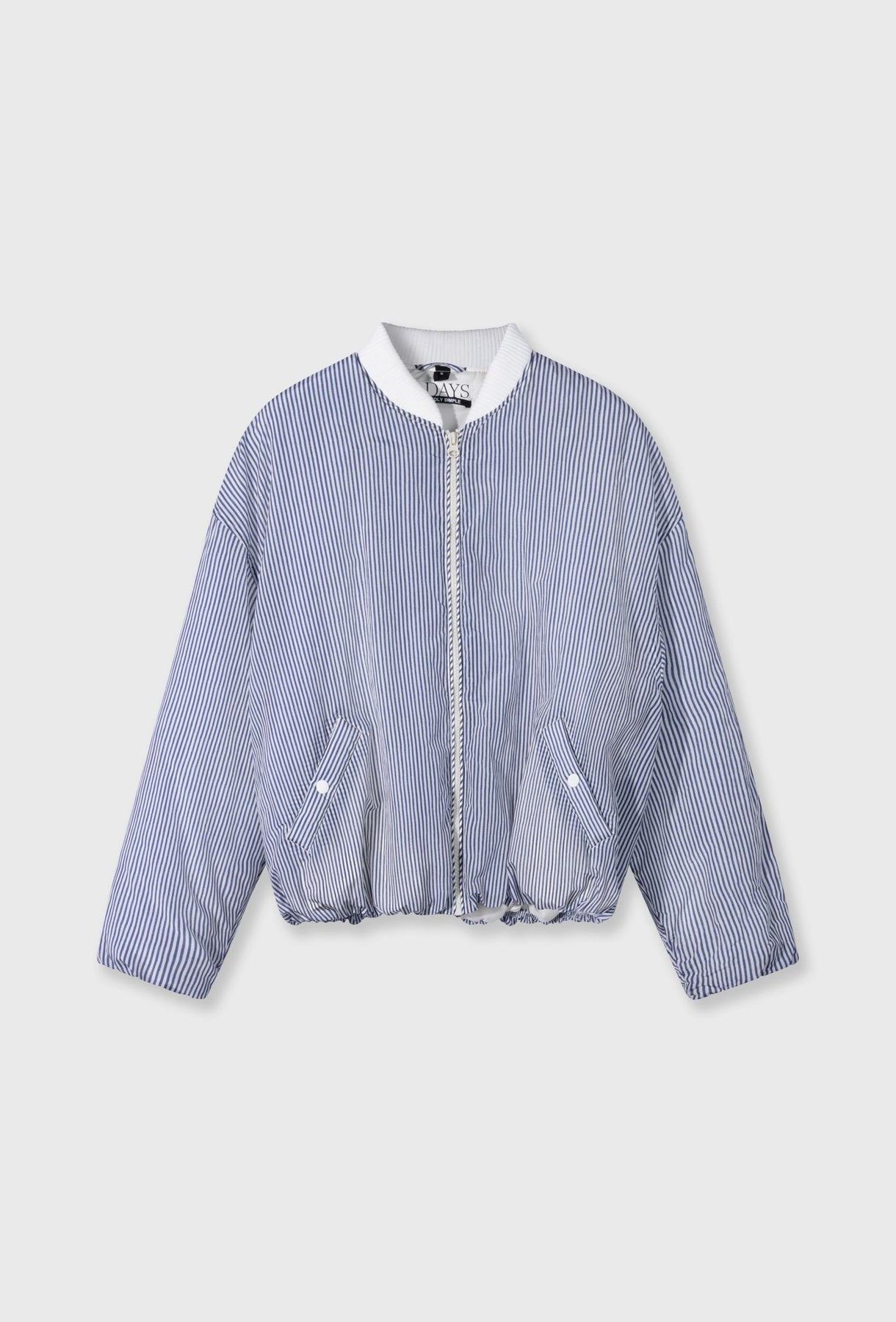 Lekka, krótka kurtka typu bomber o nowoczesnym, swobodnym kroju. Wykonana z miękkiej, bawełnianej tkaniny w klasyczne niebiesko-białe paski, łączy casualowy charakter z dopracowanymi detalami. Model zapinany na zamek, z elastycznym ściągaczem u dołu oraz przy mankietach, co nadaje sylwetce lekko sportowy wygląd. Stójka wykończona dzianiną zapewnia komfort noszenia i subtelny kontrast materiałów. Z przodu praktyczne kieszenie zapinane na napy, a na plecach delikatna naszywka z logo podkreślająca minimalistyczny styl. Idealna do codziennych stylizacji – świetnie komponuje się zarówno z dresami, jak i bardziej eleganckimi spodniami.