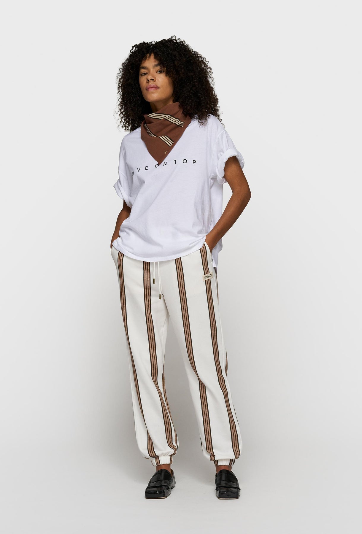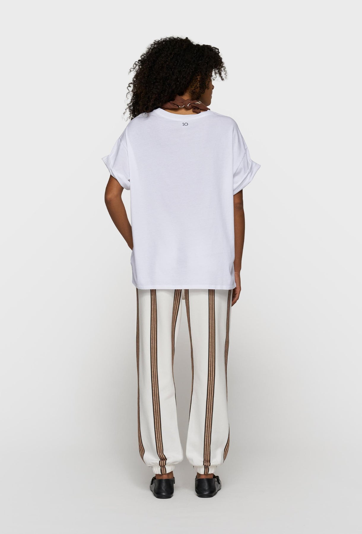 Klasyczny T-shirt w nowoczesnym, oversize’owym wydaniu, wykonany z miękkiej, przyjemnej w dotyku bawełny. Czysta, biała baza została przełamana subtelnym napisem “LOVE ON TOP”, który dodaje całości lekkiego, pozytywnego charakteru. Luźny krój z opadającą linią ramion i podwiniętymi rękawami zapewnia swobodę noszenia i casualowy look. Minimalistyczna forma sprawia, że T-shirt świetnie wpisuje się w codzienną garderobę, stanowiąc uniwersalny element wielu stylizacji. Idealny do zestawów z szerokimi spodniami, jeansami czy pod marynarkę – dla efektu effortless chic.
