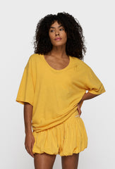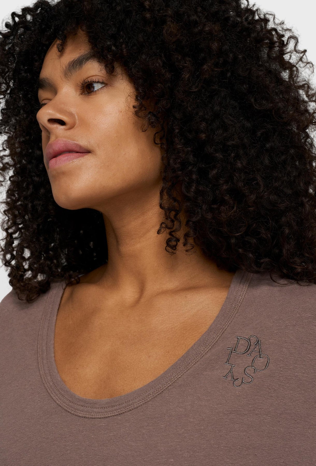 Minimalistyczny T-shirt w eleganckim odcieniu taupe, który łączy prostotę z nowoczesnym wyczuciem stylu. Wykonany z miękkiej, przyjemnej dla skóry dzianiny, zapewnia komfort noszenia i naturalne dopasowanie do sylwetki. Luźny, relaxed fit z lekko wydłużonym rękawem oraz szerokim, zaokrąglonym dekoltem (scoop neck) nadaje całości swobodnego, niewymuszonego charakteru. Subtelne logo umieszczone na piersi stanowi dyskretny akcent brandingowy. Idealny jako baza codziennych stylizacji – świetnie komponuje się zarówno z casualowymi spodniami, jak i bardziej eleganckimi elementami garderoby, tworząc nowoczesny, stonowany look.