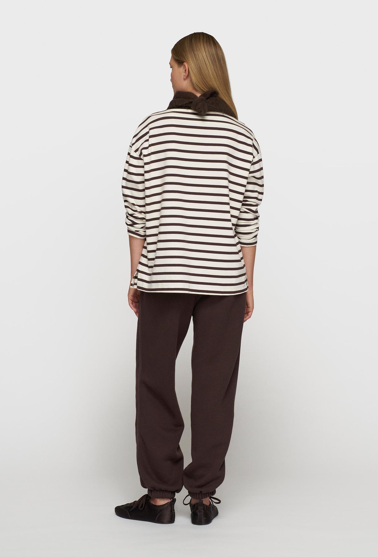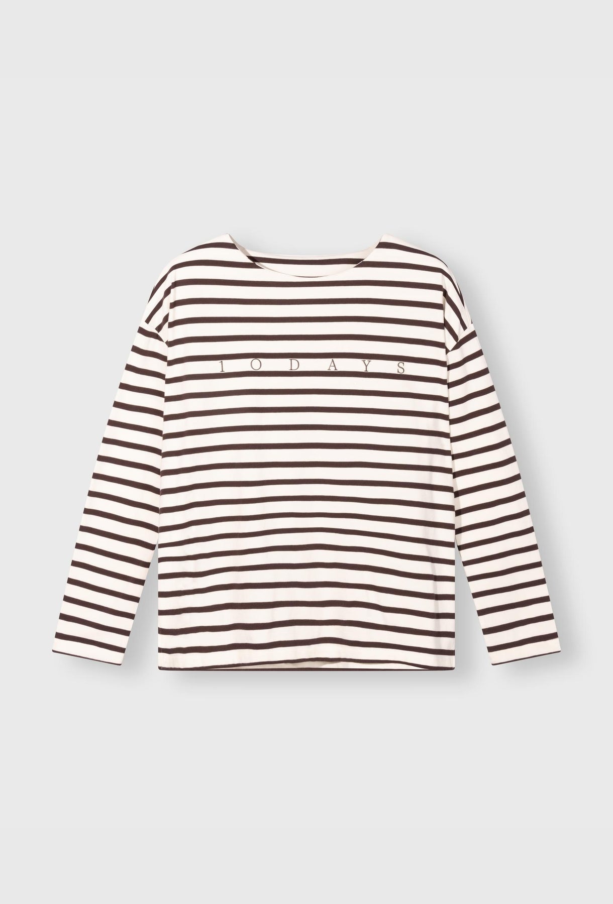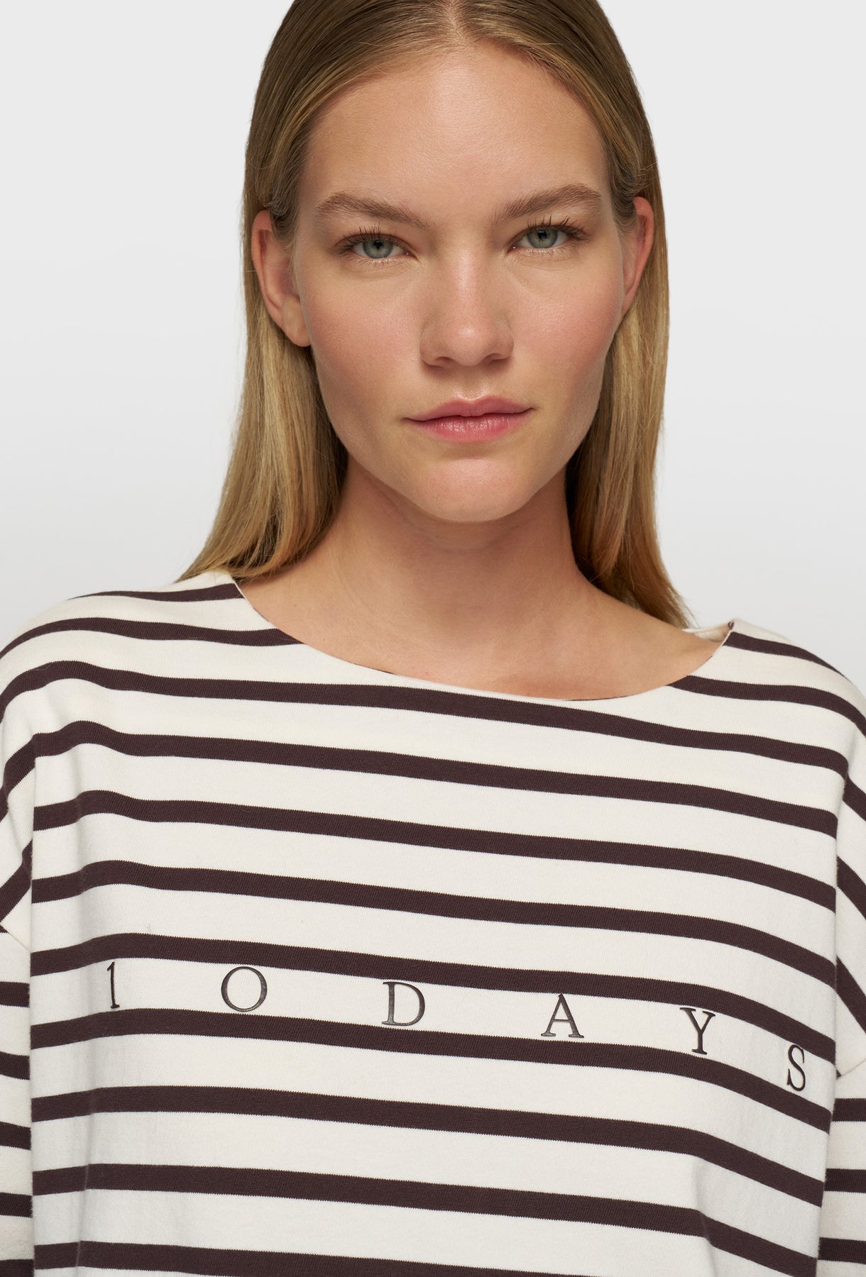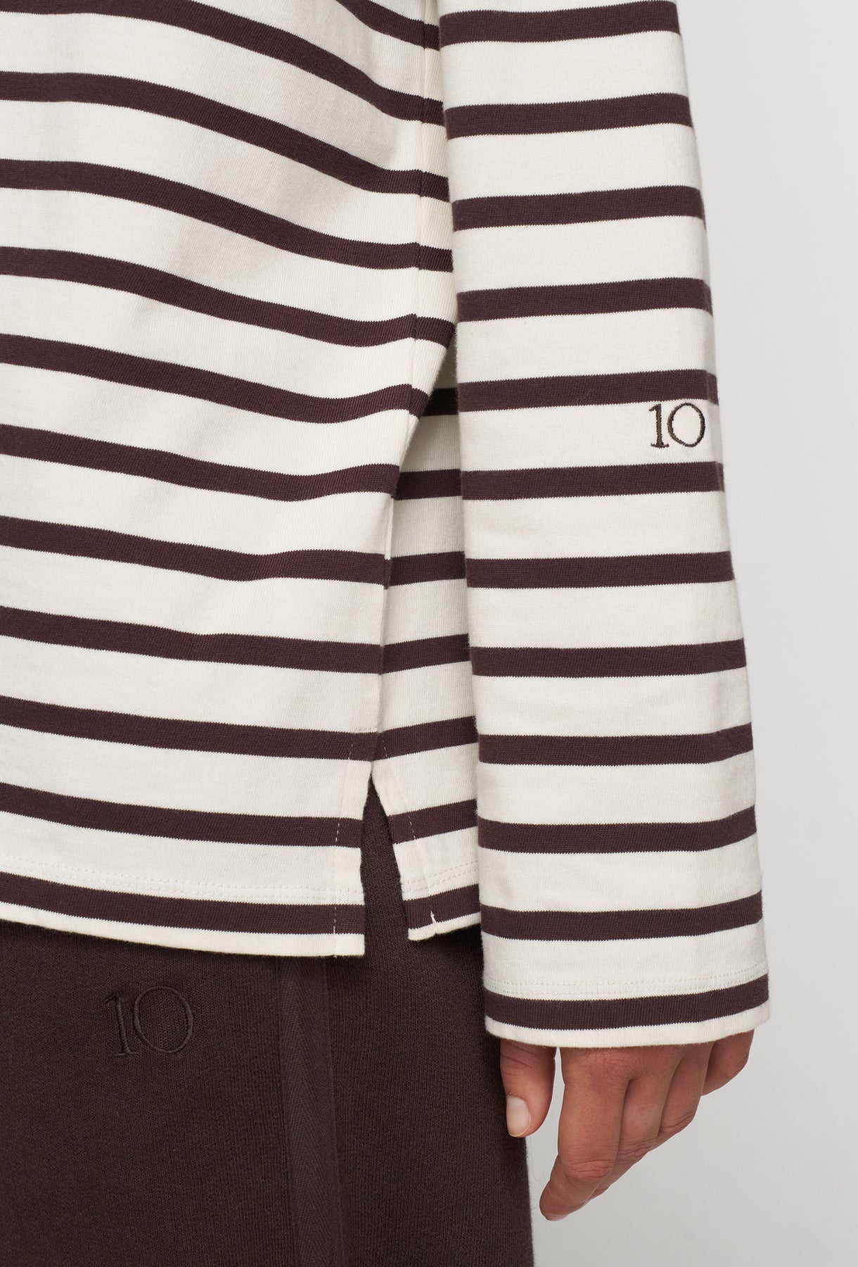 Klasyczna koszulka z długim rękawem w swobodnym, oversizowym kroju stanowi esencję ponadczasowego, marynistycznego stylu. Wykonana z miękkiego, wysokiej jakości materiału, zapewnia całodzienny komfort. Wzór tworzą poziome paski w harmonijnym połączeniu kremowej bieli i głębokiego ciemnego brązu (koloru kawy). Model posiada okrągły dekolt typu łódka, który delikatnie eksponuje obojczyki. Luźne rękawy zakończono prostym mankietem, a dół koszulki charakteryzują niewielkie boczne rozcięcia, które ułatwiają swobodne układanie się materiału. Subtelnym, ale eleganckim detalem jest delikatny haft na środku klatki piersiowej. Koszulka doskonale sprawdzi się jako baza do stylizacji casualowych i jako element warstwowy pod marynarkę czy sweter.