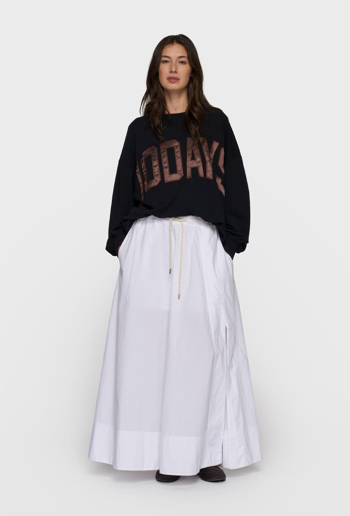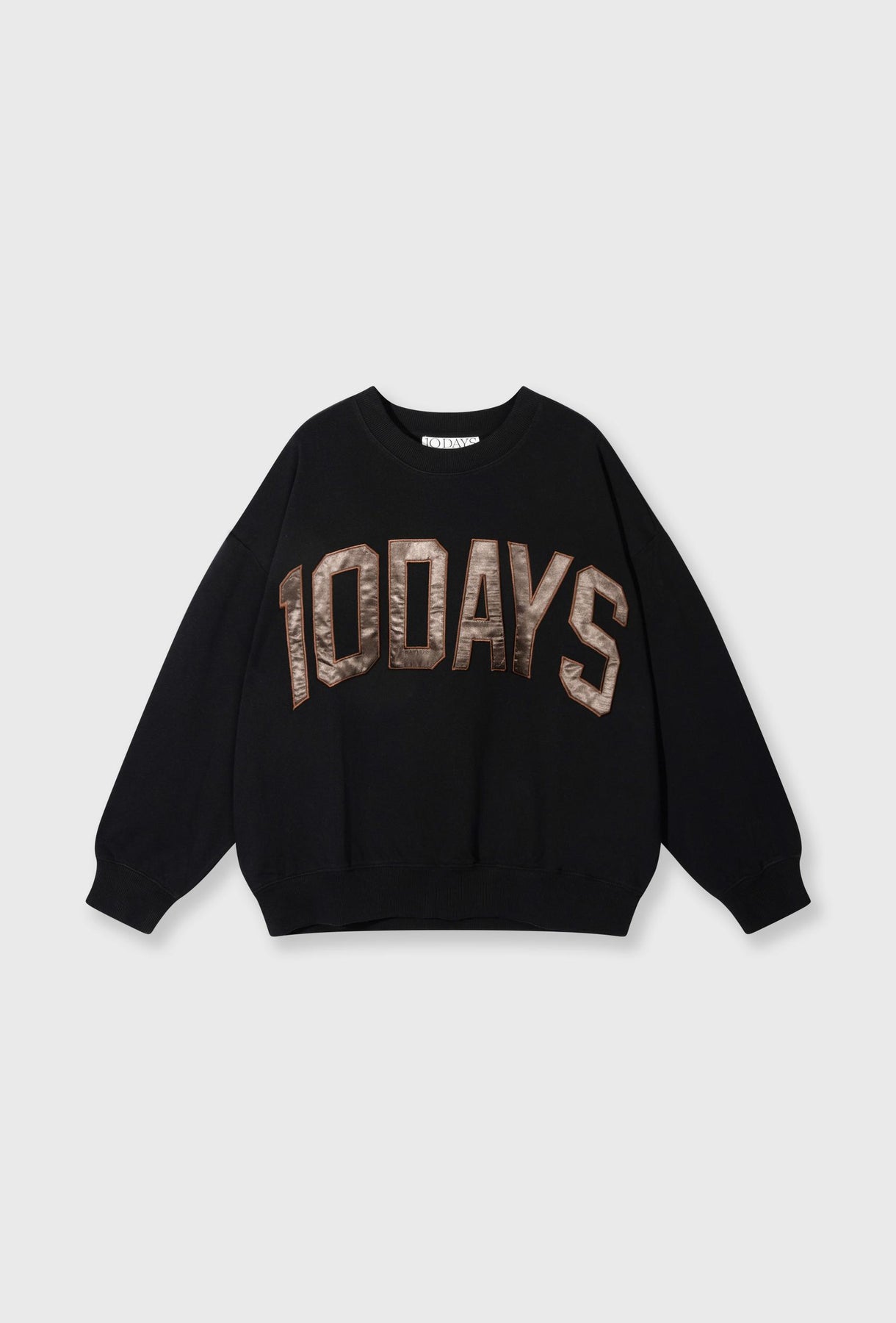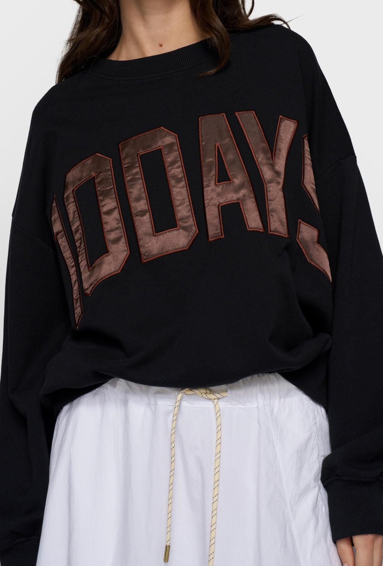Czarna bluza o oversize’owym kroju, która łączy wygodę z wyrazistym, miejskim stylem. Wykonana z miękkiej, przyjemnej w dotyku dzianiny, zapewnia komfort noszenia na co dzień. Model wyróżnia się dużym, kontrastowym napisem „10DAYS” na froncie, wykonanym w efektownym, lekko połyskującym wykończeniu, które nadaje całości charakteru. Obniżona linia ramion oraz luźny fason podkreślają swobodny, nowoczesny look, a klasyczny okrągły dekolt i ściągacze przy mankietach oraz u dołu dbają o wygodne dopasowanie. Idealna do stylizacji casualowych – noś ją z joggerami, jeansami lub spódnicą, tworząc komfortowe, a jednocześnie stylowe zestawy na co dzień.