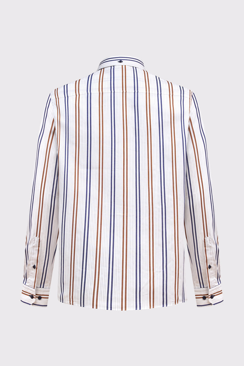 Męska koszula w pionowe paski w odcieniach granatu i rdzawego brązu na białym tle to wyrazista propozycja o nowoczesnym, a zarazem eleganckim charakterze. Wykonana z wysokiej jakości, lekkiej i przewiewnej tkaniny, zapewnia komfort noszenia przez cały dzień. Model posiada kołnierzyk typu button-down oraz zapięcie na guziki w kontrastowym kolorze, które podkreślają dopracowane detale. Subtelne logo na piersi nadaje koszuli markowego charakteru. Długie rękawy zakończone mankietami zapinanymi na guziki dopełniają klasyczny fason. Regularny krój sprawia, że koszula doskonale układa się na sylwetce i świetnie sprawdzi się zarówno w stylizacjach smart casual, jak i w bardziej eleganckim wydaniu.