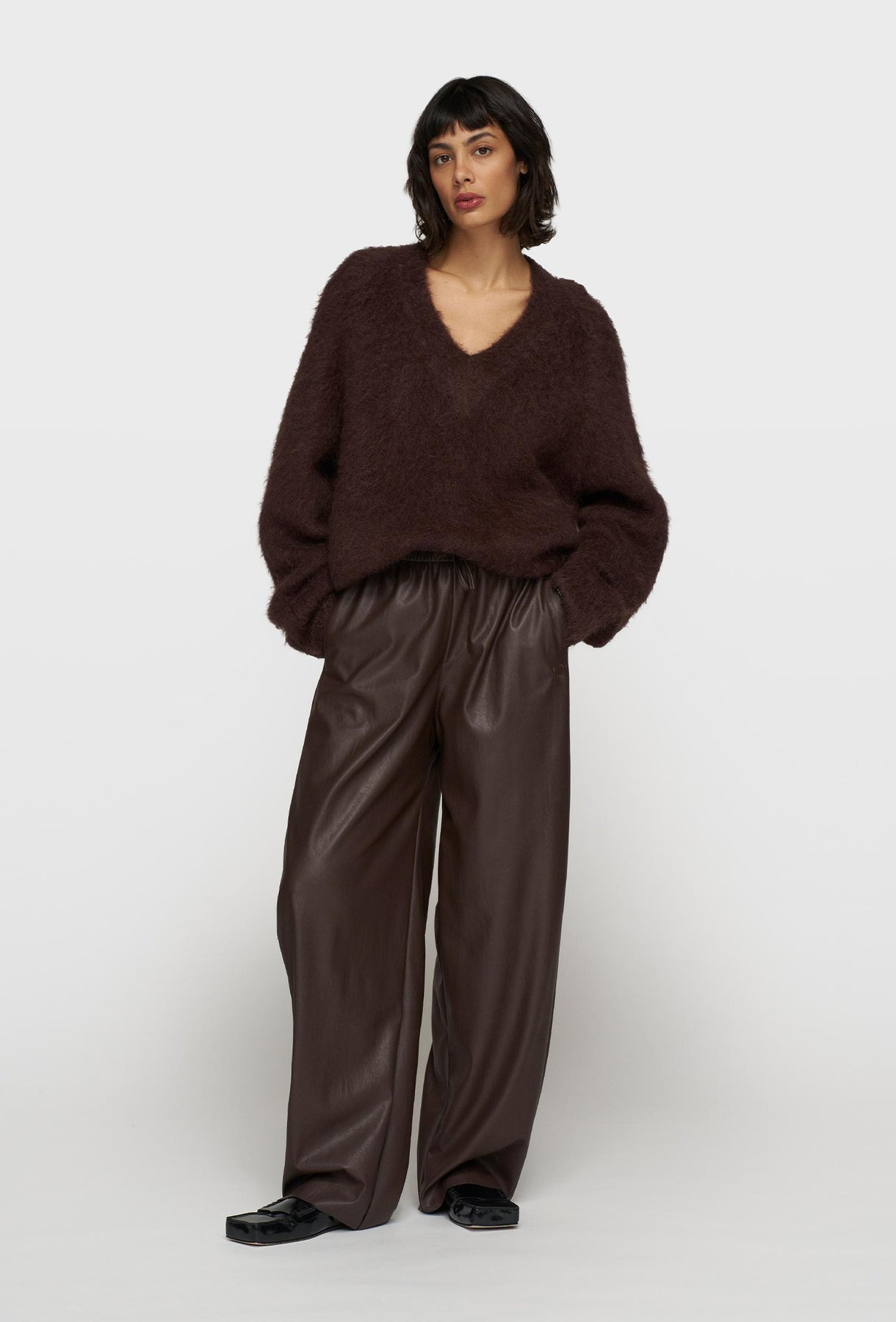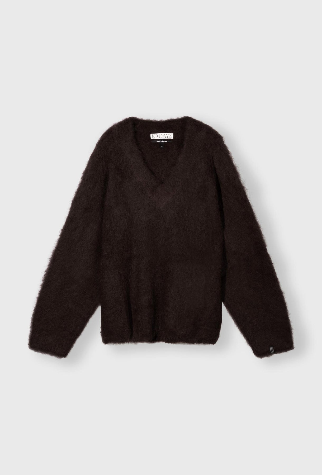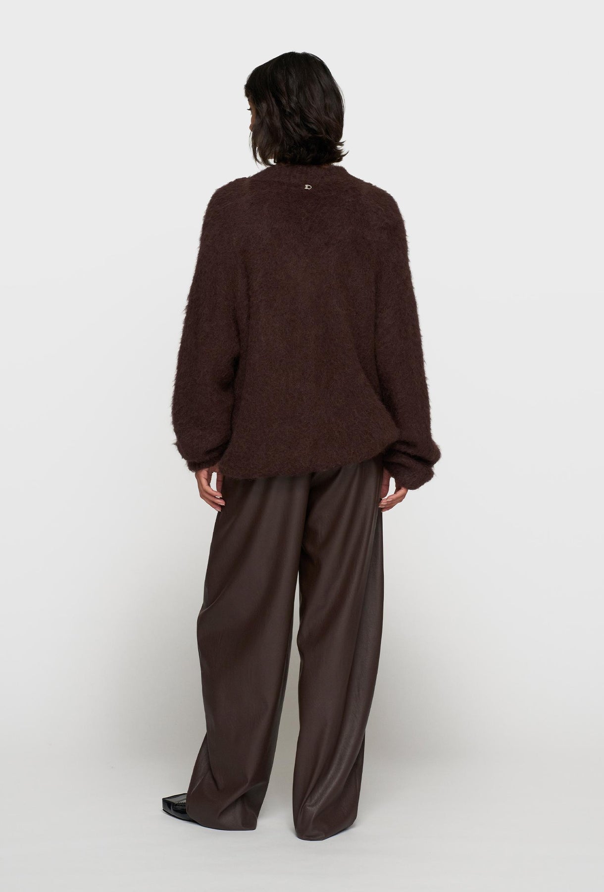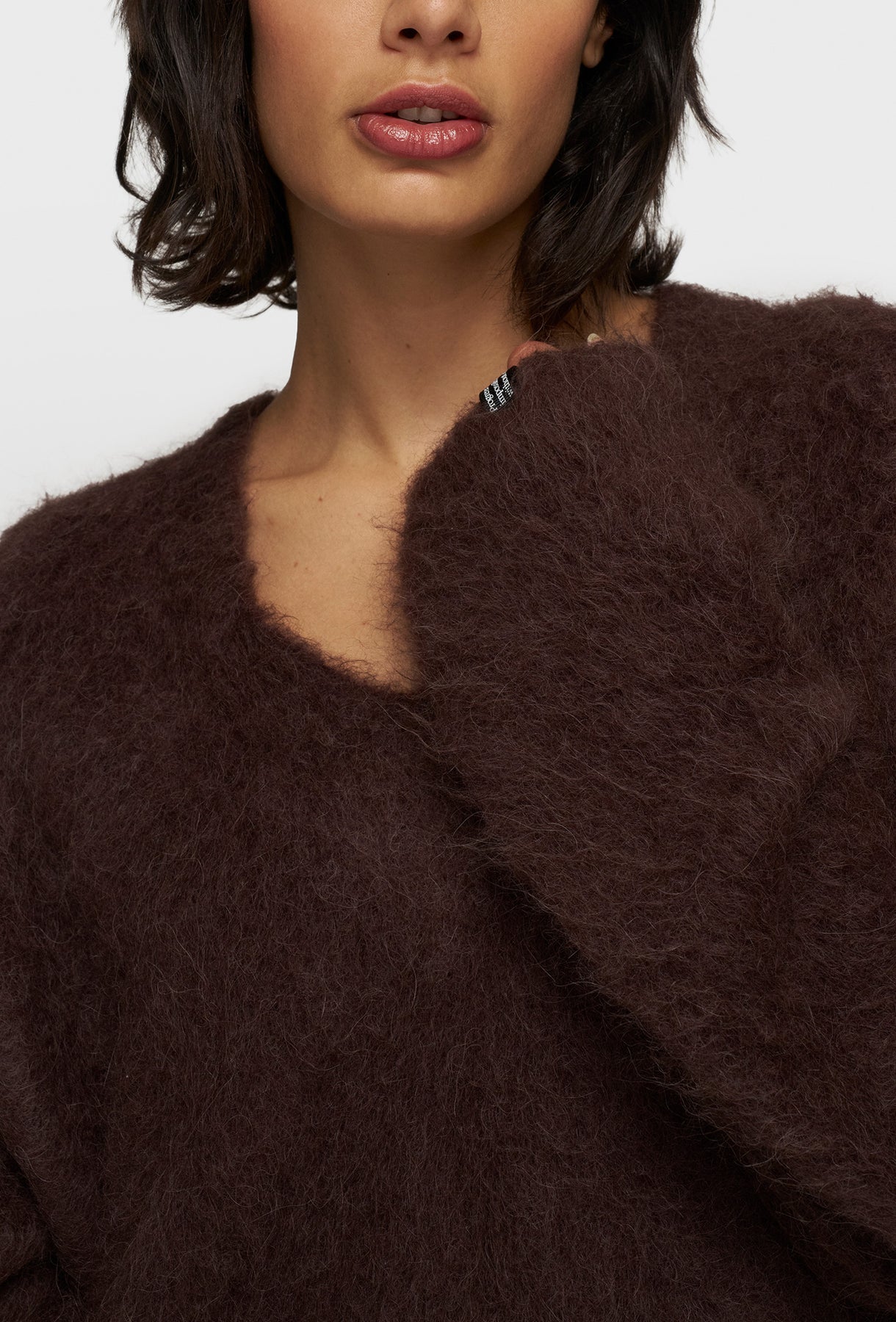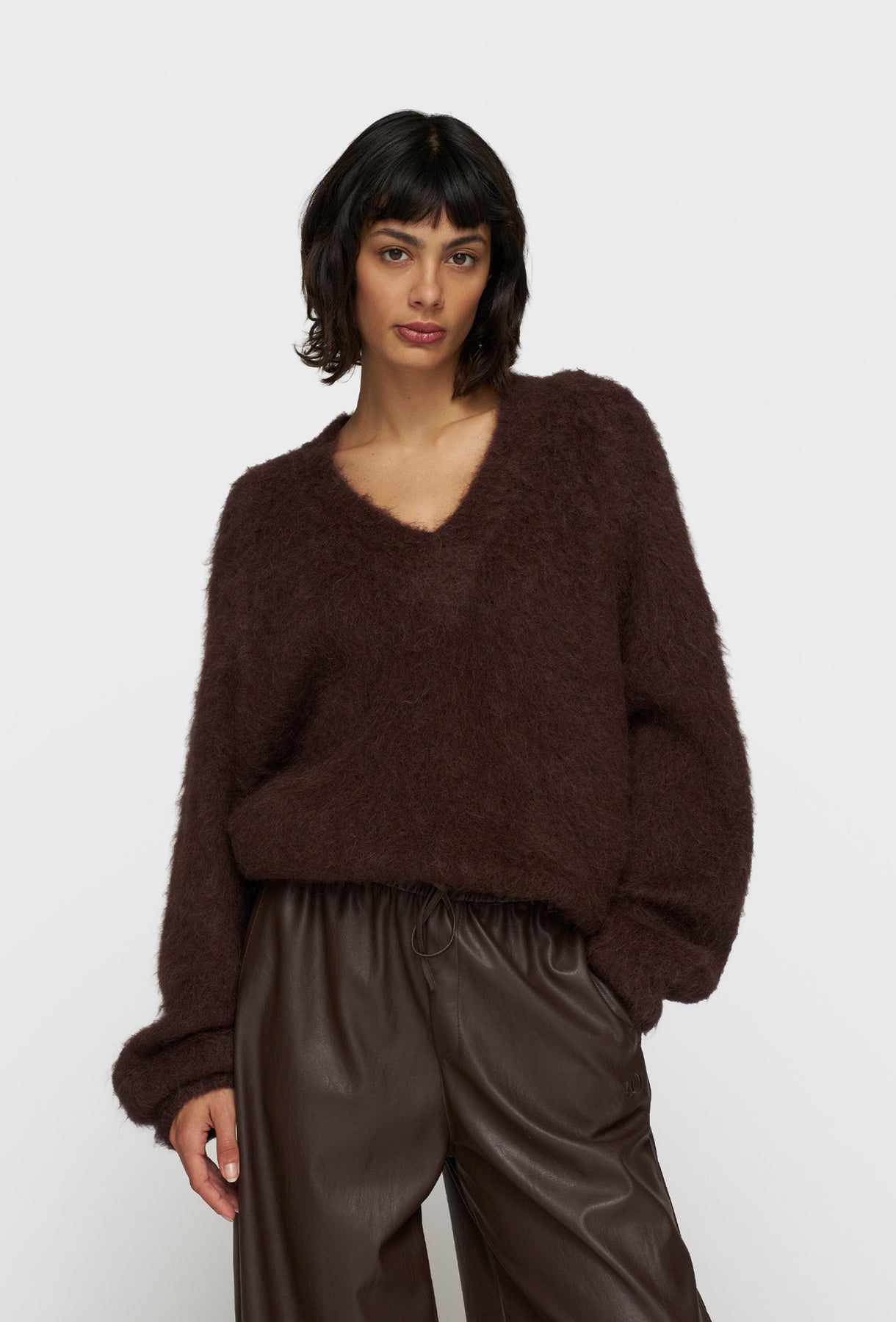Luksusowy sweter o wyrazistej, puchatej fakturze stanowi esencję przytulnej elegancji. Wykonany z miękkiej przędzy z charakterystycznym długim włosem, zapewnia wyjątkowy komfort cieplny i miękkość w dotyku. Głęboki, ciepły odcień czekoladowego brązu jest idealny do tworzenia jesienno-zimowych stylizacji. Fason jest oversizowy i luźny, z obniżoną linią ramion, co sprzyja swobodnemu układowi. Sweter posiada klasyczny dekolt w kształcie litery V, który delikatnie wydłuża szyję i pozwala na subtelne wyeksponowanie bielizny lub biżuterii. Rękawy są szerokie i obszerne, podkreślając objętość dzianiny. Jest to idealny element garderoby, który z łatwością łączy casualowy luz z premium designem, sprawdzając się zarówno z jeansami, jak i eleganckimi spodniami.