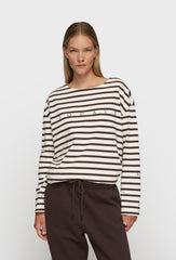 Bluzka w paski z długim rękawem wykonana z miękkiej, przewiewnej bawełny. Model w kolorze kremowym z brązowymi paskami, o prostym, lekko luźnym kroju, zapewniającym wygodę i swobodę ruchów. Na przodzie znajduje się subtelny nadruk z logo 10DAYS, dodający całości minimalistycznego charakteru. Klasyczny okrągły dekolt sprawia, że bluzka doskonale sprawdzi się zarówno w codziennych, jak i bardziej casualowych stylizacjach. Idealna do noszenia z ulubionymi jeansami, spodniami z wysokim stanem czy pod marynarkę dla modnego, miejskiego looku.