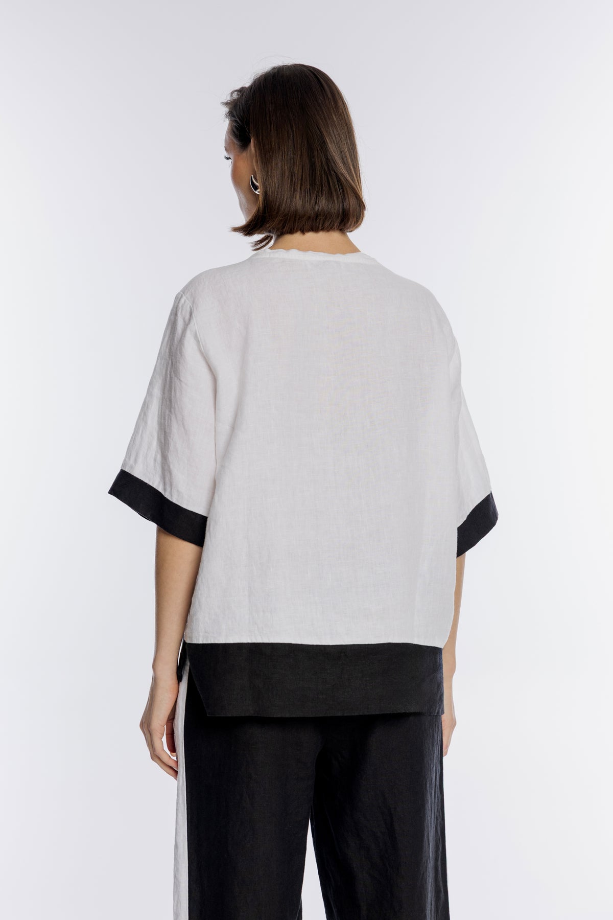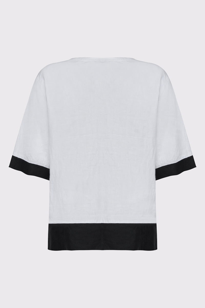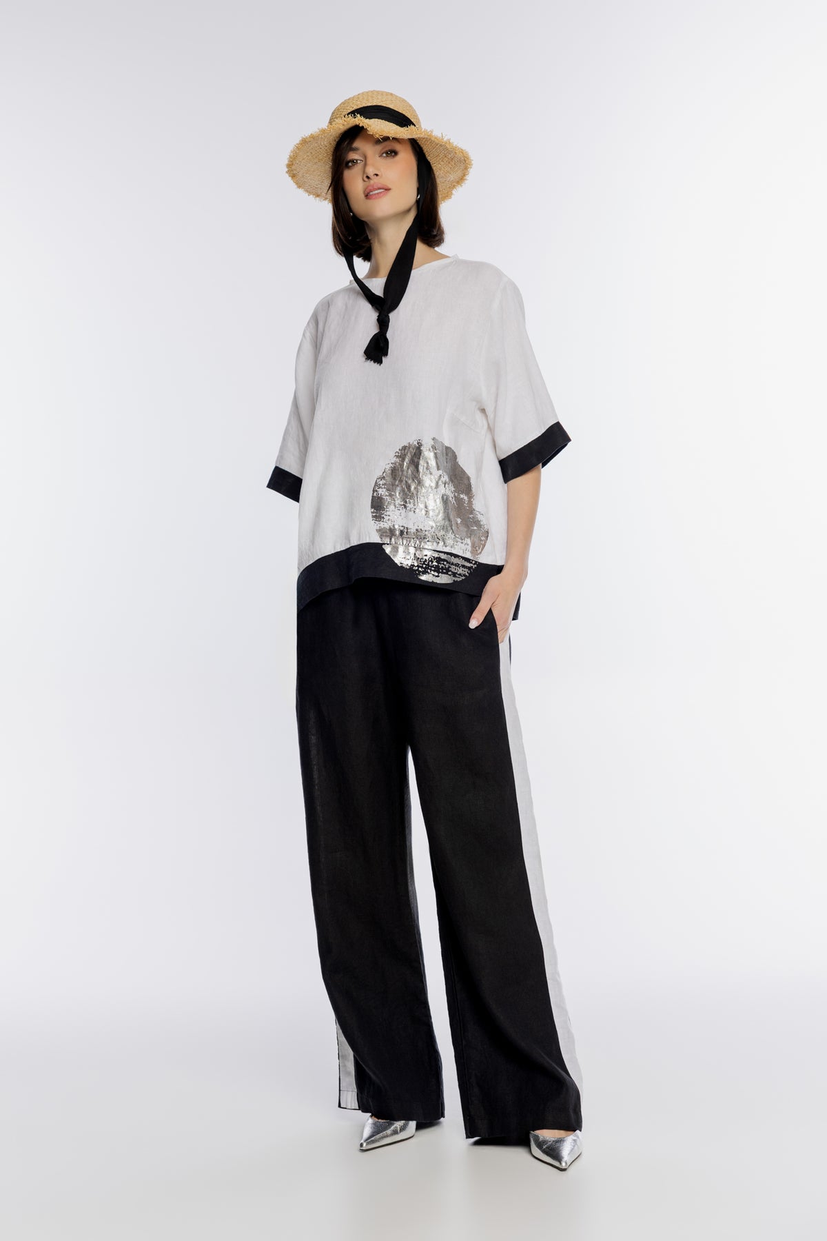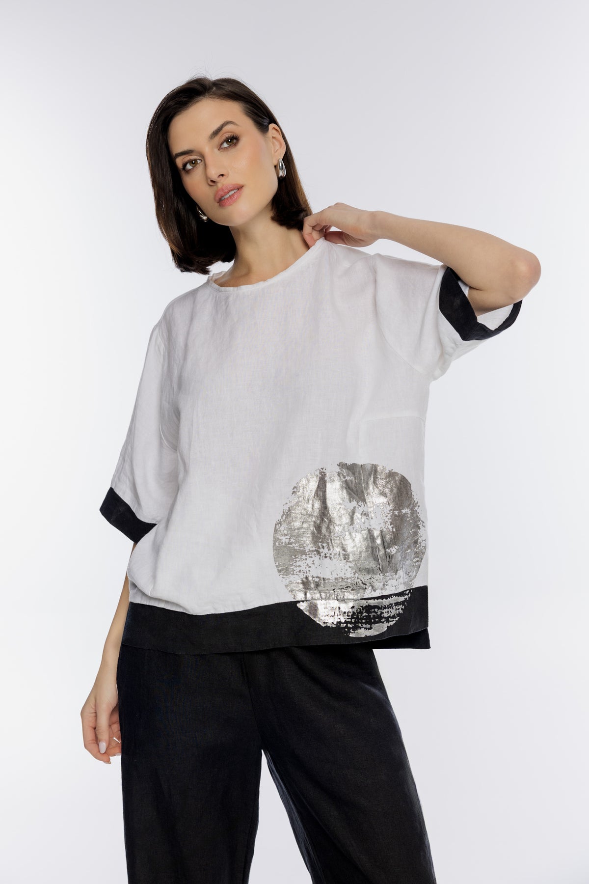 Stylowa damska bluzka marki Campione wykonana z lekkiego, wysokogatunkowego lnu w kolorze białym. Model o luźnym kroju z krótkim rękawem typu kimono, wykończonym kontrastową czarną lamówką, która powtarza się również na dole bluzki. Głównym elementem dekoracyjnym jest duży, artystyczny nadruk w kolorze srebrnym o metalicznym połysku, umieszczony w dolnej części przodu. Okrągły dekolt oraz swobodny fason zapewniają wyjątkowy komfort noszenia i przewiewność. Bluzka stanowi idealne dopełnienie letnich stylizacji, łącząc naturalną klasykę z nowoczesnymi, błyszczącymi detalami.
