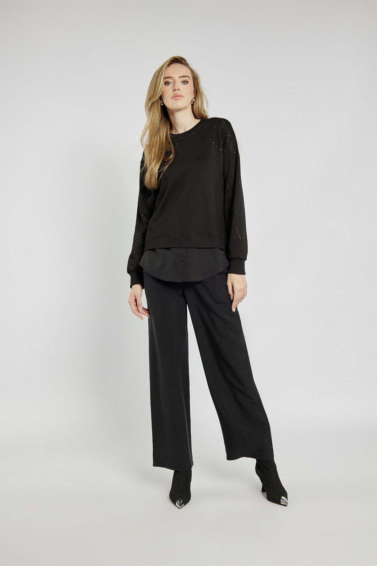Stylowa bluza damska Campione w głębokim czarnym kolorze, ozdobiona drobnymi aplikacjami na rękawach. Model z okrągłym dekoltem i ściągaczem u dołu oraz przy rękawach, wykonany z miękkiej i elastycznej tkaniny. Idealna propozycja na chłodniejsze dni — zarówno w połączeniu z eleganckimi spodniami, jak i codziennym denimem.