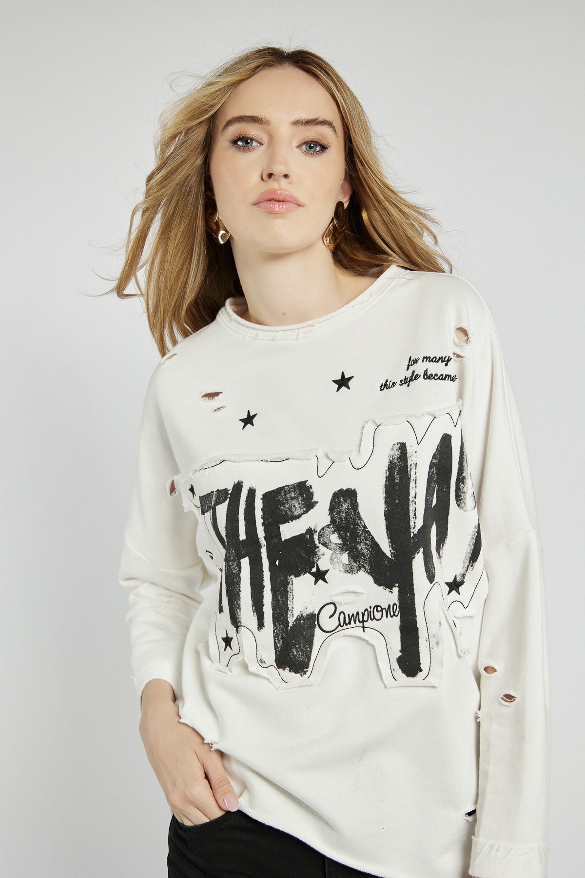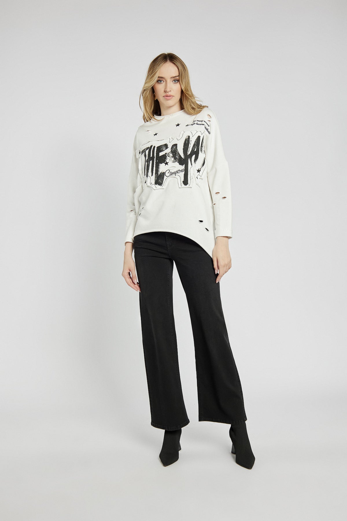 Biała bluza z długim rękawem to stylowa propozycja dla kobiet ceniących sobie casualowy look z pazurem. Wykonana z miękkiego materiału, zapewnia komfort noszenia. Bluza wyróżnia się odważnym, czarnym nadrukiem, a także celowymi przetarciami i drobnymi dziurkami, które nadają jej rockowego charakteru. Fason bluzy jest luźny, z nieregularnym dołem, co dodaje jej oryginalności. Idealna do noszenia z dżinsami, skórzanymi spodniami lub spódnicami, tworząc stylowy i swobodny look. Modelka na zdjęciu ma na sobie czarne spodnie, które świetnie uzupełniają tę bluzę.
