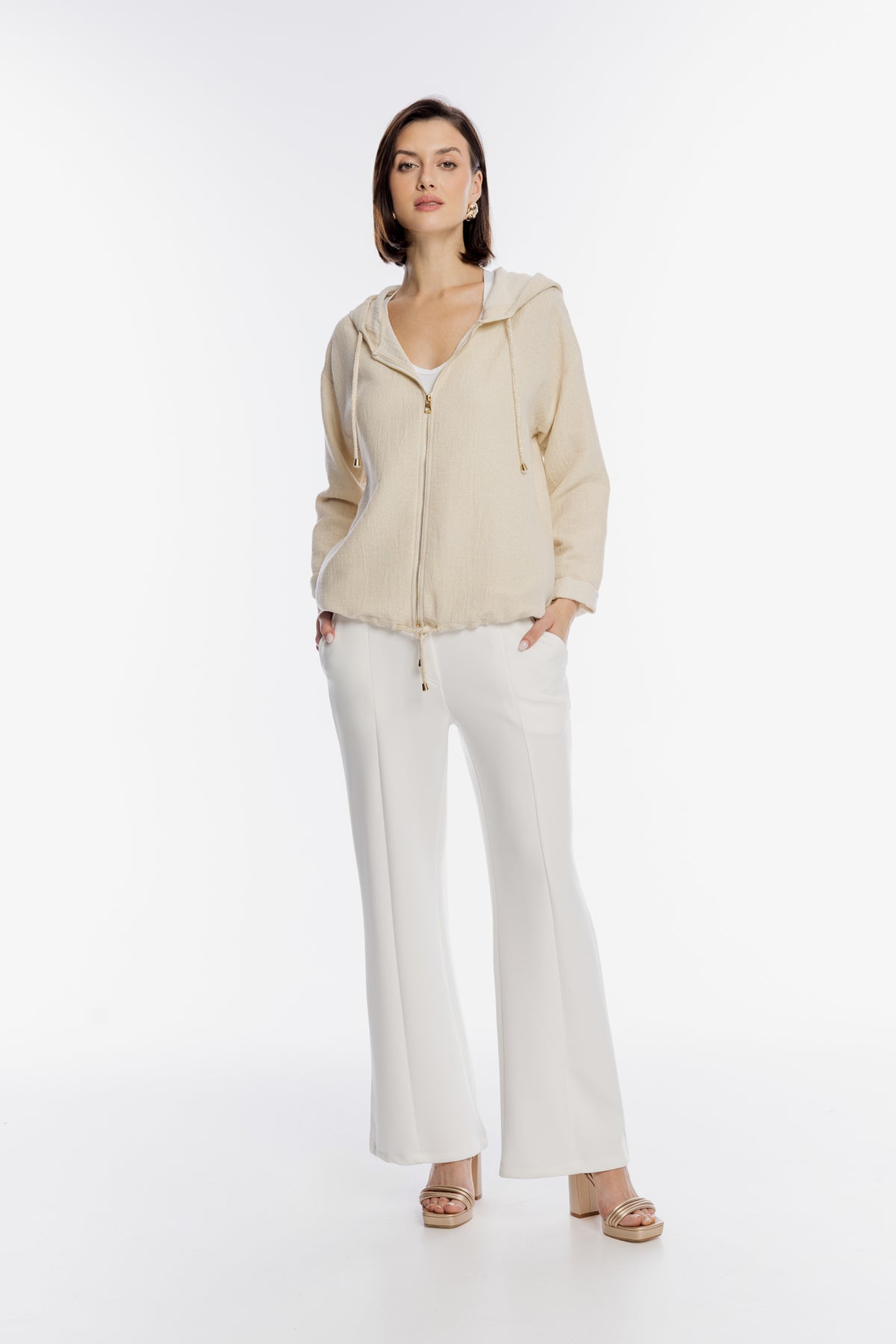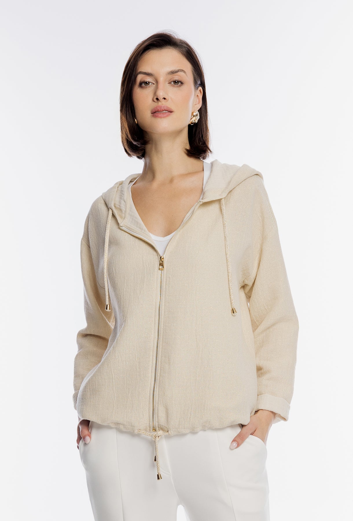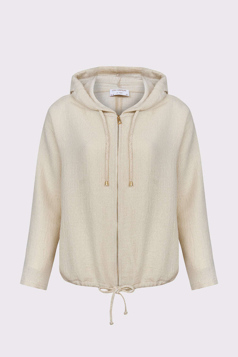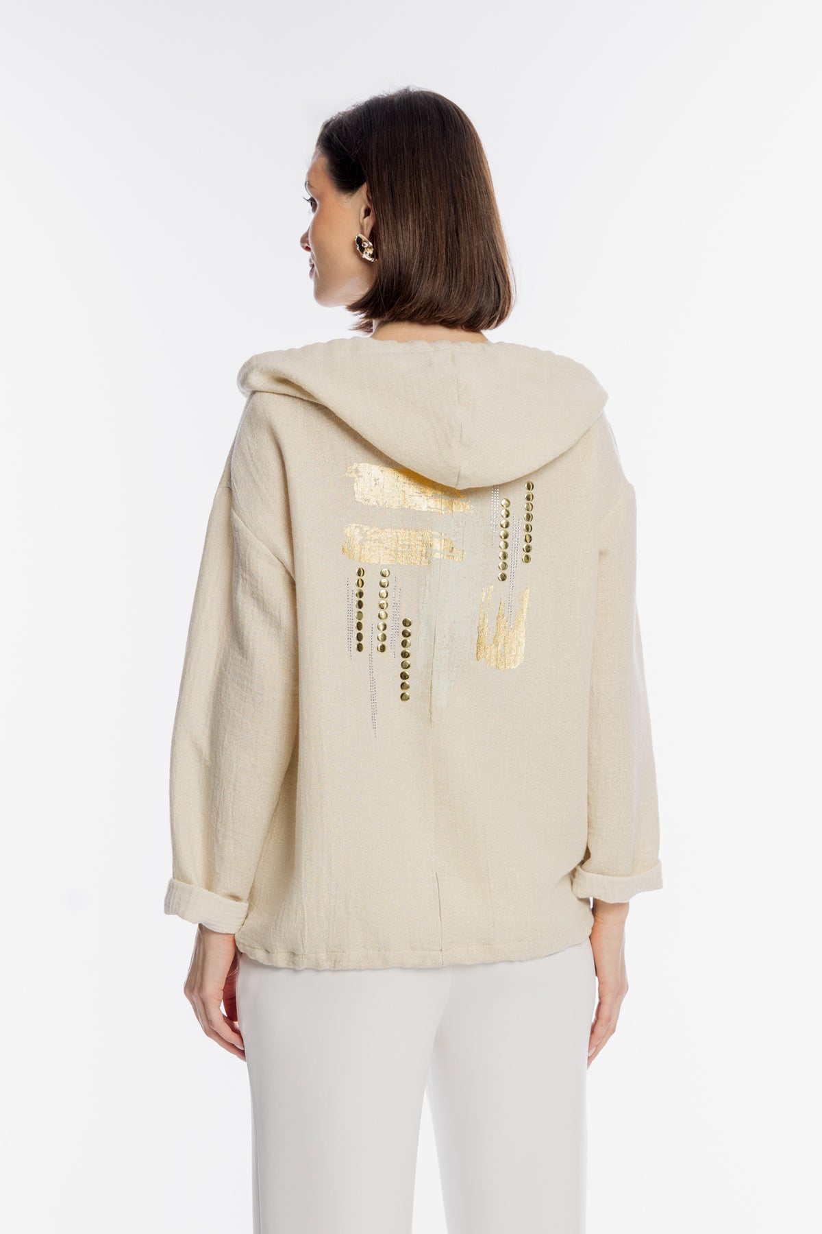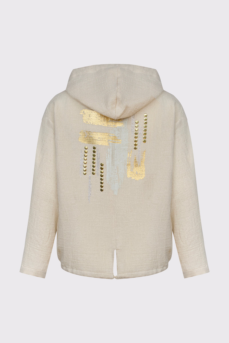 Luksusowa bluza damska marki Campione w delikatnym beżowym odcieniu, wykonana z wysokiej jakości strukturalnego materiału o subtelnym połysku. Model wyróżnia się efektownym złotym zdobieniem na plecach w formie artystycznych pociągnięć pędzla i dżetów, co nadaje mu unikatowego charakteru. Bluza posiada luźny krój, zintegrowany kaptur z ozdobnymi troczkami oraz zapięcie na elegancki złoty zamek. Obniżona linia ramion oraz lekko surowe wykończenie brzegów podkreślają jej nowoczesny, casualowy styl. Idealna propozycja dla kobiet ceniących wygodę w prestiżowym wydaniu.
