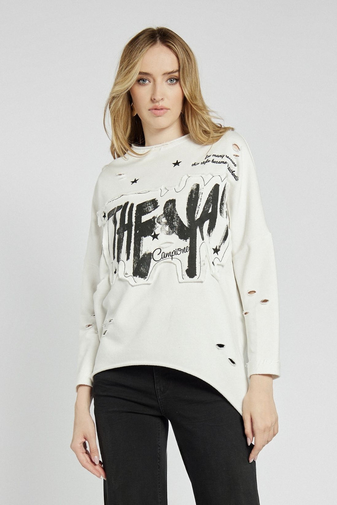 Biała bluza z nadrukiem i przetarciami