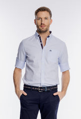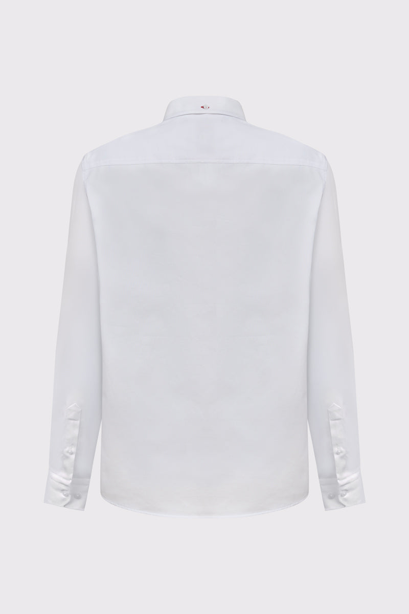 Biała koszula męska o klasycznym kroju to elegancka i uniwersalna propozycja na wiele okazji. Wykonana z wysokiej jakości, gładkiej tkaniny, zapewnia komfort noszenia oraz estetyczny wygląd przez cały dzień. Model posiada kołnierzyk typu button-down, zapinany na guziki, oraz praktyczną kieszeń na piersi. Subtelne kontrastowe wykończenie wewnątrz kołnierza dodaje całości nowoczesnego charakteru i podkreśla dbałość o detale. Długie rękawy z mankietami zapinanymi na guziki dopełniają klasyczny fason. Koszula doskonale sprawdzi się zarówno w stylizacjach biznesowych z marynarką, jak i w bardziej casualowym zestawieniu z chinosami czy jeansami.