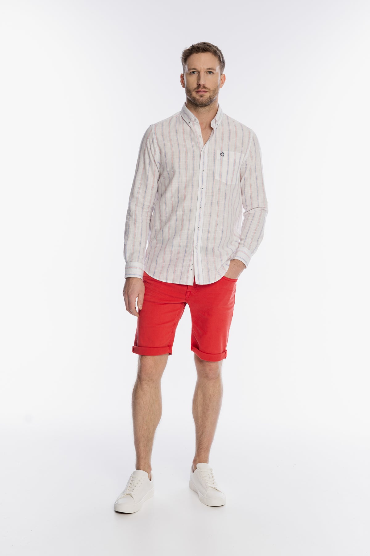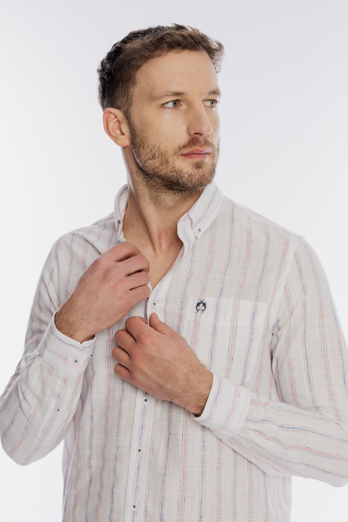 Wyjątkowa męska koszula marki Campione, wykonana z lekkiej i przewiewnej tkaniny, to idealny wybór na letnie dni. Model zdobi subtelny wzór w pionowe, kolorowe prążki, które nadają całości świeżego, wakacyjnego charakteru. Koszula posiada klasyczny kołnierzyk typu button-down, długie rękawy z możliwością podwinięcia oraz praktyczną kieszonkę na piersi z delikatnym haftem. Kontrastowe wykończenia detali oraz wysokiej jakości materiał podkreślają jej ekskluzywny styl. Doskonale prezentuje się w zestawieniu z kolorowymi szortami lub klasycznymi chinosami, zapewniając stylowy wygląd i pełen komfort.