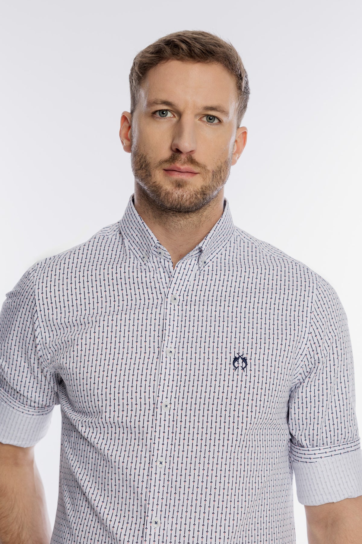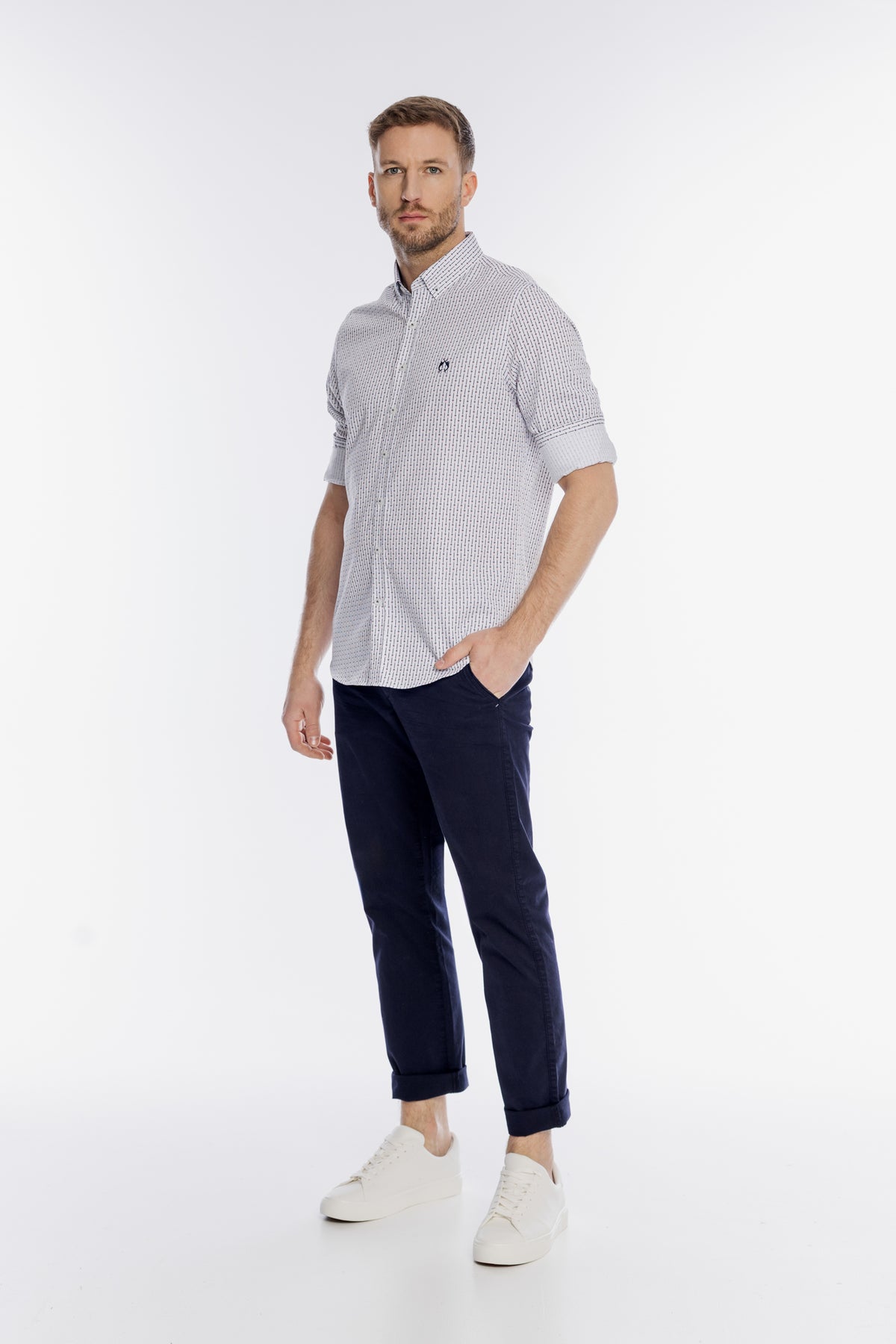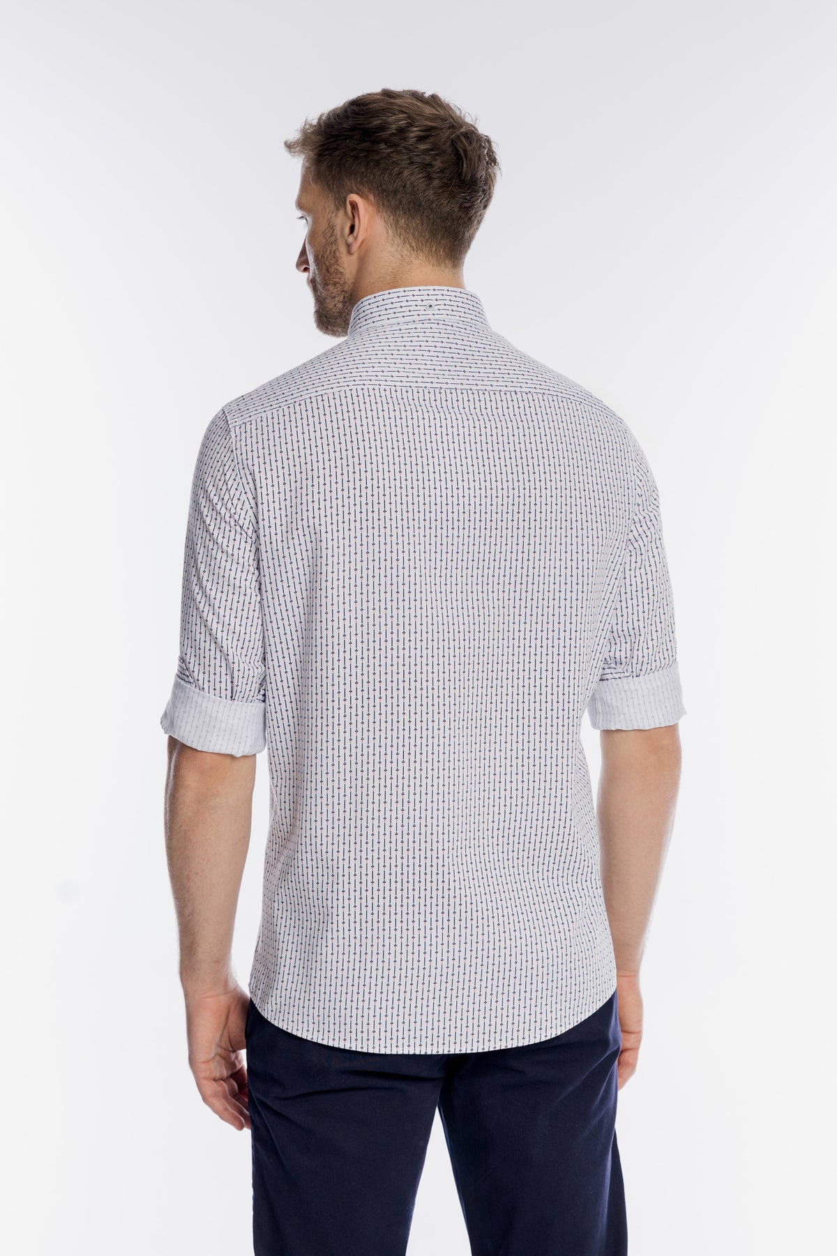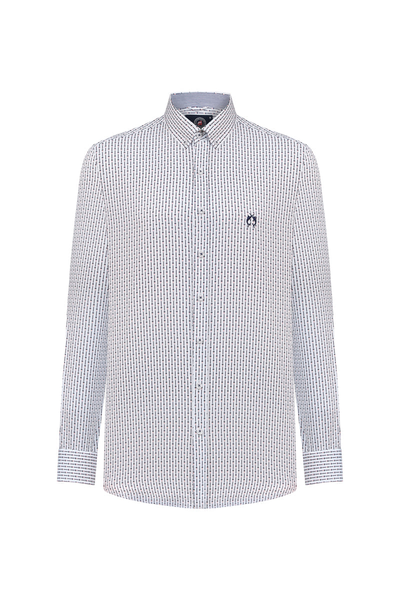 Elegancka męska koszula marki Campione w kolorze białym, ozdobiona unikatowym, drobnym wzorem ułożonym w pionowe pasy. Wykonana z wysokogatunkowej bawełny, zapewnia wyjątkowy komfort noszenia oraz przewiewność, idealną na cieplejsze dni. Model posiada klasyczny kołnierzyk typu button-down oraz subtelne, haftowane logo na lewej piersi, które podkreśla prestiżowy charakter odzieży premium. Długie rękawy z możliwością stylowego podwinięcia sprawiają, że koszula doskonale sprawdzi się zarówno w biurze, jak i podczas weekendowych spotkań. To doskonała baza do stylizacji z ciemnymi chinosami lub klasycznymi jeansami.