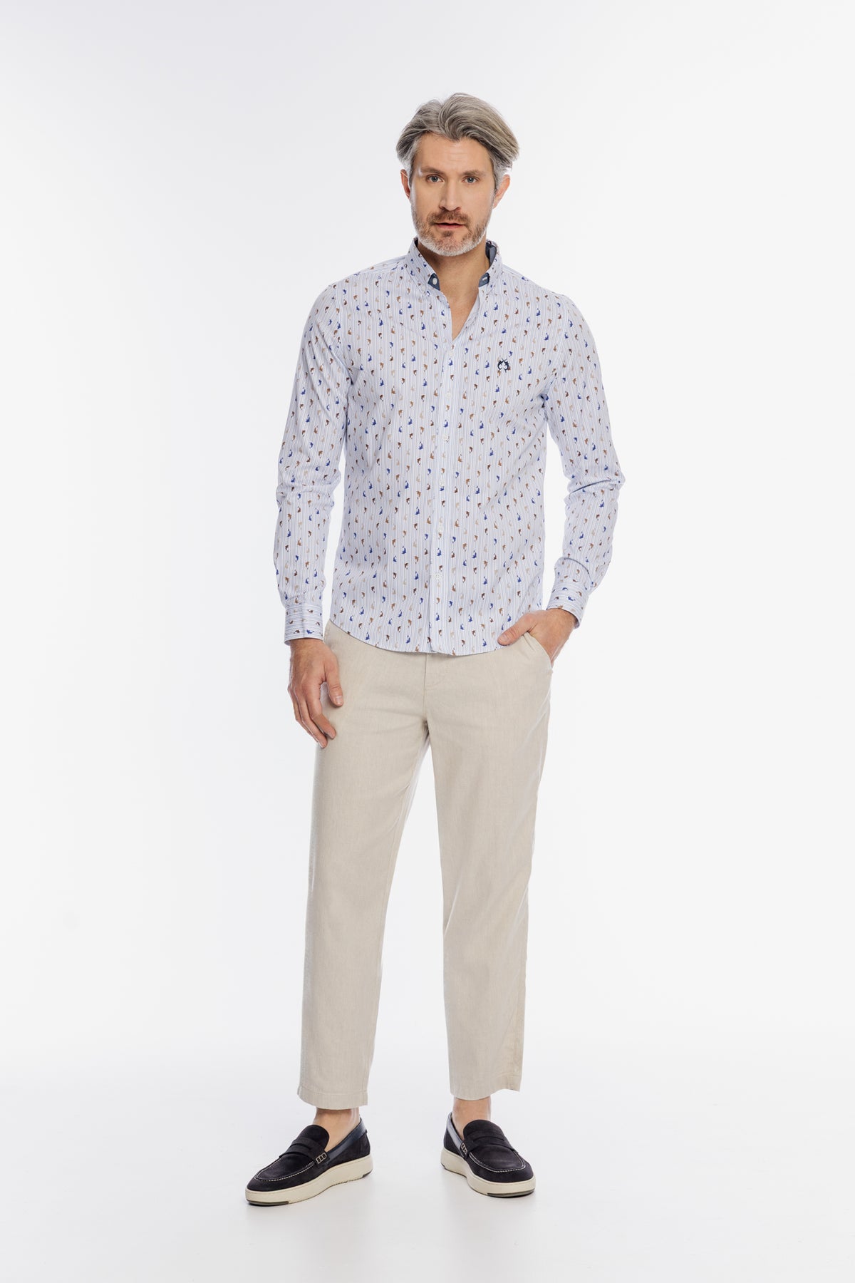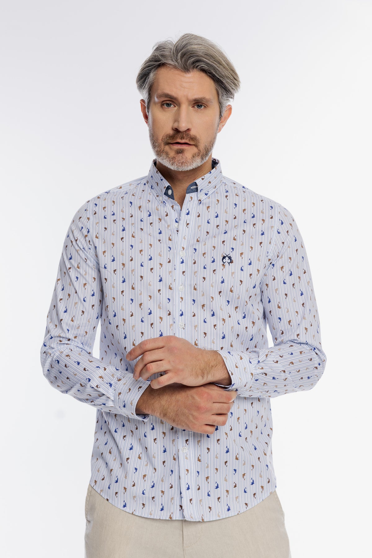 Stylowa męska koszula marki Campione w kolorze białym, wyróżniająca się unikatowym, kolorowym wzorem w małe delfiny oraz subtelnymi pionowymi prążkami. Koszula posiada klasyczny kołnierzyk typu button-down z kontrastowym, ciemniejszym wykończeniem od wewnątrz, co nadaje jej nowoczesnego wyrazu. Wykonana z wysokiej jakości, przewiewnego materiału, zapewnia wyjątkowy komfort noszenia nawet w cieplejsze dni. Na piersi znajduje się precyzyjny haft z logo marki, podkreślający prestiżowy charakter odzieży. Długie rękawy zakończone są regulowanymi mankietami, a dopracowany krój sprawia, że model ten idealnie komponuje się z jasnymi spodniami typu chino, tworząc swobodną, a zarazem elegancką stylizację.