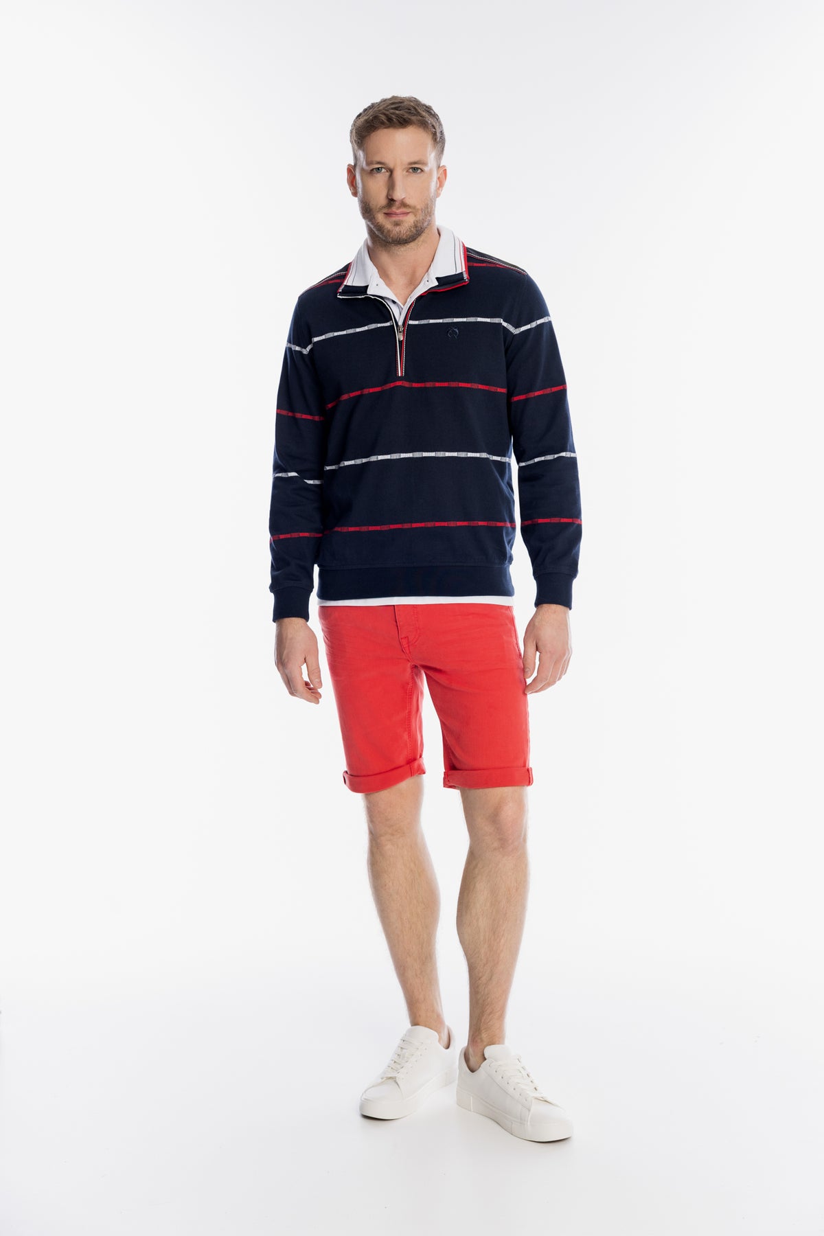Elegancki męski sweter marki Campione z wysokim kołnierzem i krótkim suwakiem to propozycja dla wymagających użytkowników. Granatowe tło zostało ozdobione regularnym wzorem w białe i czerwone poziome paski, nawiązujące do klasycznego stylu żeglarskiego. Model posiada białe wykończenie kołnierza oraz subtelny haft na piersi, podkreślający autentyczność marki. Wykonany z przyjemnej w dotyku przędzy, zapewnia optymalne ciepło i przewiewność. Świetnie prezentuje się w zestawieniu z kolorowymi szortami lub klasycznymi jeansami.