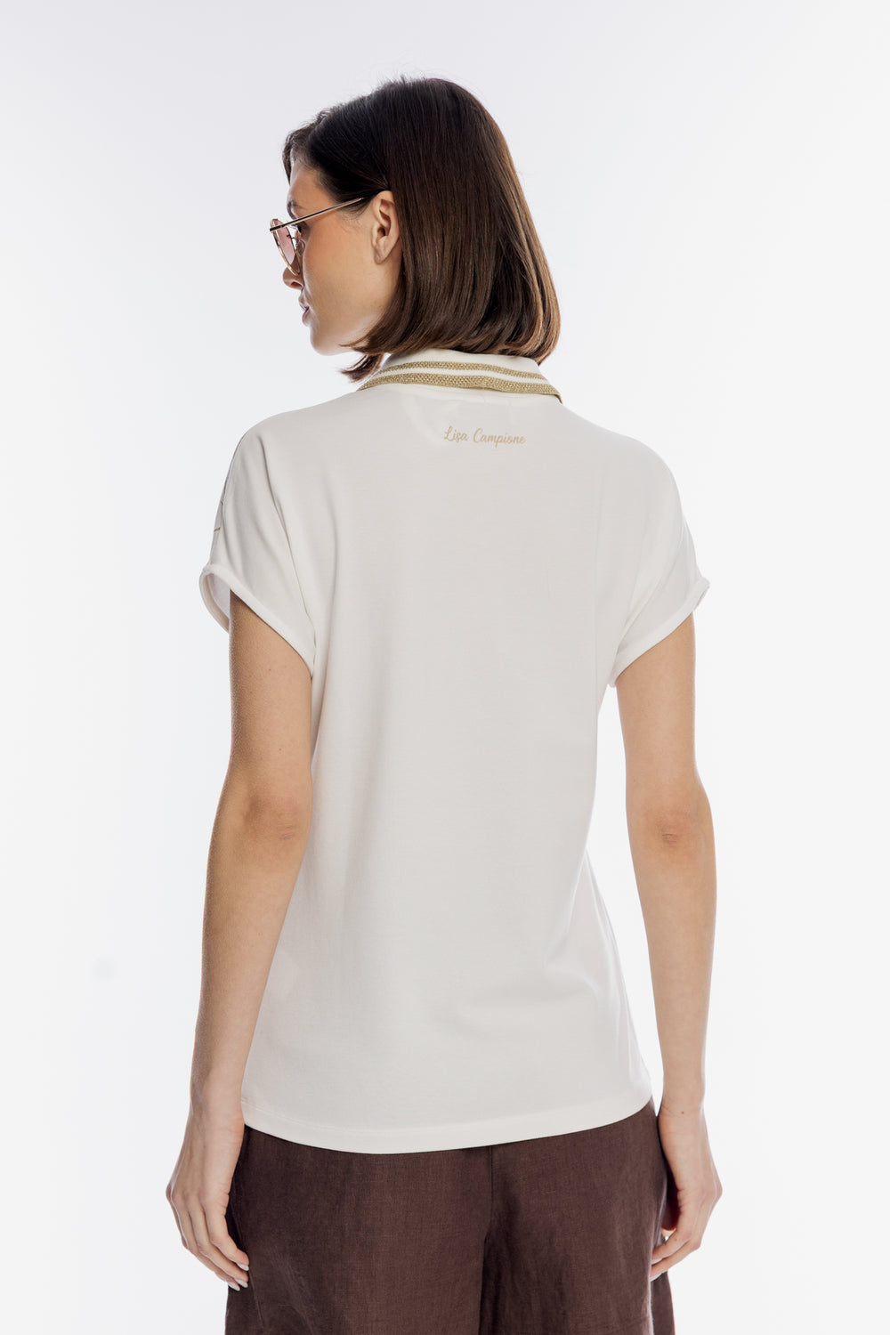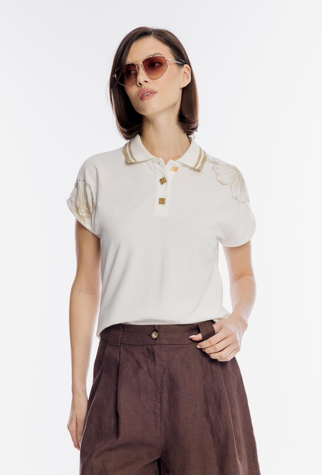 Biała bluzka polo ze złotym kwiatowym haftem