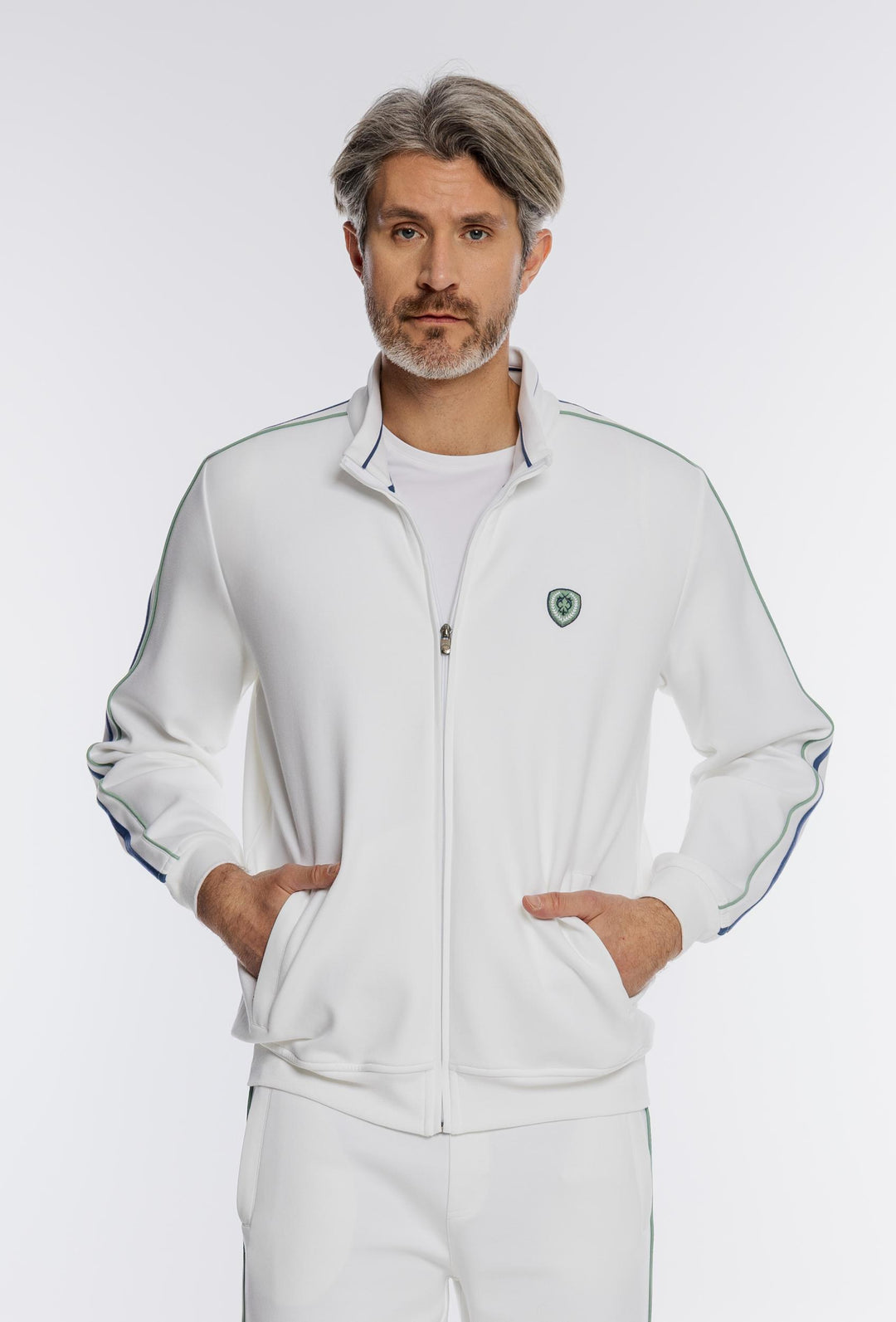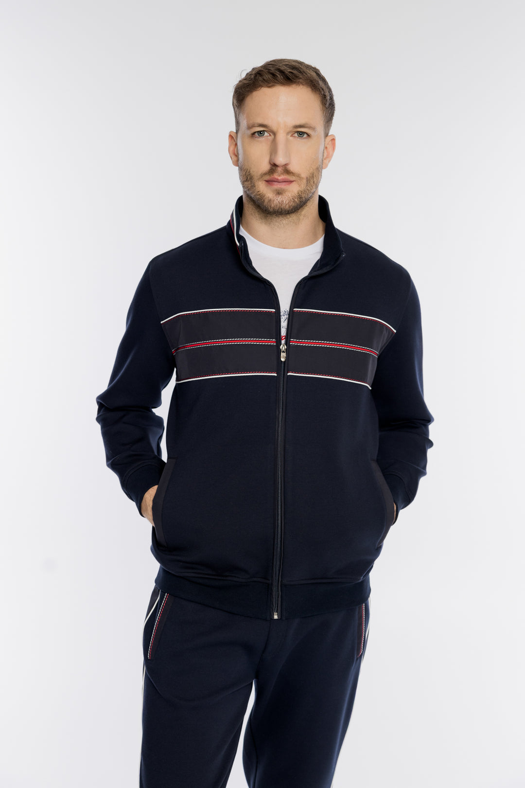 Biała męska bluza rozpinana z kontrastowymi pasami