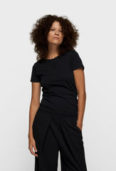 Klasyczny t-shirt o dopasowanym kroju, zaprojektowany z myślą o minimalistycznym stylu i uniwersalnym zastosowaniu. Model z krótkim rękawem i okrągłym dekoltem subtelnie podkreśla sylwetkę, zachowując jednocześnie pełen komfort noszenia. Wykonany z wysokiej jakości, miękkiej dzianiny bawełnianej, która jest przyjemna w dotyku, elastyczna i dobrze układa się na ciele. Na przodzie koszulki znajduje się delikatny, tonalny haft z logo, nadający całości elegancki i dopracowany charakter. T-shirt doskonale sprawdzi się jako baza codziennych stylizacji – noszony zarówno samodzielnie, jak i w zestawach warstwowych, tworząc spójny total look z dopasowanymi spodniami lub bardziej casualowe połączenia.