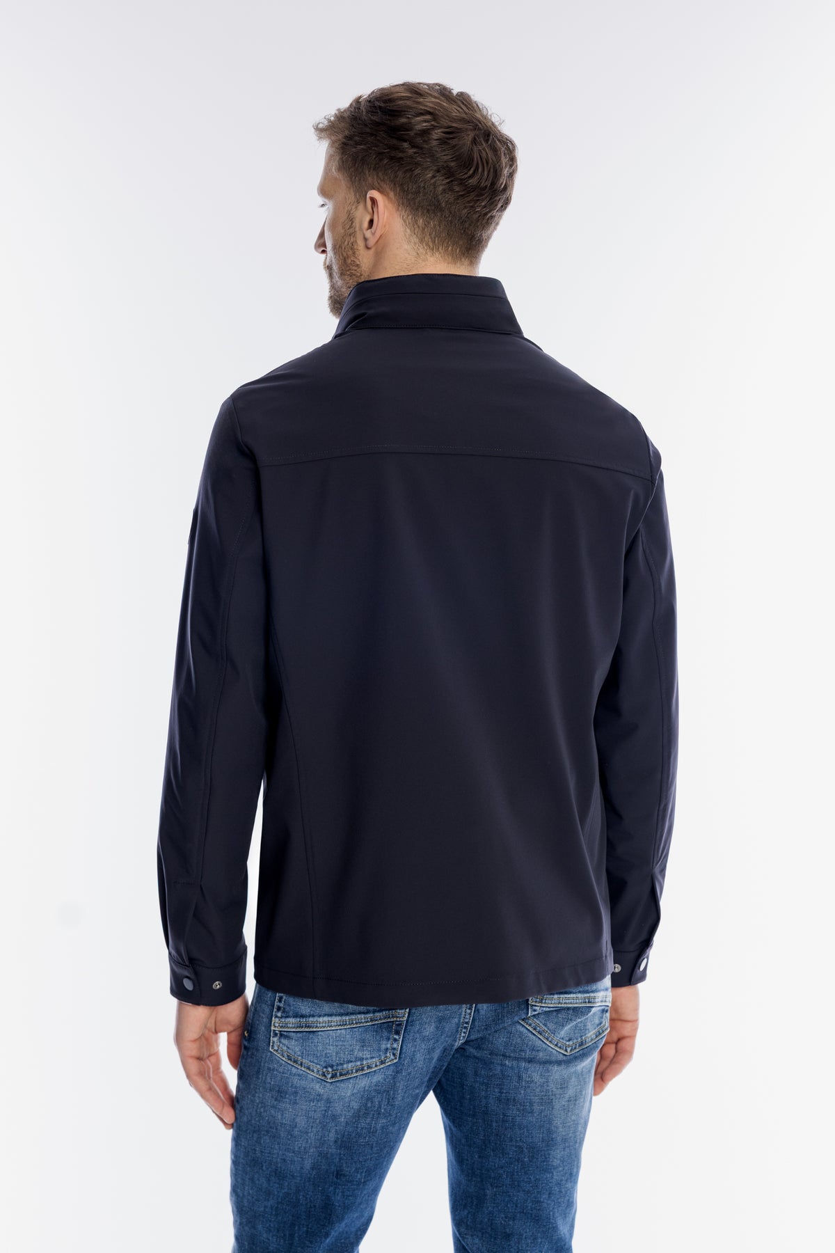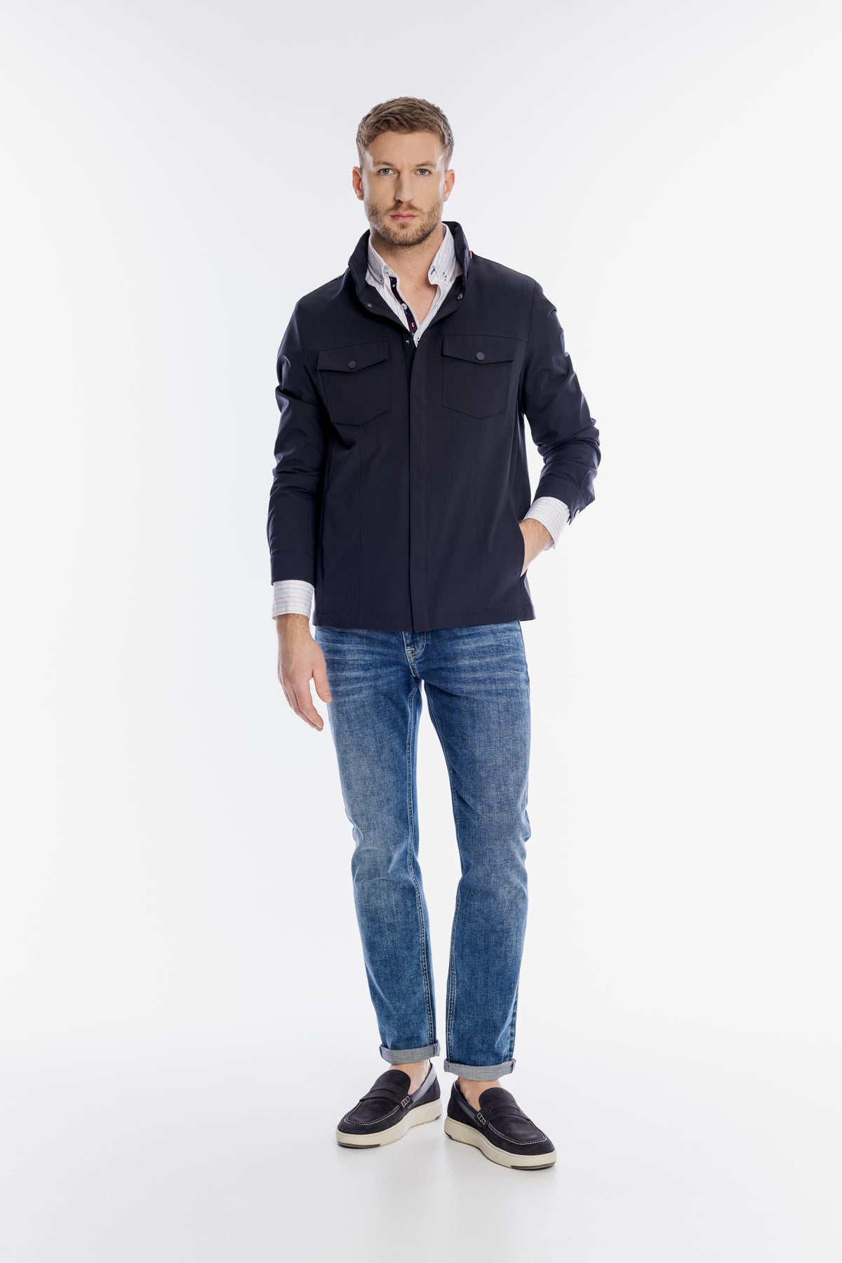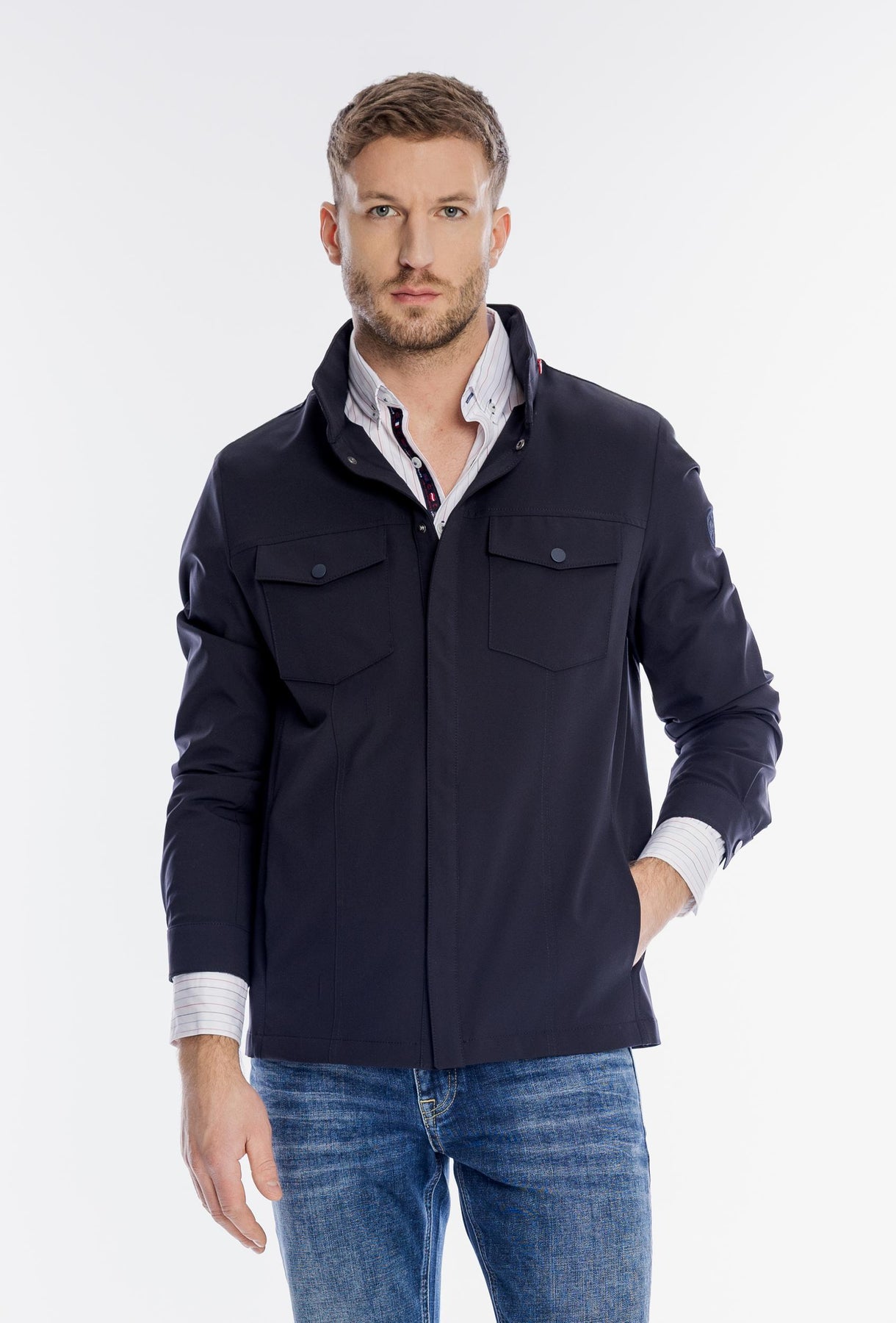 Elegancka męska kurtka Campione w kolorze granatowym to doskonały wybór na sezon przejściowy. Model charakteryzuje się prostym krojem, wysoką stójką chroniącą przed wiatrem oraz funkcjonalnymi kieszeniami z klapami na piersi. Wykonana z gładkiego, wysokiej jakości materiału, zapewnia stylowy wygląd oraz komfort użytkowania. Kurtka posiada subtelne detale w postaci logowanej naszywki na rękawie oraz kontrastowego akcentu przy kołnierzu. Idealnie komponuje się z casualowymi zestawami, takimi jak jeansy i koszula.