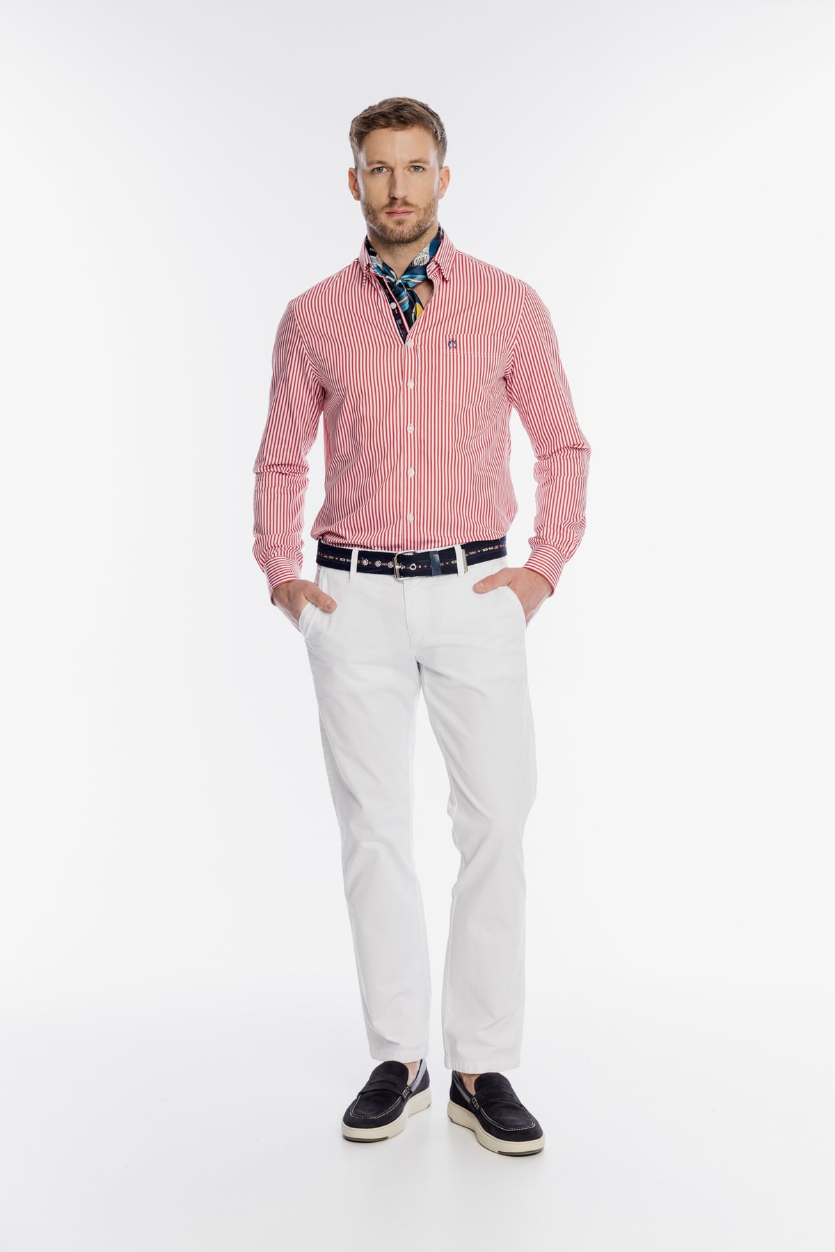Ekskluzywna męska koszula marki Campione to doskonałe połączenie klasycznego stylu marynistycznego z nowoczesnym wykończeniem. Wykonana z najwyższej jakości bawełny, charakteryzuje się wyrazistym wzorem w pionowe, czerwono-białe paski, które optycznie wysmuklają sylwetkę. Model posiada elegancki kołnierzyk oraz długie rękawy, a unikatowości dodaje mu kontrastowe wykończenie wewnętrznej strony stójki oraz plisy guzikowej z motywem flag. Subtelna, haftowana aplikacja na kieszonce piersiowej podkreśla prestiżowy charakter marki. Koszula idealnie komponuje się z białymi spodniami, tworząc świeży i stylowy zestaw na letnie dni lub wieczorne wyjścia.