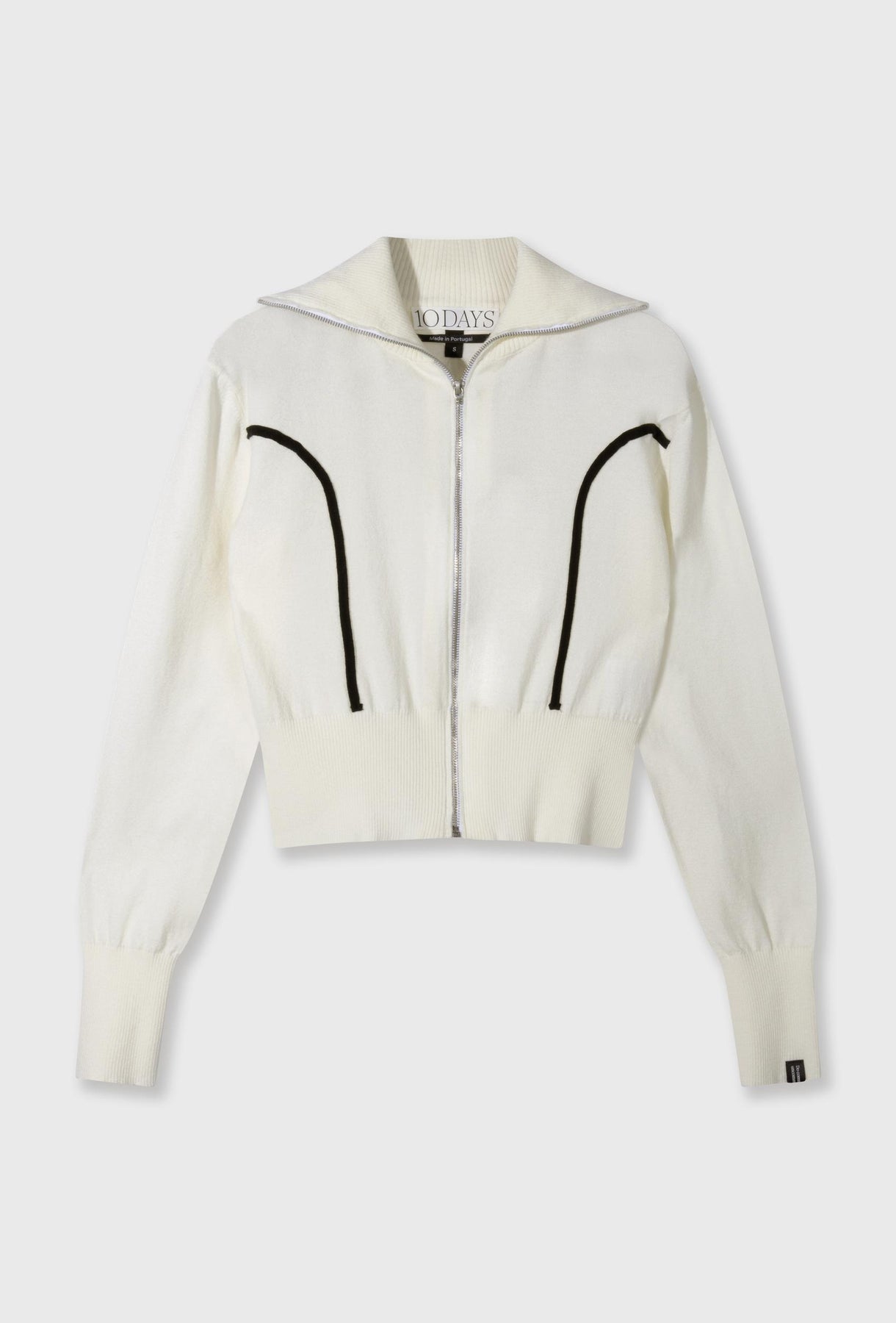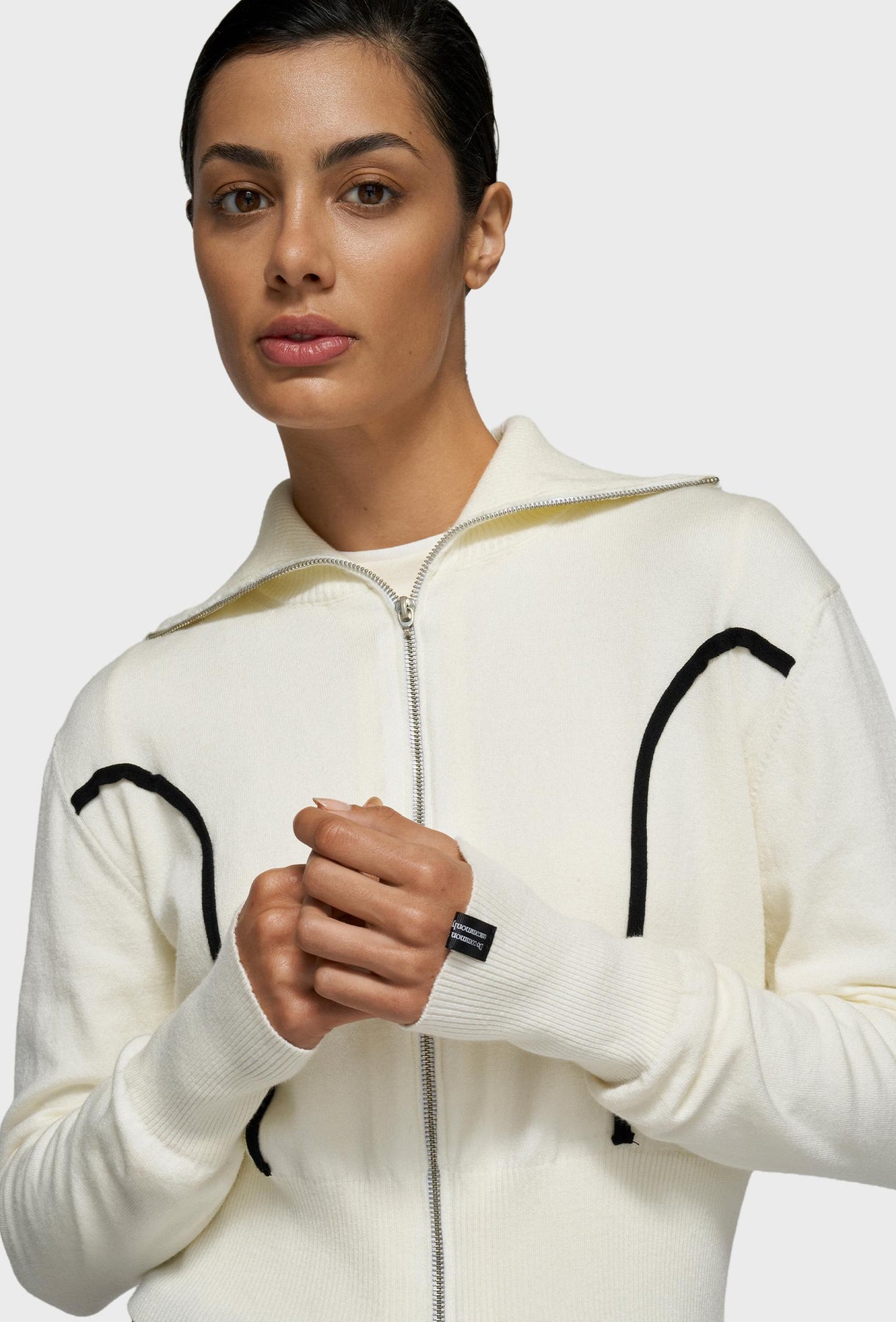 Miękki, kobiecy kardigan zapinany na suwak, wykonany z przyjemnej w dotyku dzianiny w odcieniu ecru. Model ma krótki, sportowo-elegancki krój, podkreślony szerokim, elastycznym dołem oraz długimi rękawami z otworami na kciuki. Charakterystycznym elementem są kontrastowe, czarne przeszycia biegnące wzdłuż przodu, które podkreślają sylwetkę i nadają całości nowoczesnego charakteru. Stojący kołnierz można nosić wyprostowany lub lekko rozłożony dla bardziej swobodnego efektu. Idealny do stylizacji codziennych, a także jako ciekawy akcent w sportowych zestawach.