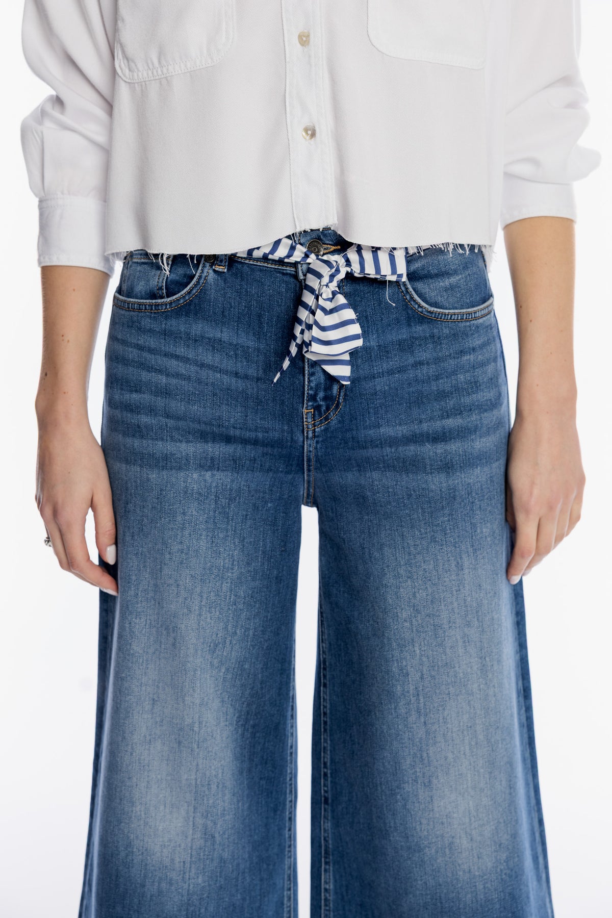 Stylowe spodnie damskie typu kuloty marki Campione, charakteryzujące się skróconą nogawką i szerokim krojem. Wykonane z niebieskiego denimu z wyraźnym efektem sprania na udach, co nadaje im swobodnego, casualowego charakteru. Pas ozdobiony jest biało-granatowym materiałowym paskiem w paski, który idealnie wpisuje się w letnią estetykę marki. Spodnie posiadają klasyczny układ pięciu kieszeni oraz zapięcie na zamek i guzik. To doskonały wybór dla kobiet poszukujących nowoczesnych form i najwyższej jakości materiałów w codziennym ubiorze.