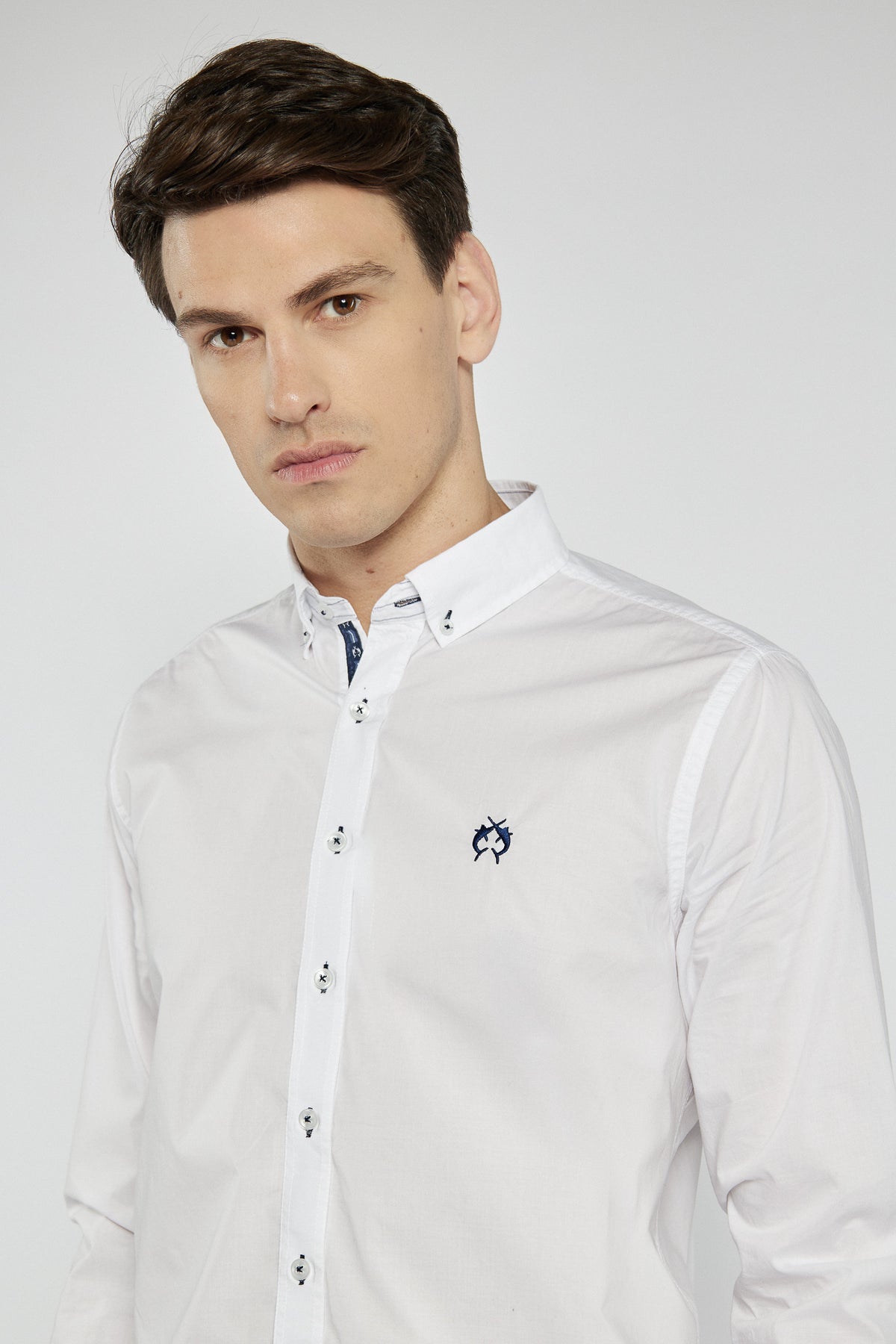 Klasyczna męska koszula Campione w fasonie Regular Fit, w ponadczasowym białym kolorze, to kwintesencja elegancji i uniwersalności. Wykonana z najwyższej jakości tkaniny, gwarantuje komfort noszenia oraz nienaganny wygląd przez cały dzień. Koszula posiada długi rękaw z mankietami na guziki, klasyczny kołnierzyk i subtelny detal w postaci wyszywanego logo na piersi, podkreślający jej markowy charakter. Idealna zarówno do stylizacji biznesowych, jak i casualowych, doskonale komponuje się z różnymi elementami garderoby.