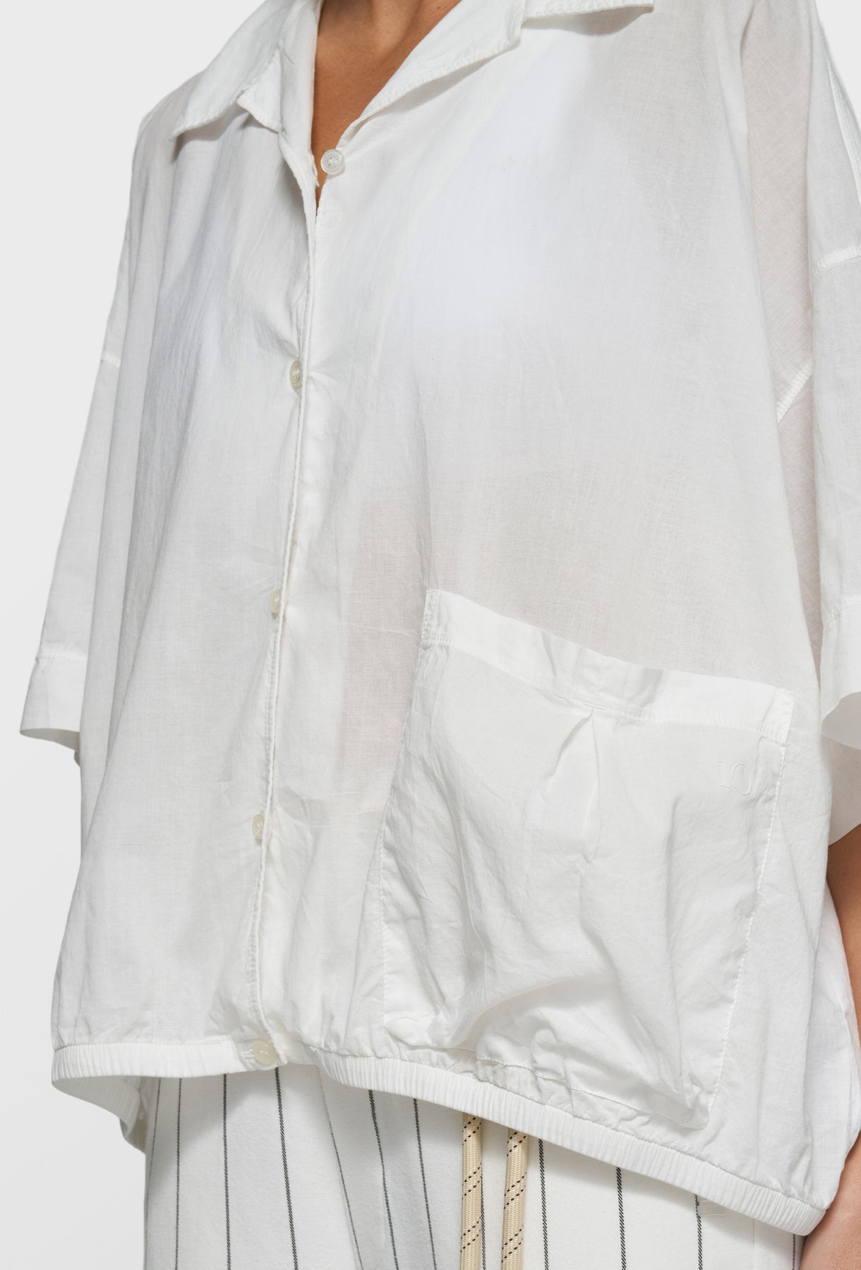 Luźna koszula o nowoczesnym, oversize’owym kroju, wykonana z lekkiej, półtransparentnej tkaniny, która zapewnia komfort i przewiewność w ciepłe dni. Model z klasycznym kołnierzykiem i krótkimi, szerokimi rękawami nadaje całości swobodny, letni charakter. Elastyczne wykończenie u dołu delikatnie podkreśla sylwetkę i pozwala na różne sposoby stylizacji — noszoną luźno lub lekko podciągniętą. Subtelny detal brandingowy z tyłu oraz praktyczna kieszeń z przodu dopełniają minimalistyczny design. Koszula doskonale sprawdzi się zarówno w komplecie z pasującymi spodniami, jak i jako samodzielny element letnich, miejskich stylizacji.