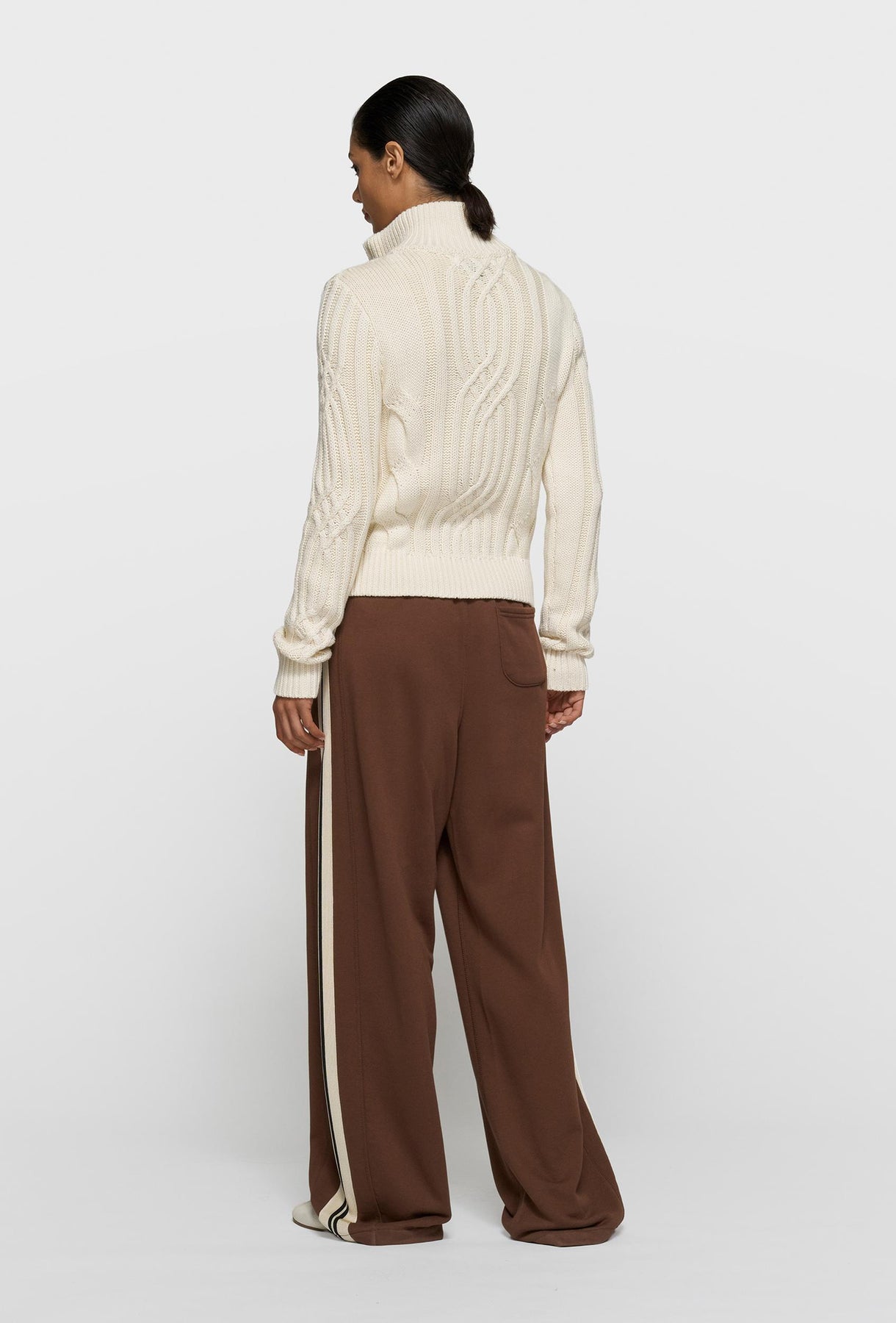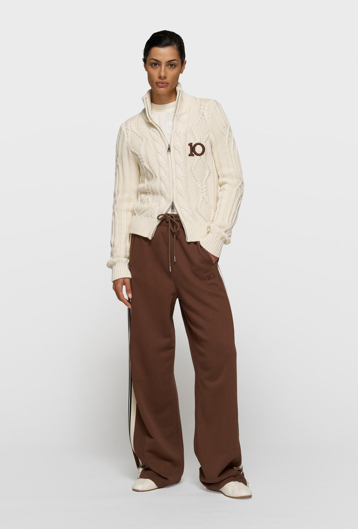 Miękki, kremowy sweter o klasycznym warkoczowym splocie, który łączy przytulność z elegancką, sportową estetyką. Model posiada wysoki kołnierz zapinany na dwustronny zamek, co pozwala na regulowanie stylu i komfortu noszenia — od rozpiętego, luźnego looku po bardziej zabudowaną formę. Na piersi umieszczono kontrastowe, brązowe logo „10”, które nadaje całości charakterystycznego akcentu. Sweter ma dopasowany, lekko skrócony krój, elastyczne ściągacze oraz efektowny, strukturalny splot o różnorodnych fakturach, podkreślających jego wysoką jakość. Idealny do łączenia z dresami, spodniami cargo, denimem lub spódnicami. Ponadczasowy element garderoby, który sprawdzi się zarówno w casualowych stylizacjach, jak i bardziej dopracowanych zestawach na chłodniejsze dni.