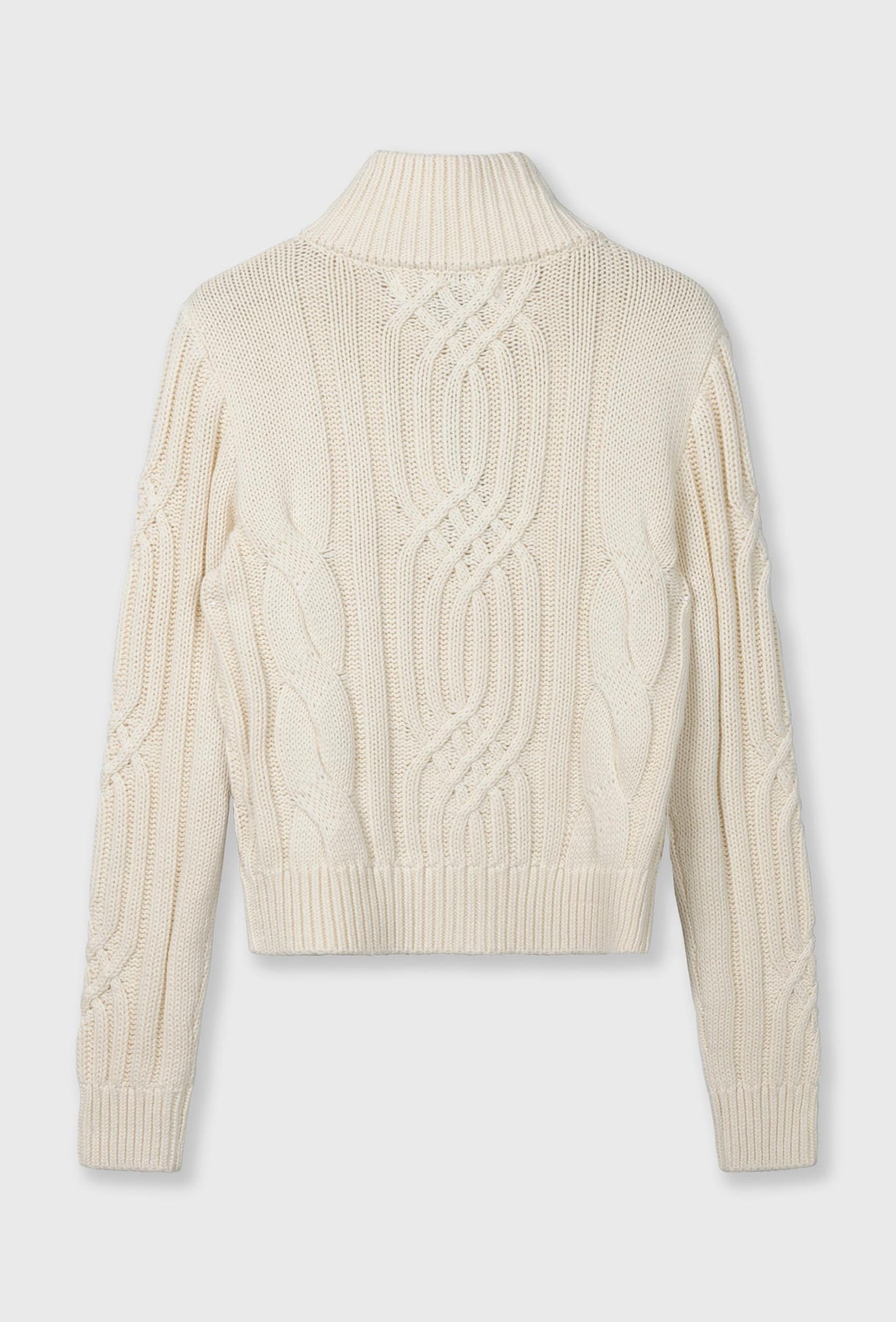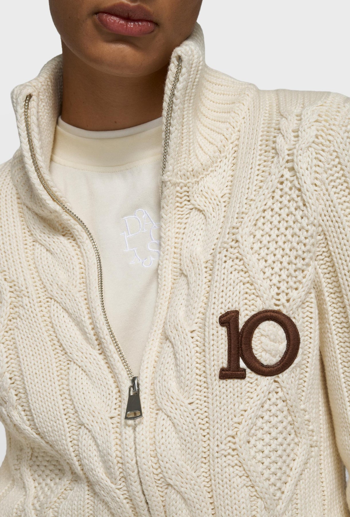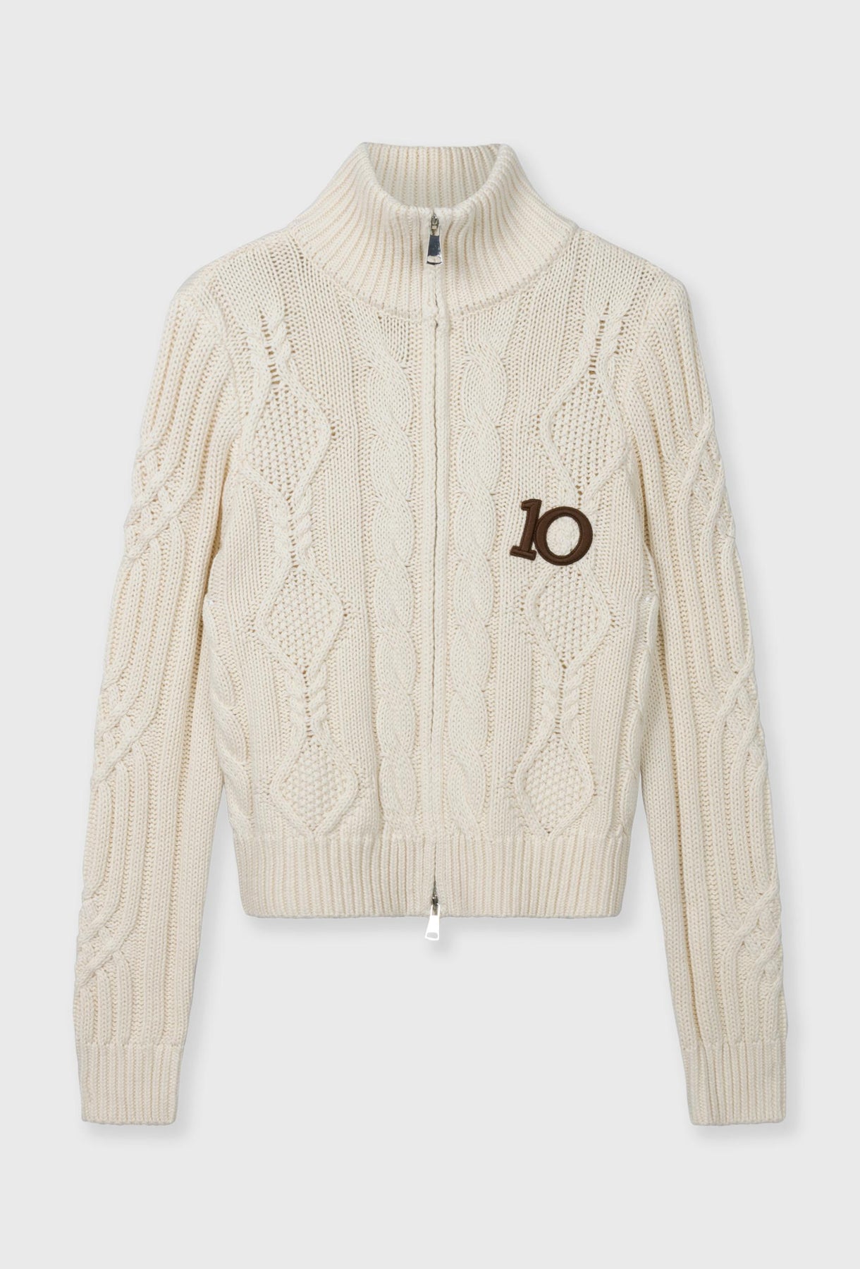 Kremowy sweter zapinany na zamek z warkoczowym splotem i logo 10