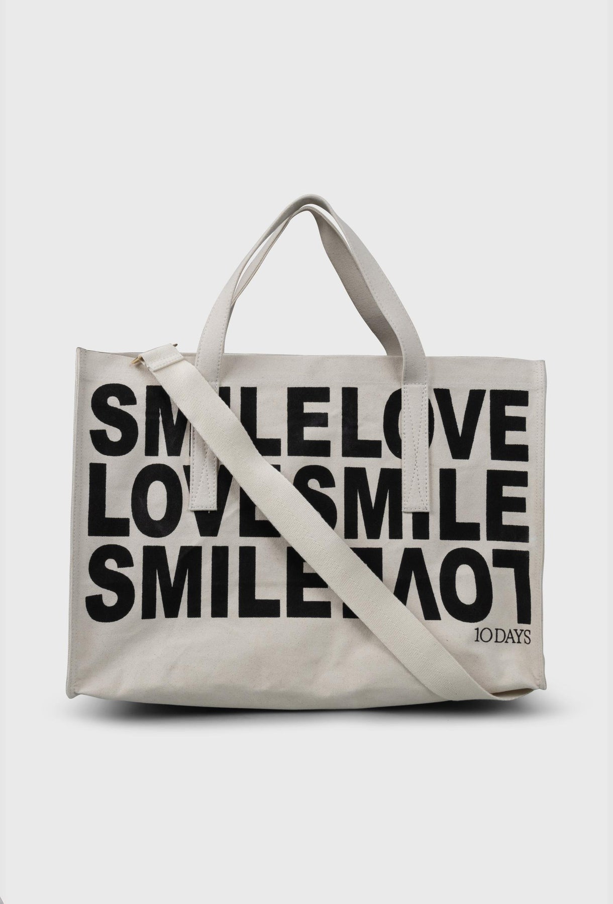 Stylowa i niezwykle pojemna torba typu shopper, która łączy w sobie surowy, minimalistyczny design z pozytywnym przesłaniem. Wykonana z wysokiej jakości, grubego płótna w kolorze złamanej bieli, idealnie sprawdzi się zarówno podczas codziennych zakupów, jak i jako modny dodatek do miejskich stylizacji. Front torby zdobi duży, graficzny nadruk z powtarzającymi się słowami „SMILE” oraz „LOVE”, nadając jej nowoczesny, streetwearowy charakter. Druga strona torby posiada subtelne, mniejsze logo marki „10DAYS” wraz z hasłem przewodnim, co pozwala na zmianę wyglądu w zależności od nastroju. Szeroki krój typu „tote” pomieści wszystkie niezbędne przedmioty – od laptopa po zakupy czy akcesoria plażowe. Solidne, szerokie uchwyty wykonane z tego samego materiału zapewniają wygodę noszenia torby zarówno w dłoni, jak i na ramieniu. Wytrzymała tkanina płócienna o widocznym splocie gwarantuje trwałość i ekologiczny styl.