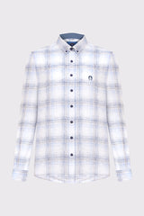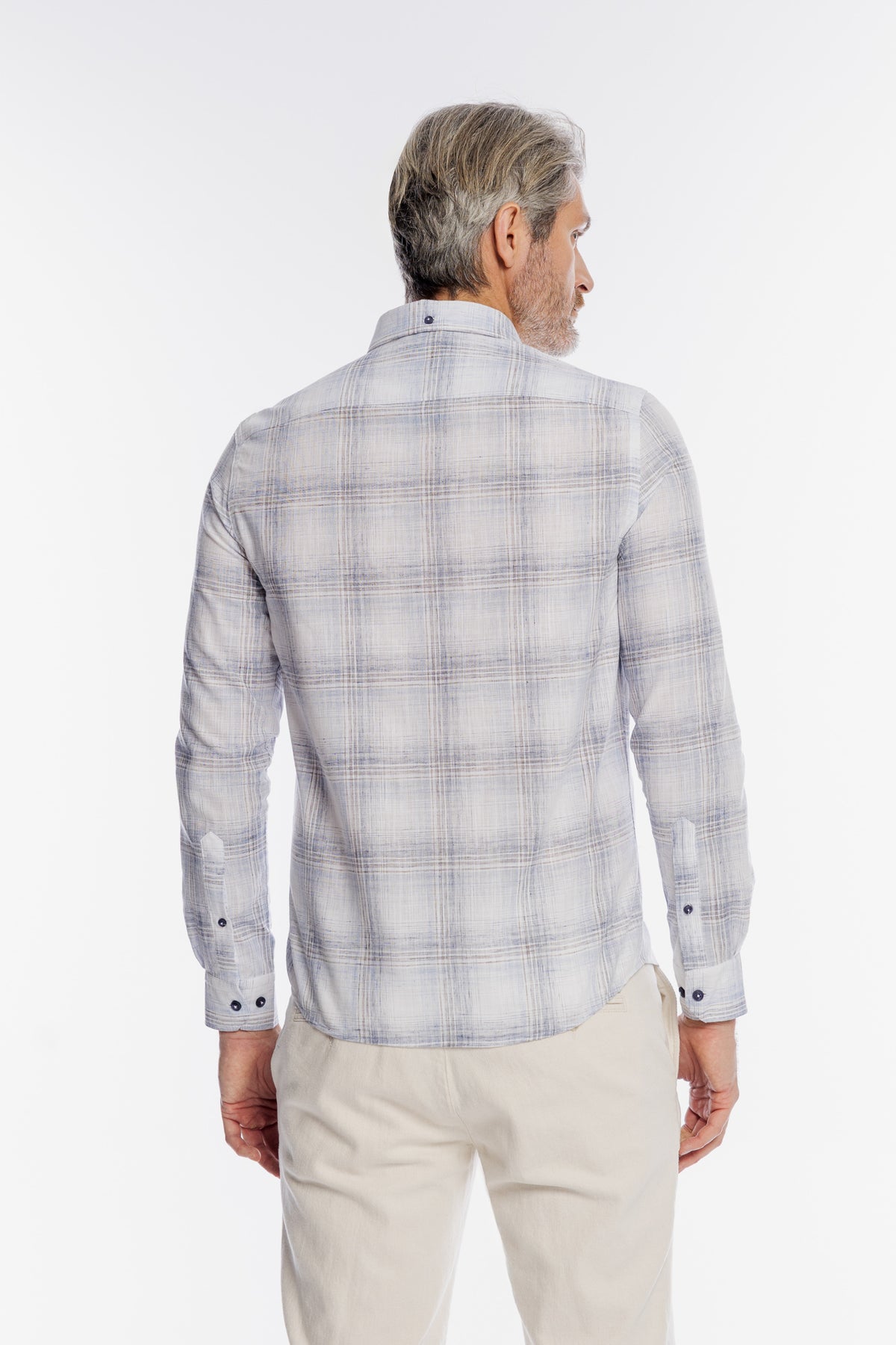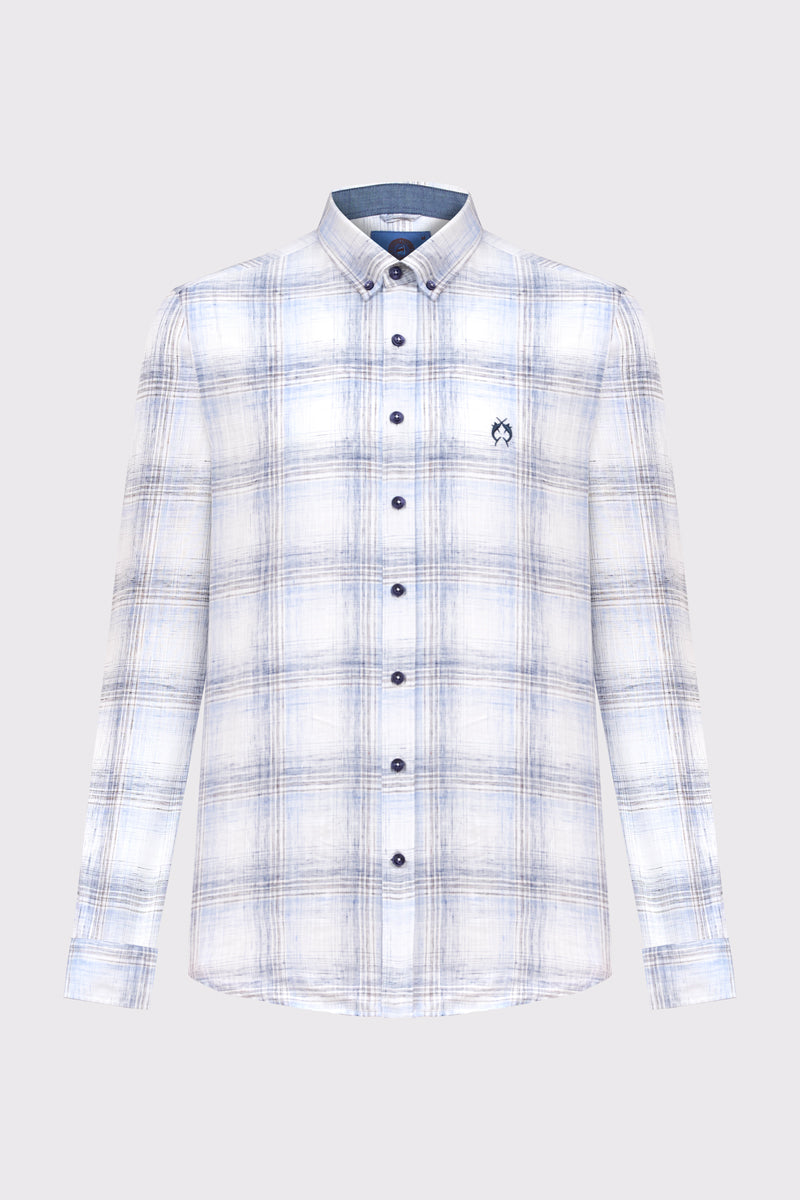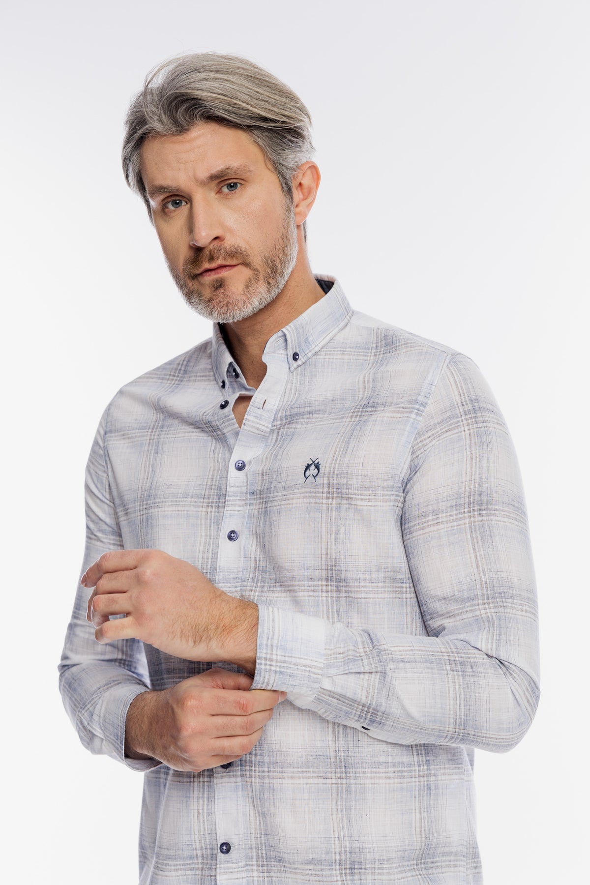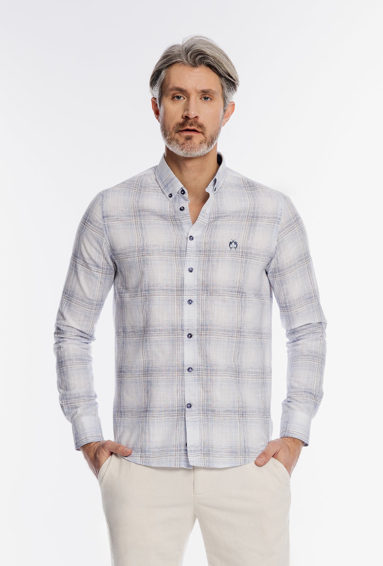 Lekka męska koszula Campione wykonana z wysokiej jakości mieszanki lnu i bawełny, idealna na sezon letni. Model charakteryzuje się subtelnym wzorem kraty w odcieniach błękitu i szarości, co nadaje mu świeży, marynistyczny wygląd. Koszula posiada klasyczny kołnierzyk typu button-down, długie rękawy z regulowanymi mankietami oraz elegancką haftowaną aplikację z logo marki na piersi. Przewiewna struktura materiału zapewnia wyjątkowy komfort noszenia nawet w upalne dni, a stonowana kolorystyka sprawia, że produkt doskonale pasuje zarówno do jasnych szortów, jak i klasycznych spodni typu chino.