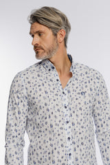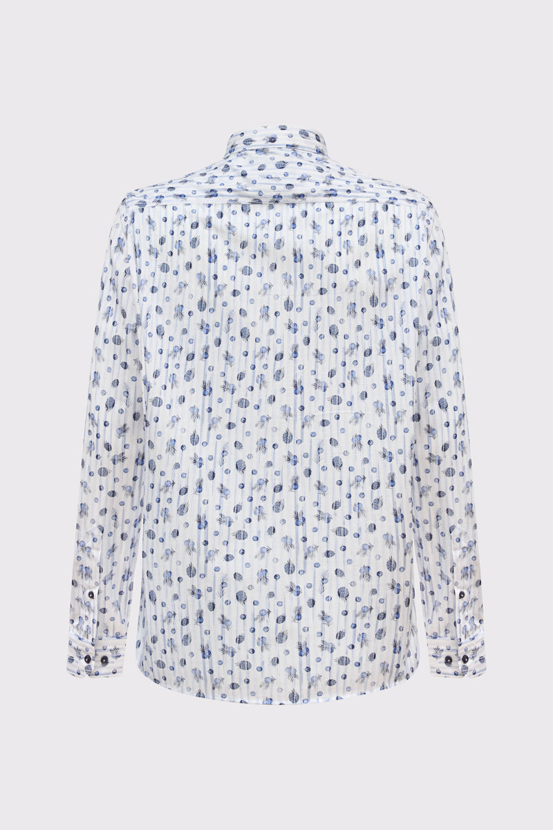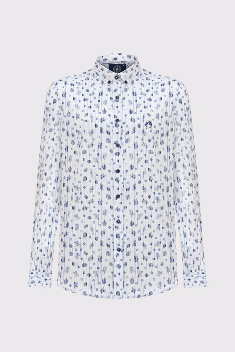 Biała koszula męska z delikatnym, owocowym printem w odcieniach niebieskiego to stylowa propozycja dla miłośników oryginalnych detali. Wykonana z lekkiej, przewiewnej tkaniny, zapewnia komfort noszenia i swobodę ruchów przez cały dzień. Model posiada kołnierzyk typu button-down oraz zapięcie na kontrastowe guziki, które podkreślają dopracowany charakter koszuli. Subtelne logo na piersi dodaje całości markowego wyrazu. Długie rękawy zakończone mankietami zapinanymi na guziki dopełniają klasyczny fason. Regularny krój sprawia, że koszula świetnie układa się na sylwetce i doskonale sprawdzi się zarówno w stylizacjach smart casual, jak i w letnich, bardziej swobodnych zestawieniach.