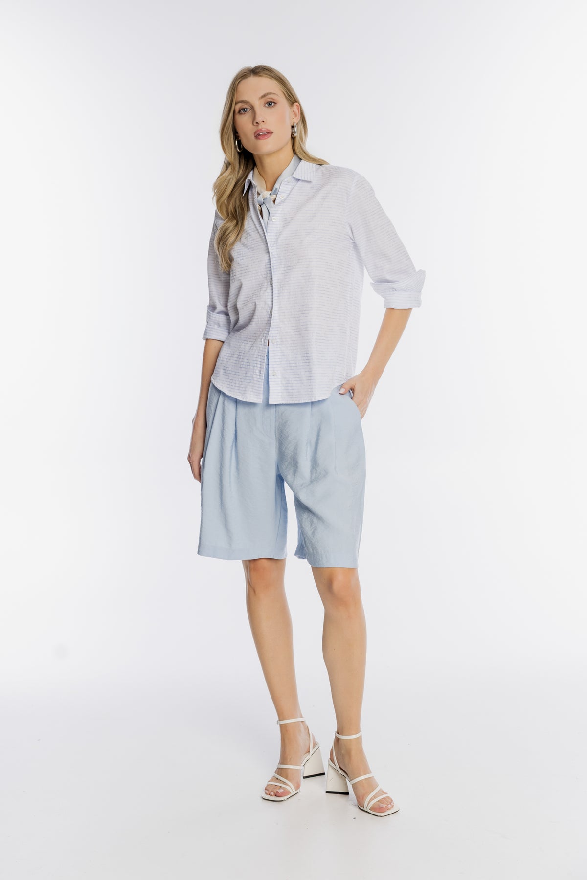 Elegancka koszula damska Campione w subtelnym, błękitnym kolorze z drobnym, poziomym wzorem prążków. Wykonana z przewiewnej tkaniny o delikatnej strukturze, zapewnia wysoki komfort noszenia nawet w cieplejsze dni. Model charakteryzuje się klasycznym krojem z zapięciem na guziki, tradycyjnym kołnierzykiem oraz długimi rękawami z możliwością stylowego podwinięcia. Zaokrąglony dół koszuli oraz kontrafałda na plecach gwarantują swobodę ruchów i doskonałe ułożenie na sylwetce. Uniwersalny design sprawia, że koszula idealnie komponuje się zarówno z eleganckimi szortami, jak i casualowymi jeansami.