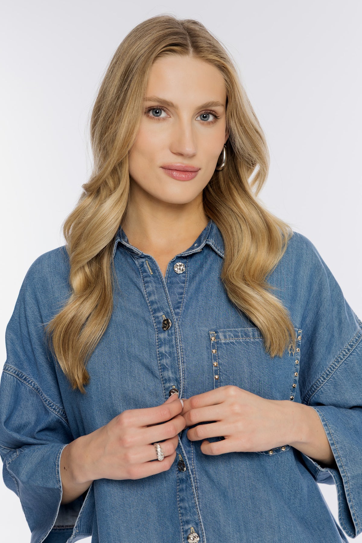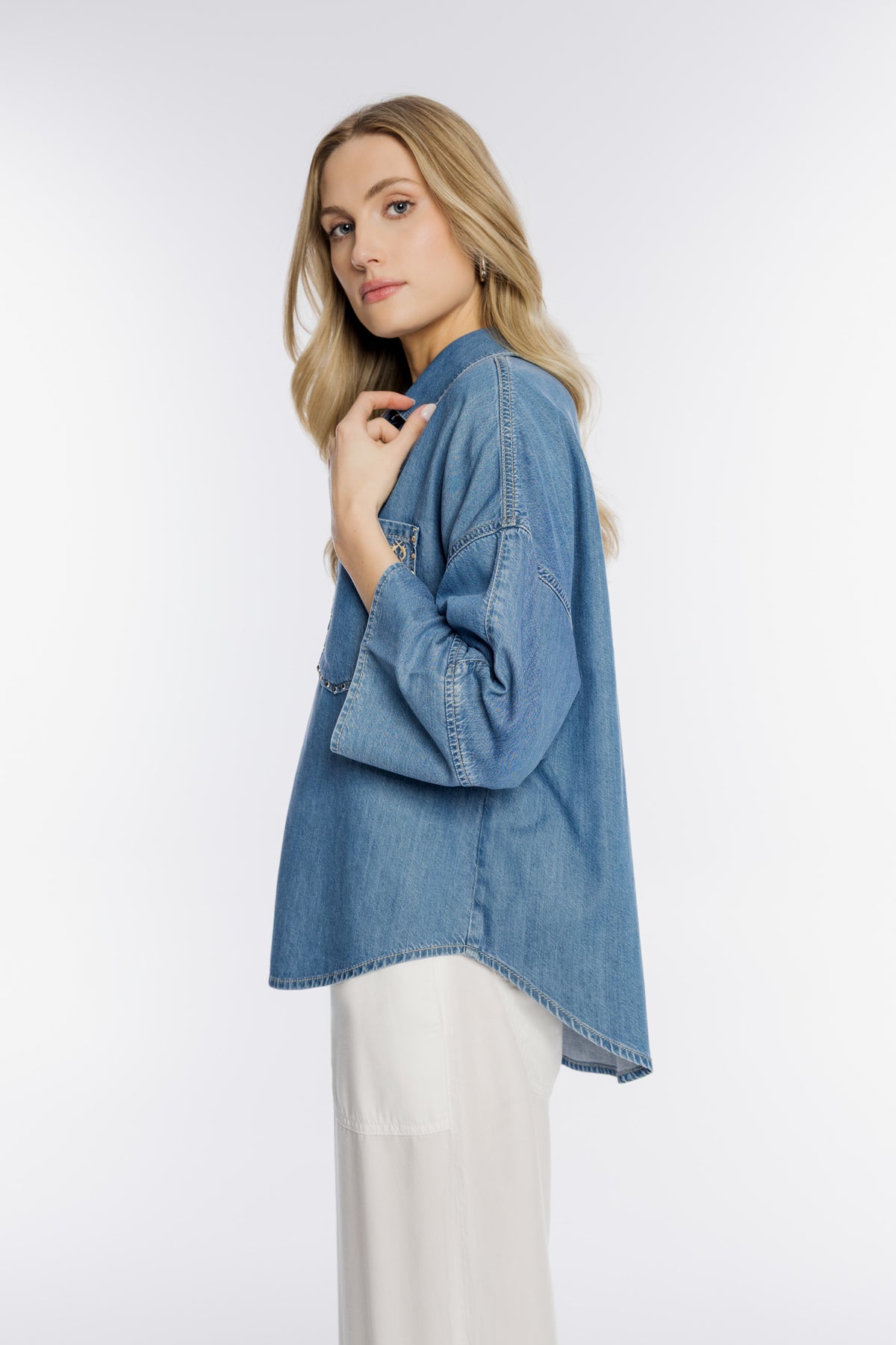 Stylowa damska koszula wykonana z wysokiej jakości denimu w klasycznym odcieniu niebieskiego. Model wyróżnia się luźnym krojem z obniżoną linią ramion oraz rękawami o długości 3/4 zakończonymi szerokim przeszyciem. Praktyczna kieszeń na piersi została ozdobiona subtelnymi złotymi dżetami oraz haftowanym logo marki Campione, co nadaje całości ekskluzywnego charakteru. Koszula zapinana jest na ozdobne guziki i posiada zaokrąglony dół, dzięki czemu świetnie układa się na sylwetce. To idealna propozycja do casualowych stylizacji z białymi spodniami lub klasycznymi jeansami.