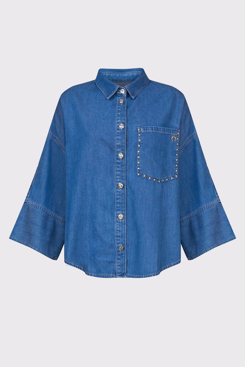 Jeansowa koszula damska z ozdobną kieszenią i dżetami