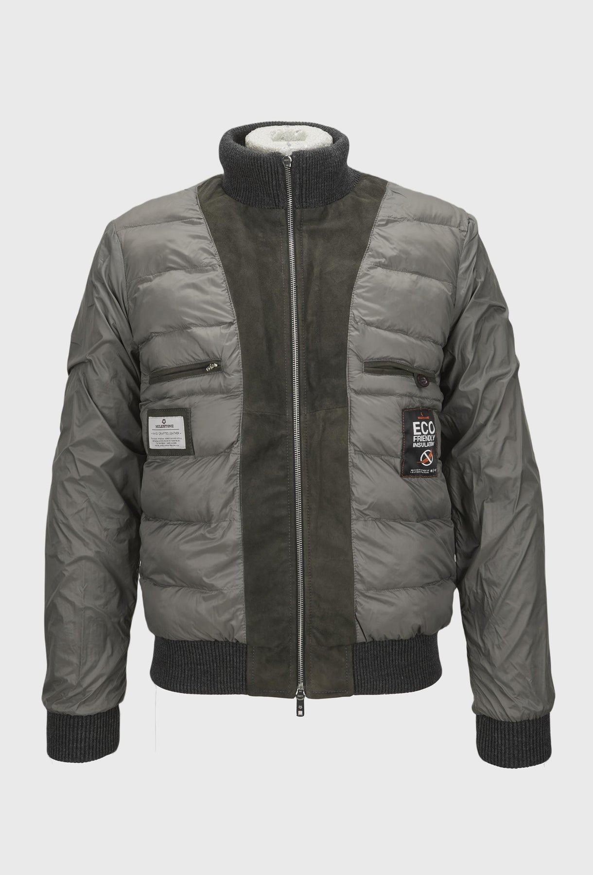 Elegancka, grafitowa kurtka męska, która łączy w sobie sportowy i casualowy styl. Korpus kurtki jest wykonany z gładkiej skóry, natomiast rękawy oraz stójka są zrobione z miękkiej, prążkowanej dzianiny, która zapewnia komfort i ciepło. Model jest zapinany na zamek, a dwie kieszenie po bokach zwiększają jej funkcjonalność. To idealne połączenie klasyki i nowoczesnego stylu.