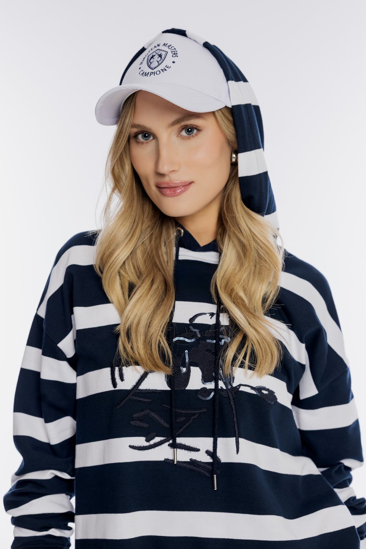 Komfortowa damska bluza z kapturem typu oversize, wykonana z grubszego materiału w szerokie granatowo-białe pasy. Model posiada zintegrowany kaptur z regulacją za pomocą troczków oraz szerokie ściągacze przy rękawach i na dole bluzy. Przód ozdobiony jest dużą, ciemną grafiką z motywem florystycznym i subtelnym połyskiem, co nadaje jej nowoczesnego stylu. Luźny krój zapewnia pełną swobodę ruchów, czyniąc ją idealnym wyborem na chłodniejsze, wakacyjne wieczory.