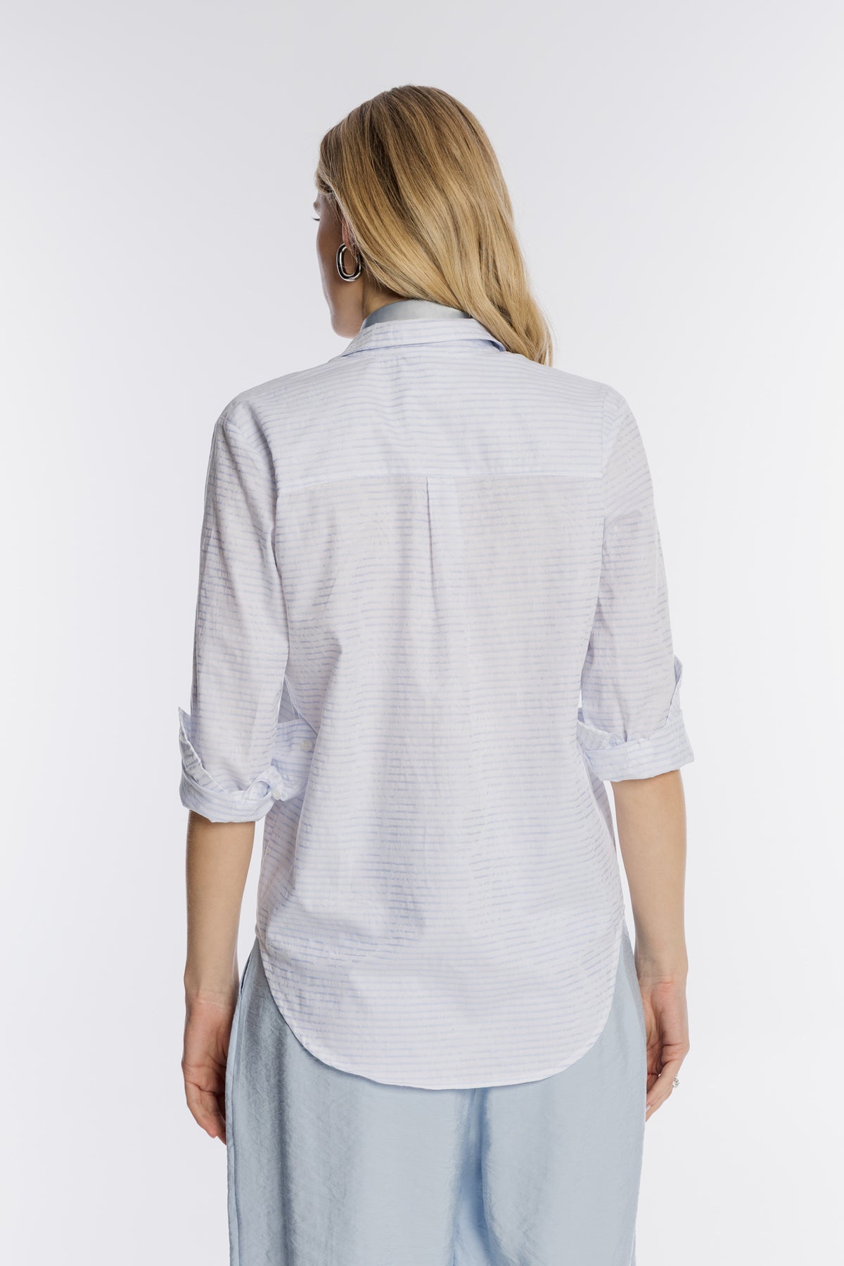 Elegancka koszula damska Campione w subtelnym, błękitnym kolorze z drobnym, poziomym wzorem prążków. Wykonana z przewiewnej tkaniny o delikatnej strukturze, zapewnia wysoki komfort noszenia nawet w cieplejsze dni. Model charakteryzuje się klasycznym krojem z zapięciem na guziki, tradycyjnym kołnierzykiem oraz długimi rękawami z możliwością stylowego podwinięcia. Zaokrąglony dół koszuli oraz kontrafałda na plecach gwarantują swobodę ruchów i doskonałe ułożenie na sylwetce. Uniwersalny design sprawia, że koszula idealnie komponuje się zarówno z eleganckimi szortami, jak i casualowymi jeansami.