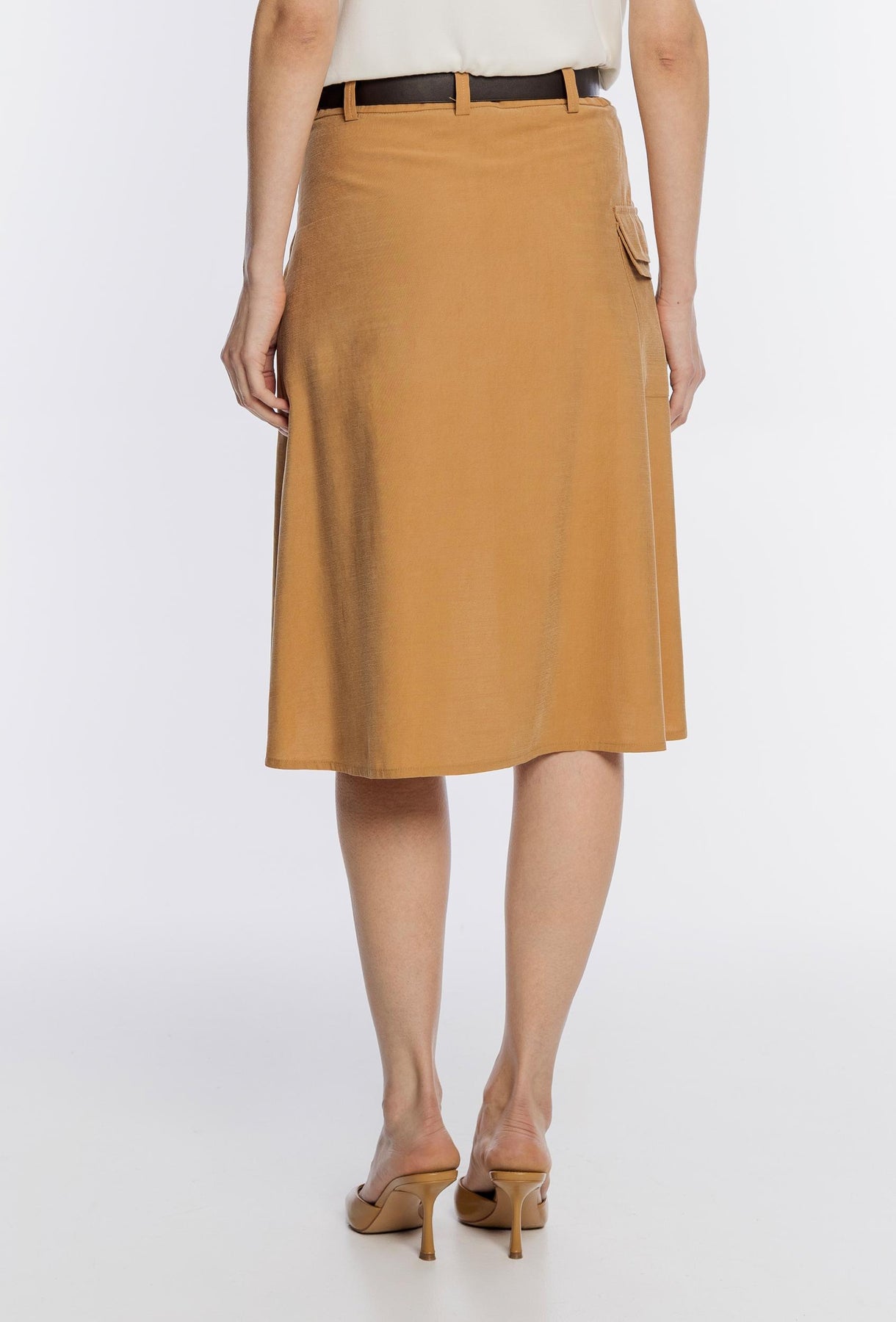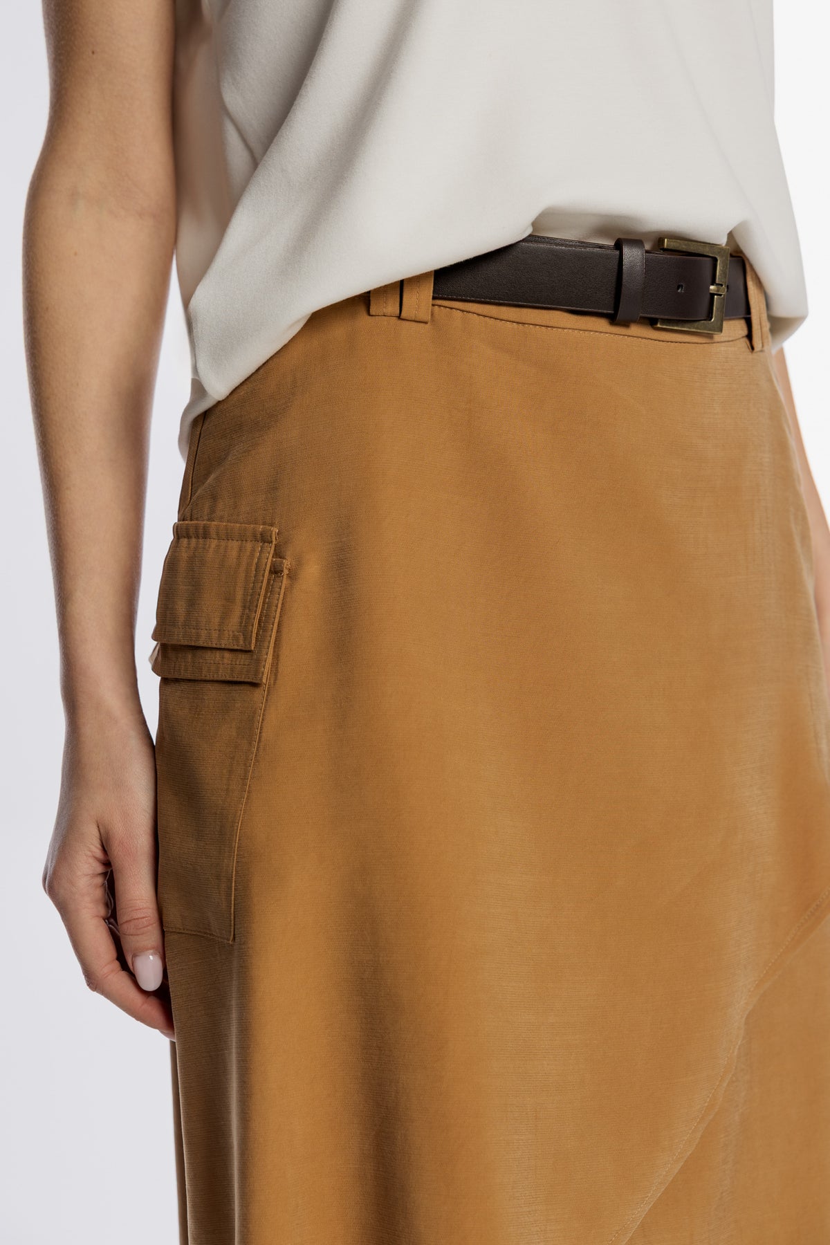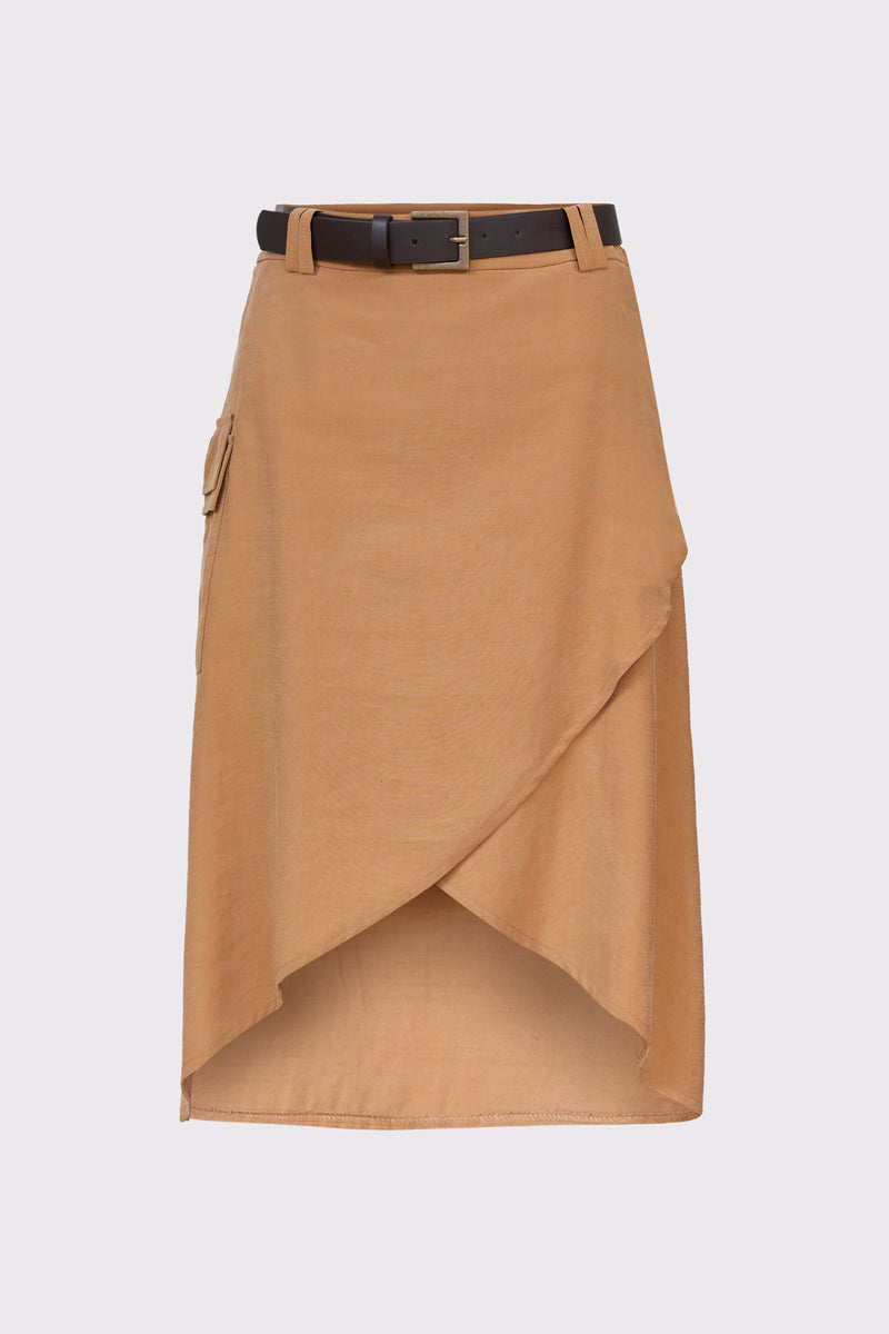 Stylowa spódnica damska o długości midi, wykonana z lekkiego materiału w ciepłym odcieniu brązu. Model charakteryzuje się nowoczesnym, asymetrycznym krojem kopertowym, który nadaje sylwetce lekkości i dynamiki. Spódnica wyposażona jest w ciemnobrązowy pasek z klasyczną klamrą oraz funkcjonalną kieszeń cargo z patką umieszczoną na boku, co przełamuje elegancki fason nutą stylu utility. Idealna zarówno do codziennych, jak i bardziej oficjalnych zestawień, zapewniając wyjątkowy wygląd i wygodę przez cały dzień.