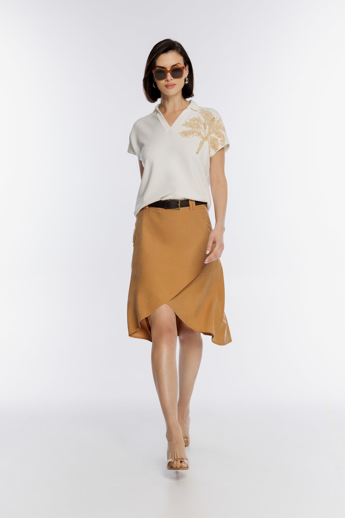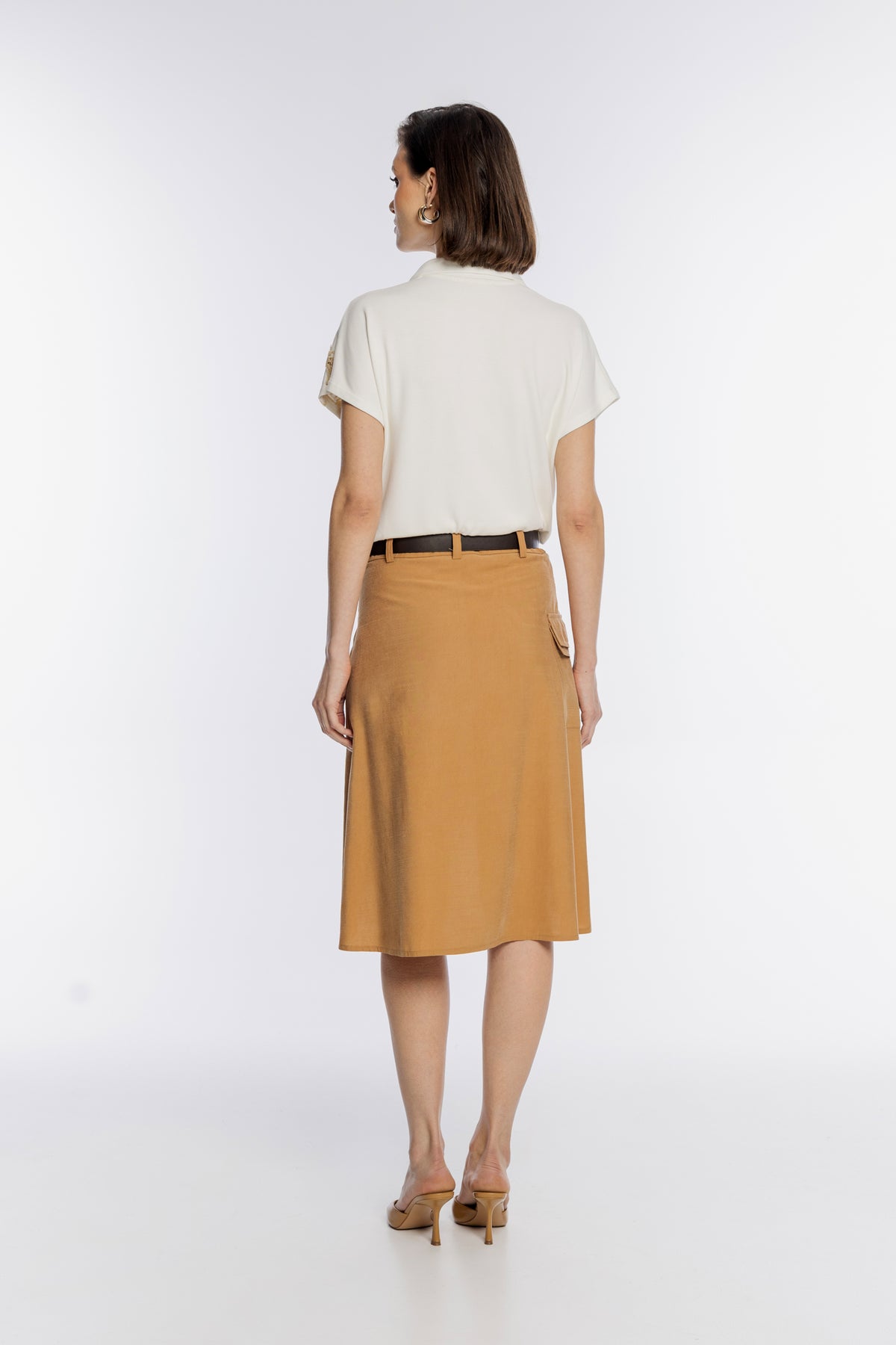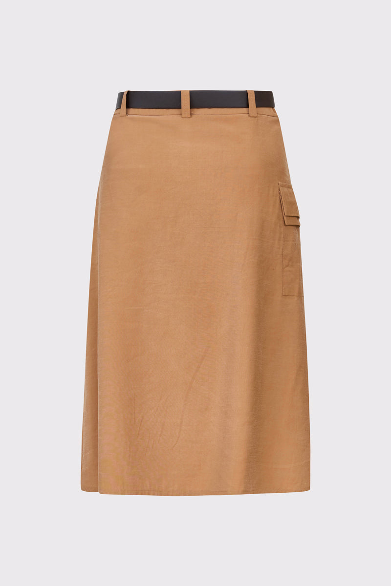 Stylowa spódnica damska o długości midi, wykonana z lekkiego materiału w ciepłym odcieniu brązu. Model charakteryzuje się nowoczesnym, asymetrycznym krojem kopertowym, który nadaje sylwetce lekkości i dynamiki. Spódnica wyposażona jest w ciemnobrązowy pasek z klasyczną klamrą oraz funkcjonalną kieszeń cargo z patką umieszczoną na boku, co przełamuje elegancki fason nutą stylu utility. Idealna zarówno do codziennych, jak i bardziej oficjalnych zestawień, zapewniając wyjątkowy wygląd i wygodę przez cały dzień.