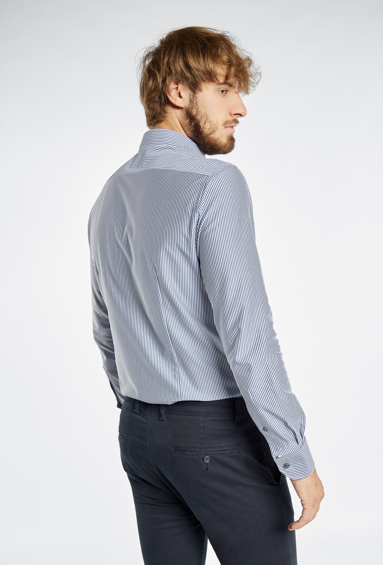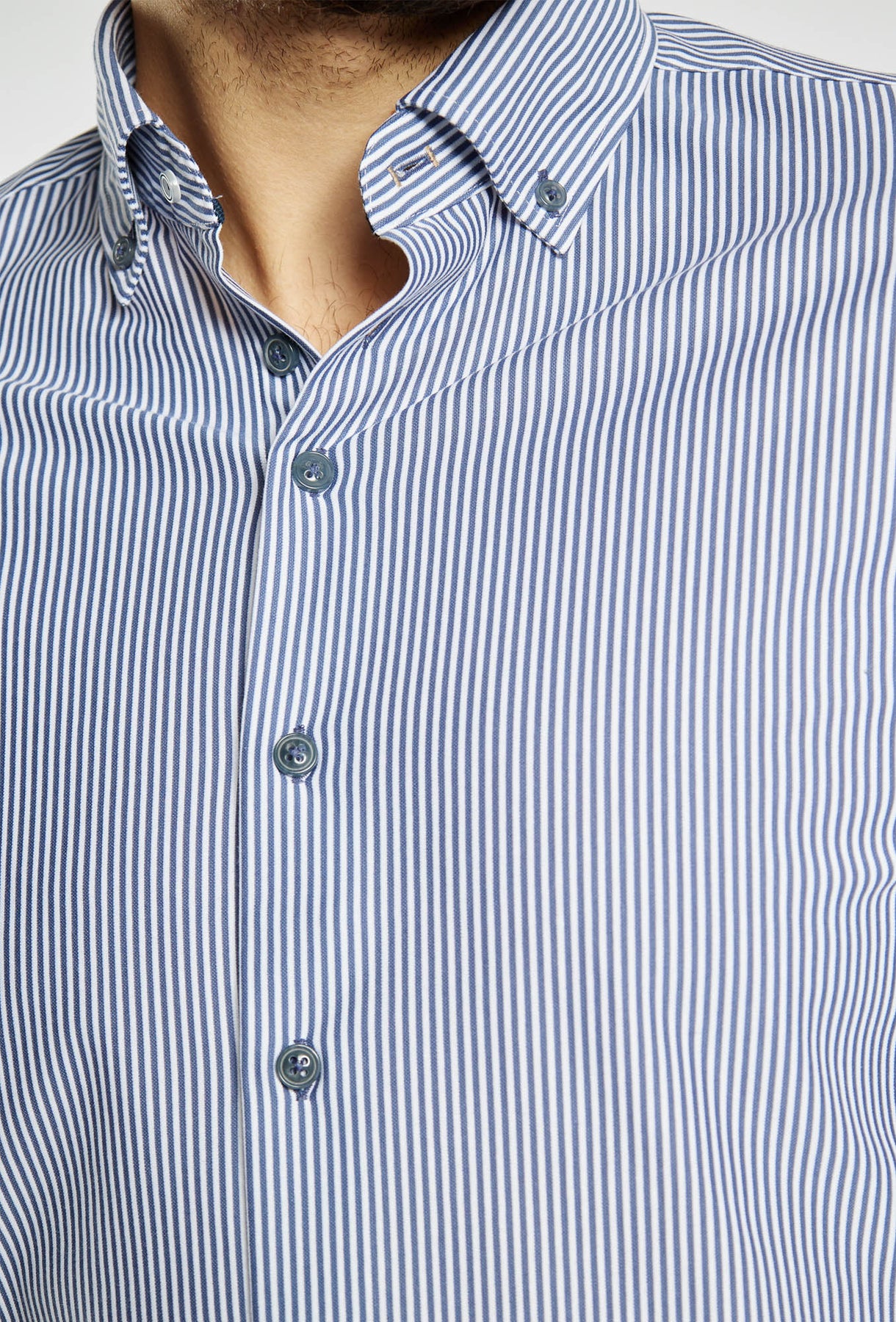 Klasyczna koszula męska o dopasowanym kroju, wykonana z wysokiej jakości bawełnianej tkaniny w drobny, pionowy prążek w odcieniach bieli i granatu. Dzięki subtelnemu wzorowi i eleganckiemu wykończeniu stanowi idealny wybór zarówno do stylizacji biznesowych, jak i casualowych. Model posiada kołnierzyk typu button-down, który utrzymuje kształt nawet po długim noszeniu, oraz długie rękawy zakończone mankietami zapinanymi na guziki. Gładka listwa guzikowa i precyzyjne przeszycia podkreślają staranne wykonanie koszuli. Uniwersalny fason świetnie komponuje się z chinosami, jeansami czy marynarką — tworząc stylowy, ponadczasowy zestaw.