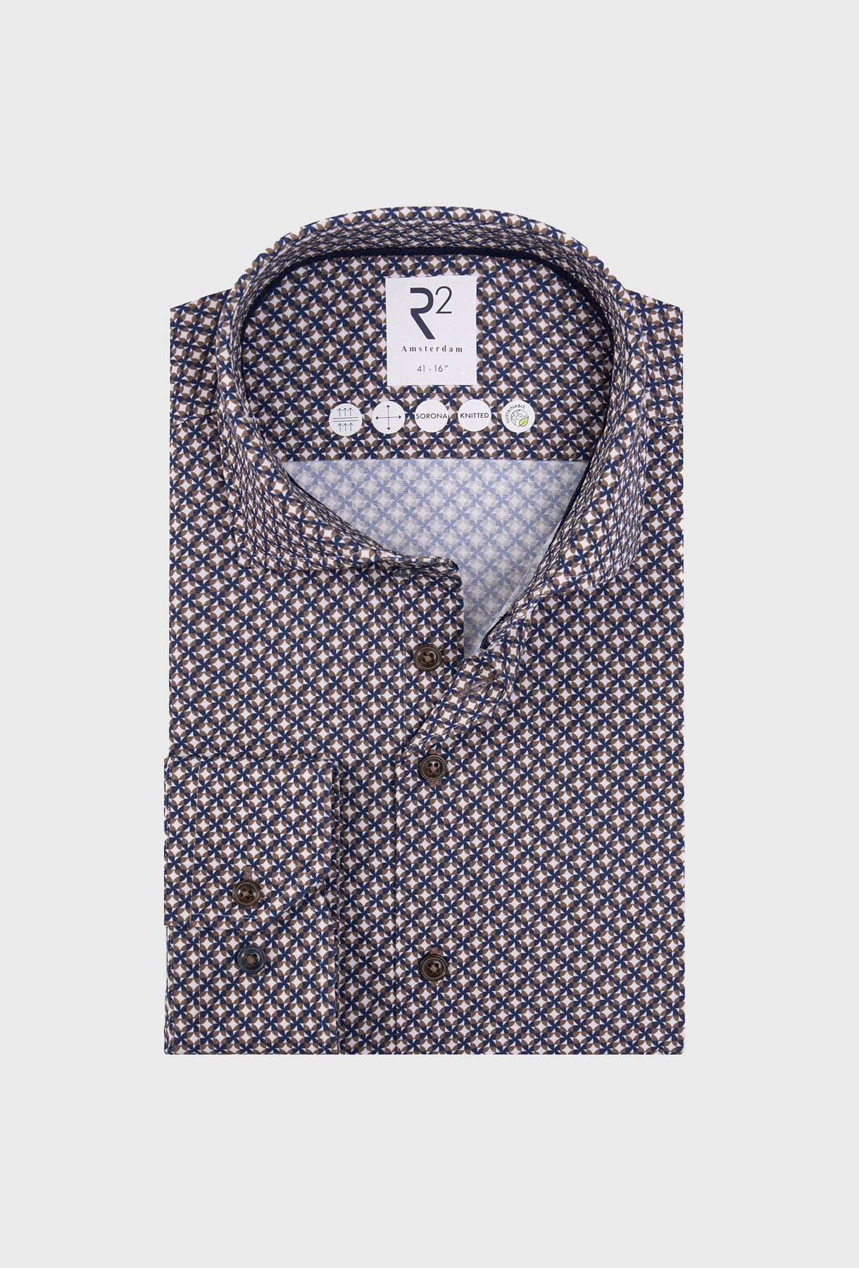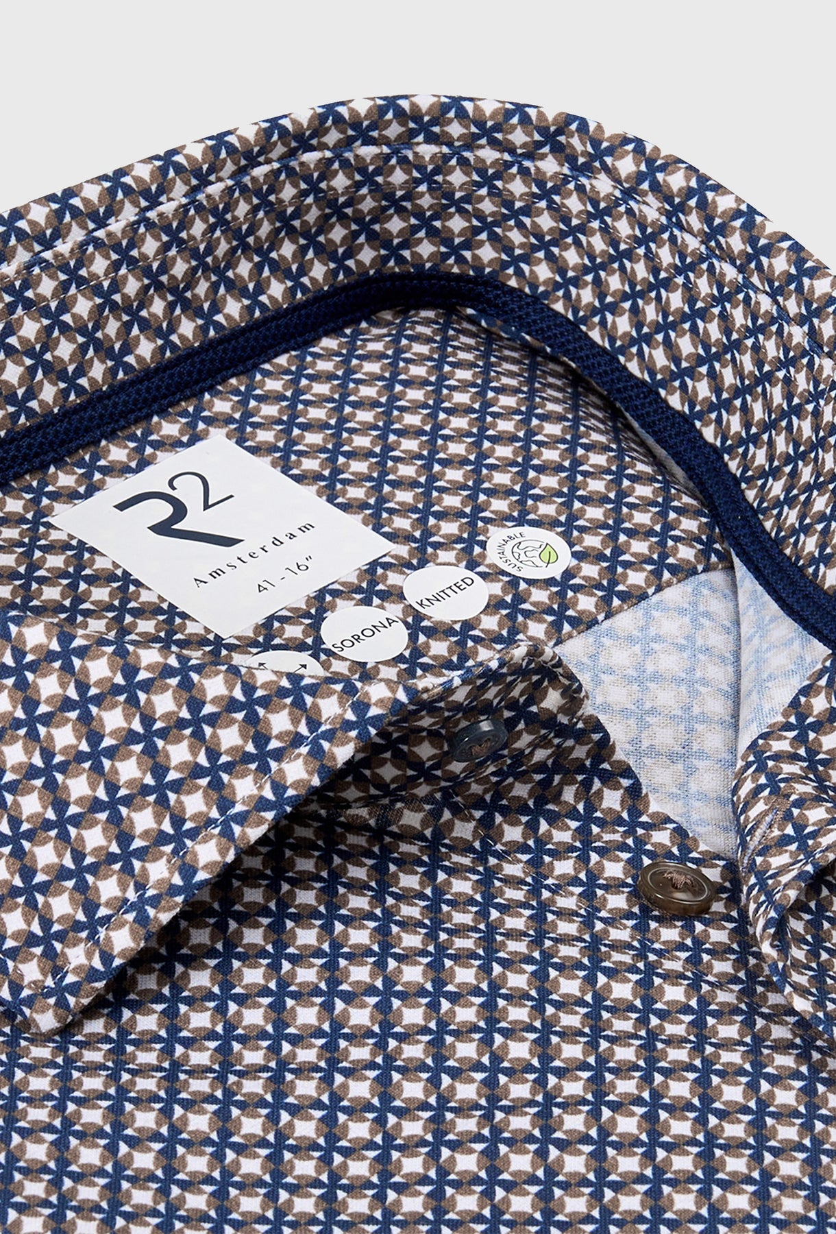 Wyrazista koszula męska o unikalnym geometrycznym wzorze w tonacji granatu, brązu i bieli. Wykonana z elastycznej, dzianinowej tkaniny typu knitted, która zapewnia wyjątkowy komfort noszenia, lekkość oraz idealne dopasowanie do sylwetki. Model wyróżnia się kołnierzykiem z delikatnym kontrastowym wykończeniem, brązowymi guzikami i dopracowanymi detalami charakterystycznymi dla marki R2 Amsterdam. Tkanina została wykonana z włókien Sorona®, które są przyjazne dla środowiska, trwałe i odporne na zagniecenia. Ta koszula doskonale łączy elegancję z nowoczesnym stylem — sprawdzi się zarówno w casualowych stylizacjach z jeansami, jak i w smart casualowym zestawie z marynarką.